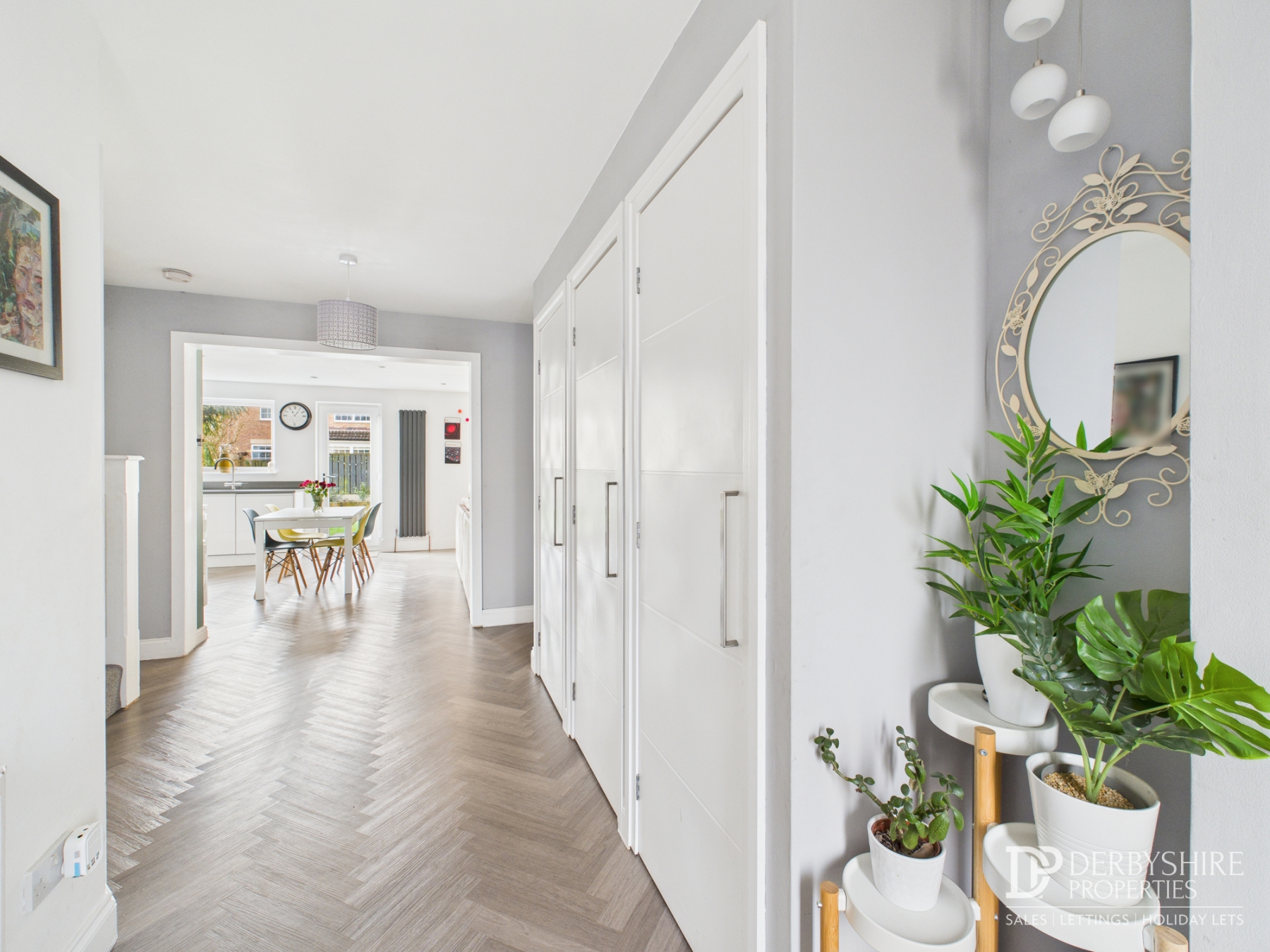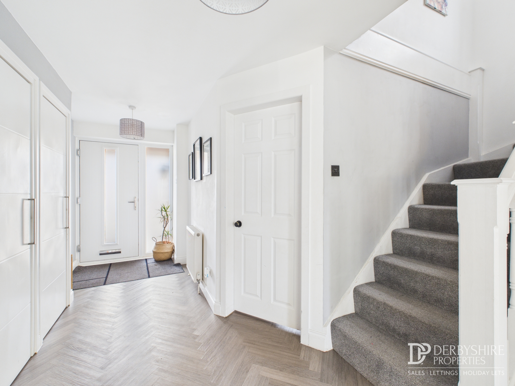 Entered via a composite front door with adjoining obscured side panel into a bright and welcoming reception space. Beautiful LVT flooring runs throughout the ground floor, complemented by a carpeted staircase to the first floor. Useful floor-to-ceiling storage cupboards provide ideal coat and boot storage.