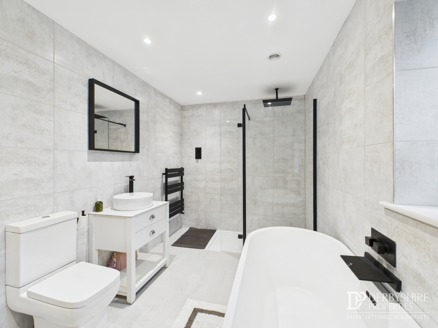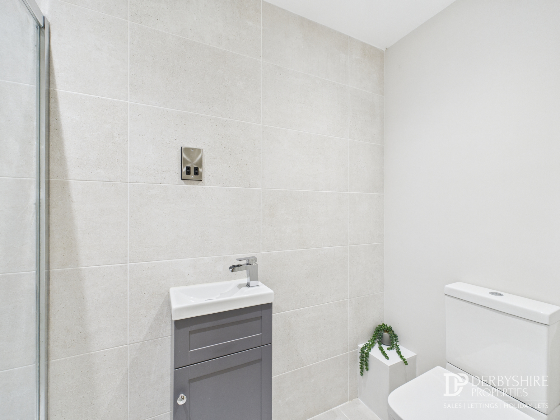 WC, slimline vanity unit, walk-in shower with rainfall head, fully tiled walls and floor, shaver point, spotlights and extractor fan.