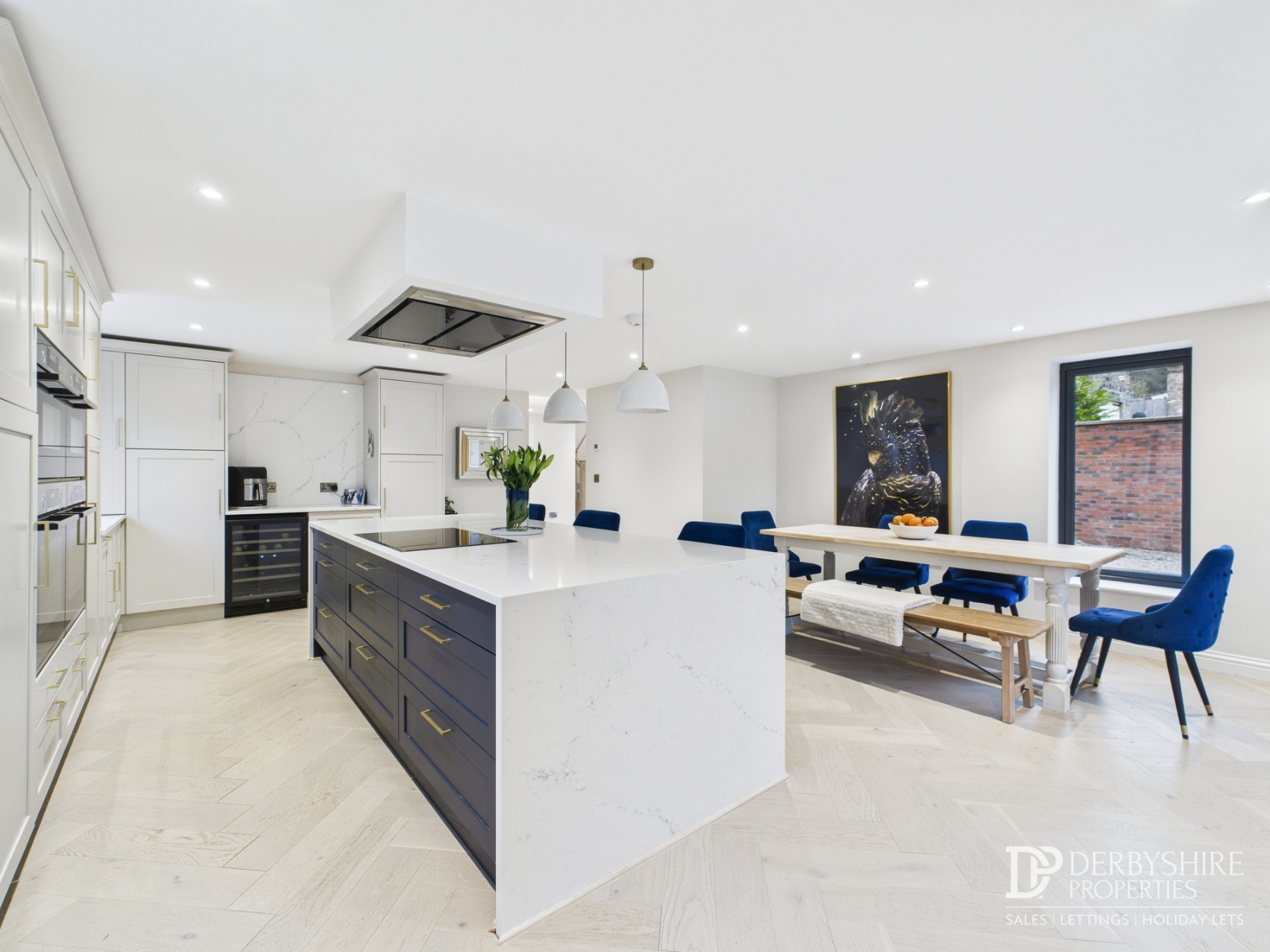 A striking marble island forms the centrepiece of the room with feature pendant lighting above. Further benefits include a Belfast sink with mixer tap, engineered oak flooring with underfloor heating, spotlights throughout, side elevation windows and a floor-to-ceiling picture window within the dining area.