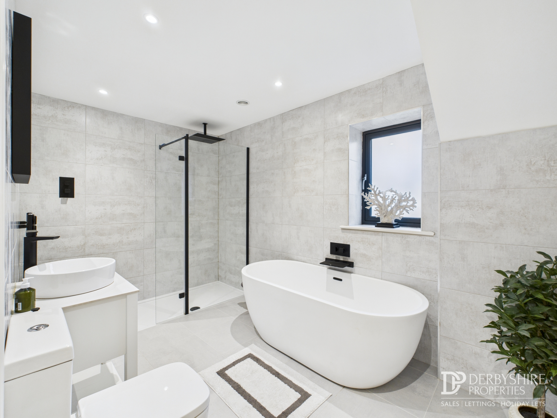 A superbly appointed bathroom comprising WC, vanity unit with circular basin and waterfall tap, large walk-in shower with ceiling-mounted rainfall head, and a freestanding oval bath with floor-mounted taps. Fully tiled walls and floor, heated towel rail, spotlights and extractor fan.