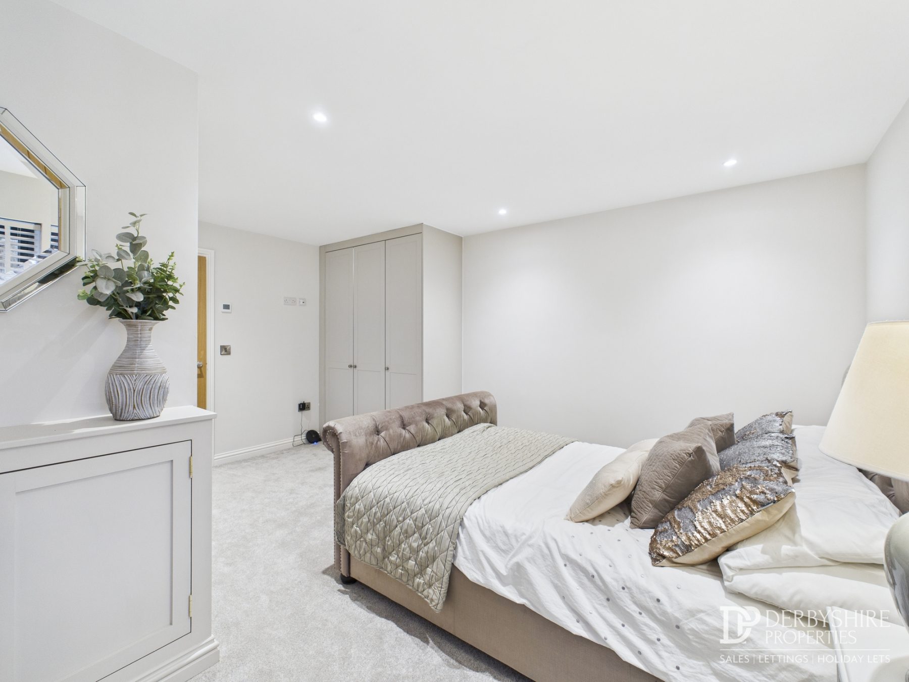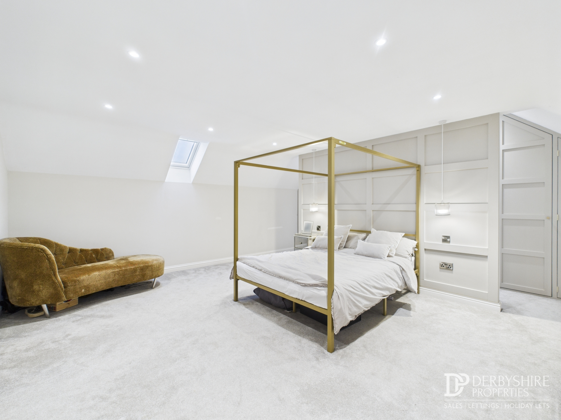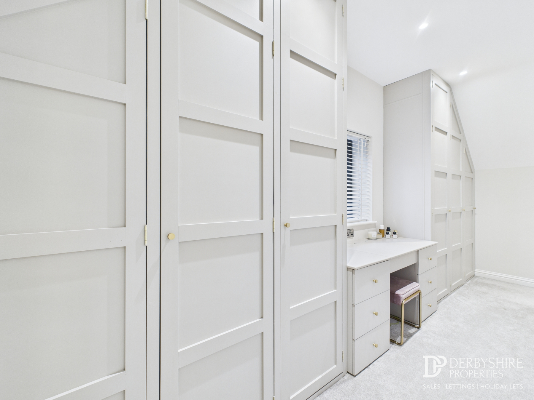 A beautifully styled and spacious bedroom with windows to both front and rear elevations, ceiling spotlights and a feature panelled wall with integrated lighting. A hidden dressing area provides fitted wardrobes and dressing table.