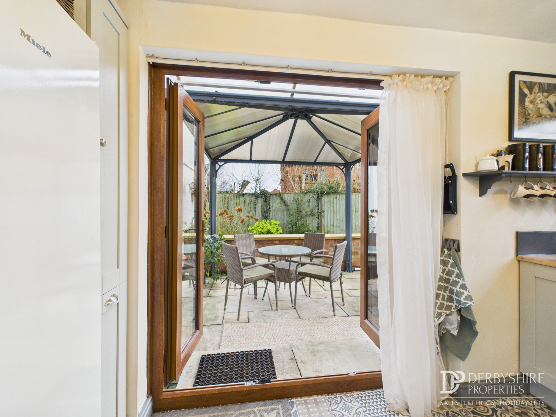 Recently remodelled and refitted, the kitchen comprises a range of shaker-style wall and base units incorporating a one-and-a-half bowl stainless steel sink with mixer tap and tiled splashbacks. Appliances include an integrated gas hob, electric oven, and dishwasher, with space for a fridge freezer. Vinyl cushion flooring, extractor fan, window, back door and triple fold glazed doors leading to a covered outdoor eating area.