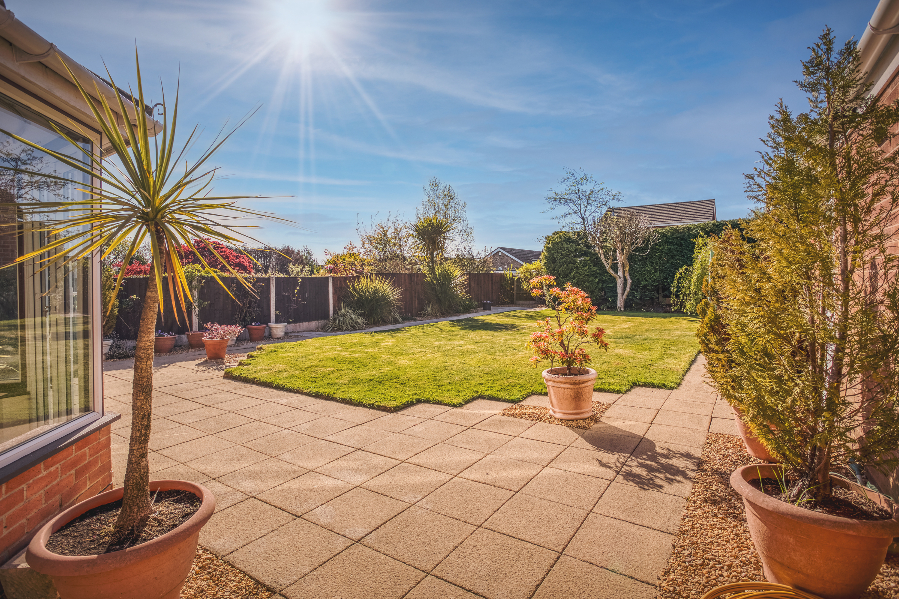 The beautifully landscaped rear garden offers a full width paved patio, large lawn, stocked flowerbeds and borders all enclosed by timber fence boundaries and additional conifer screening to the rear elevation. Outside tap, security lighting and side access pathways.