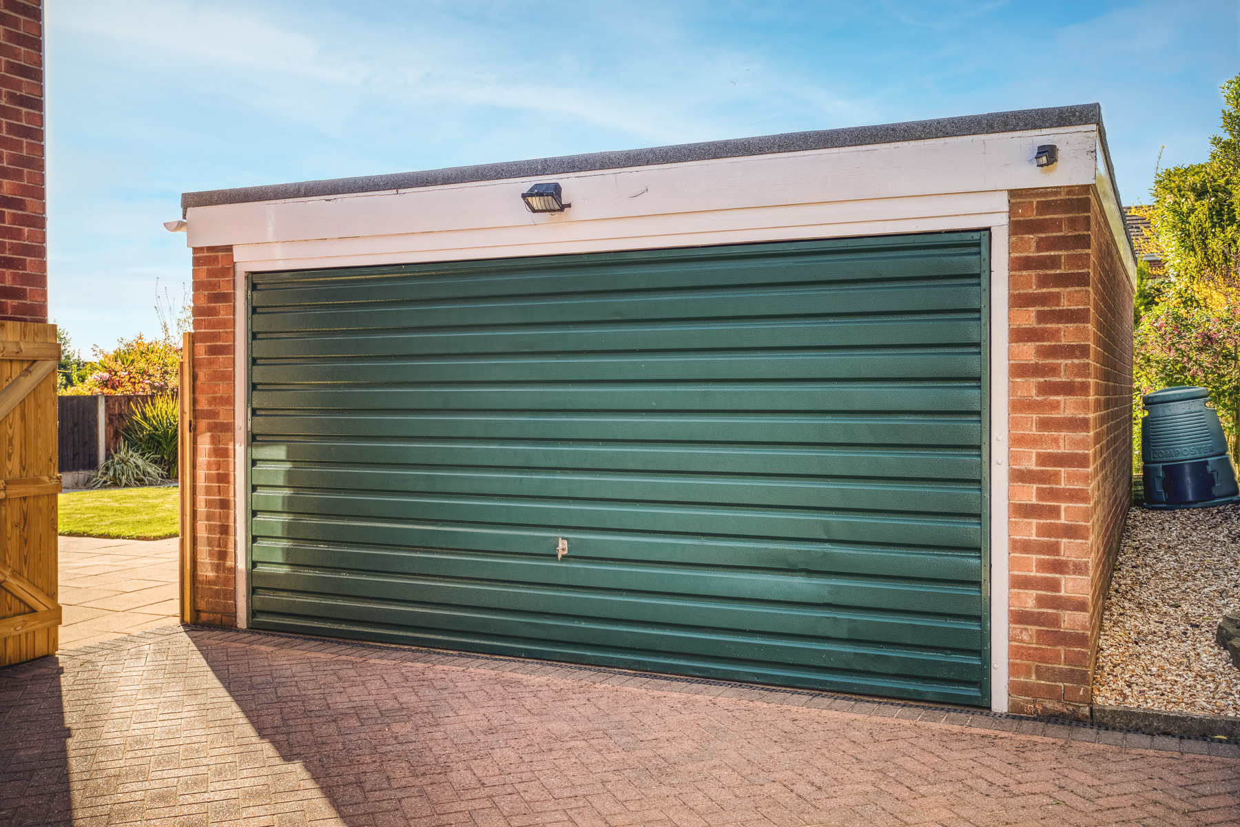 The substantial frontage and garden comprises of a large lawn with hedgerow boundaries to neighbouring properties and a huge block paved driveway providing parking for numerous vehicles and providing access to a large brick built detached double garage, with up and over door.