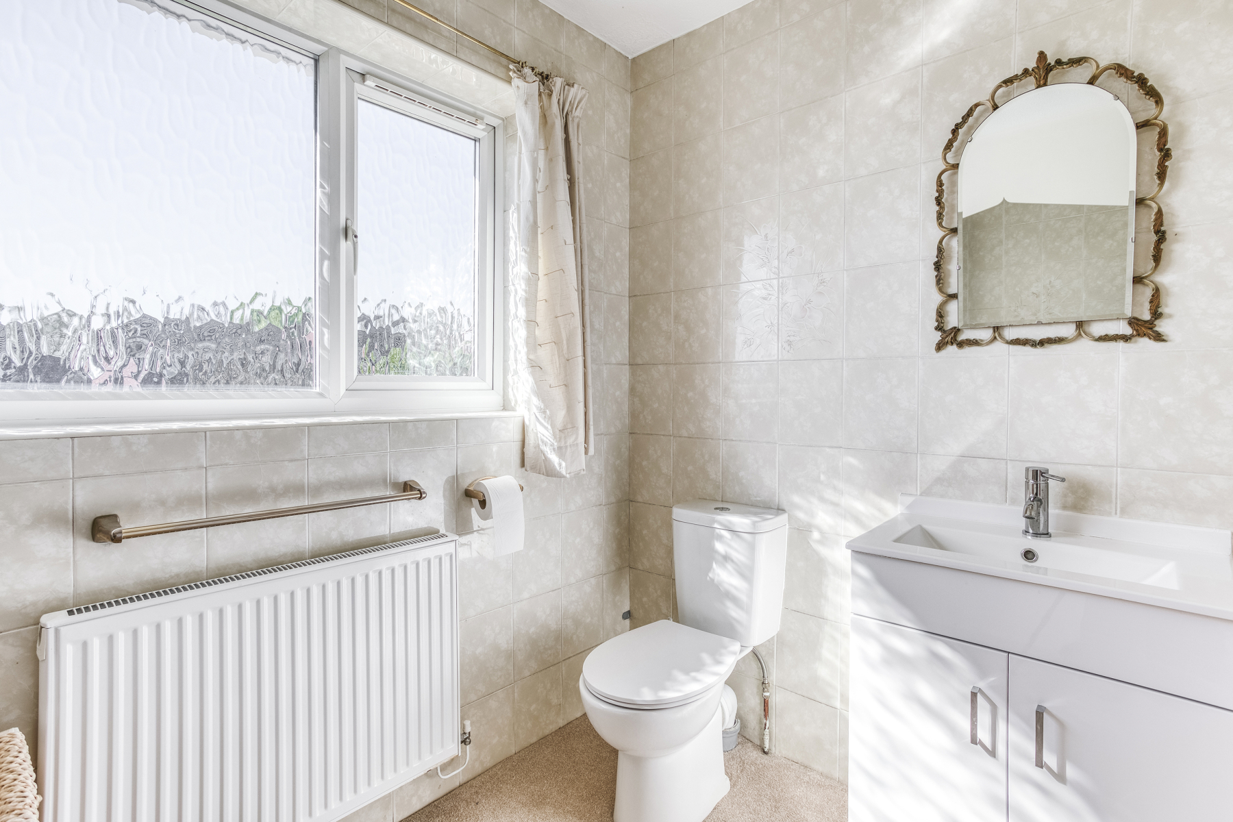 With low-level WC, pedestal wash hand basin, wall mounted radiator and double glazed obscured window to the front elevation.
