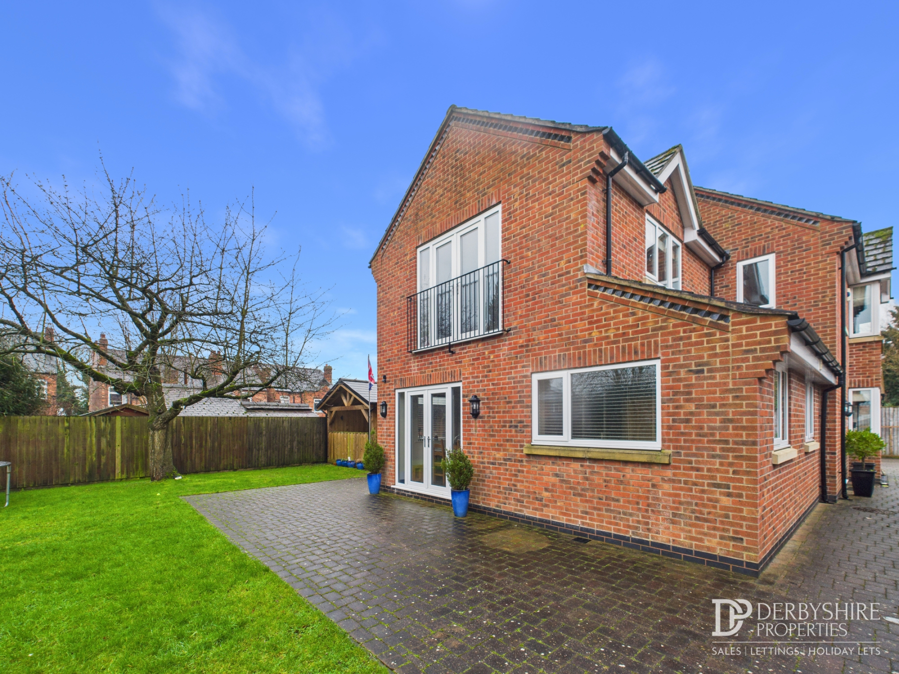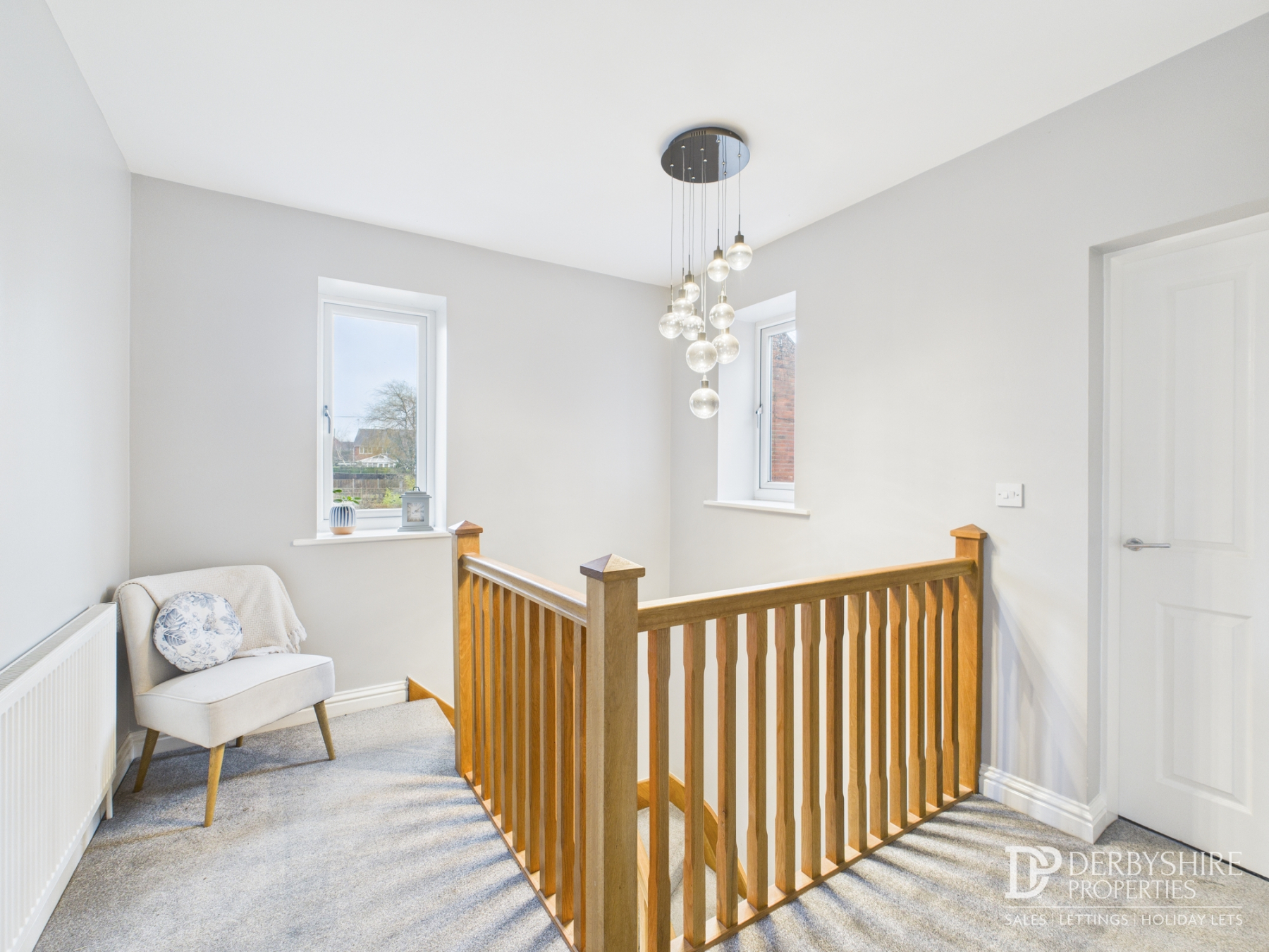 The ground floor also includes a cosy lounge, utility room and convenient downstairs WC. Upstairs, a half-galleried landing leads to three well-proportioned double bedrooms, including the main bedroom with en suite and balcony access, along with a stylish family bathroom.