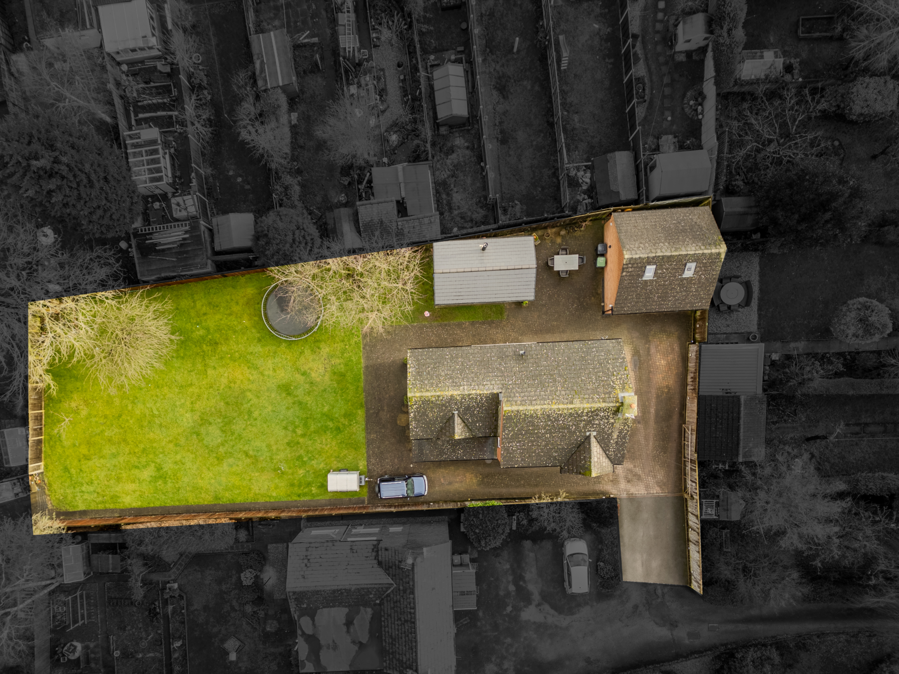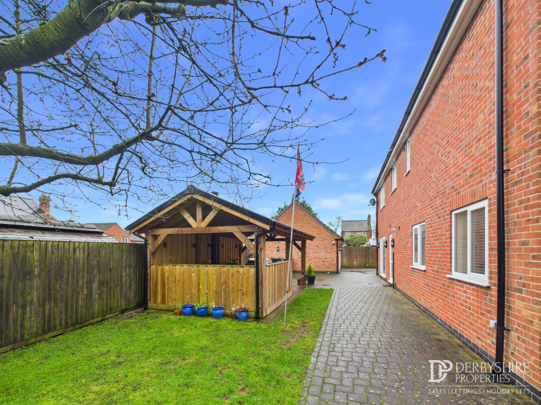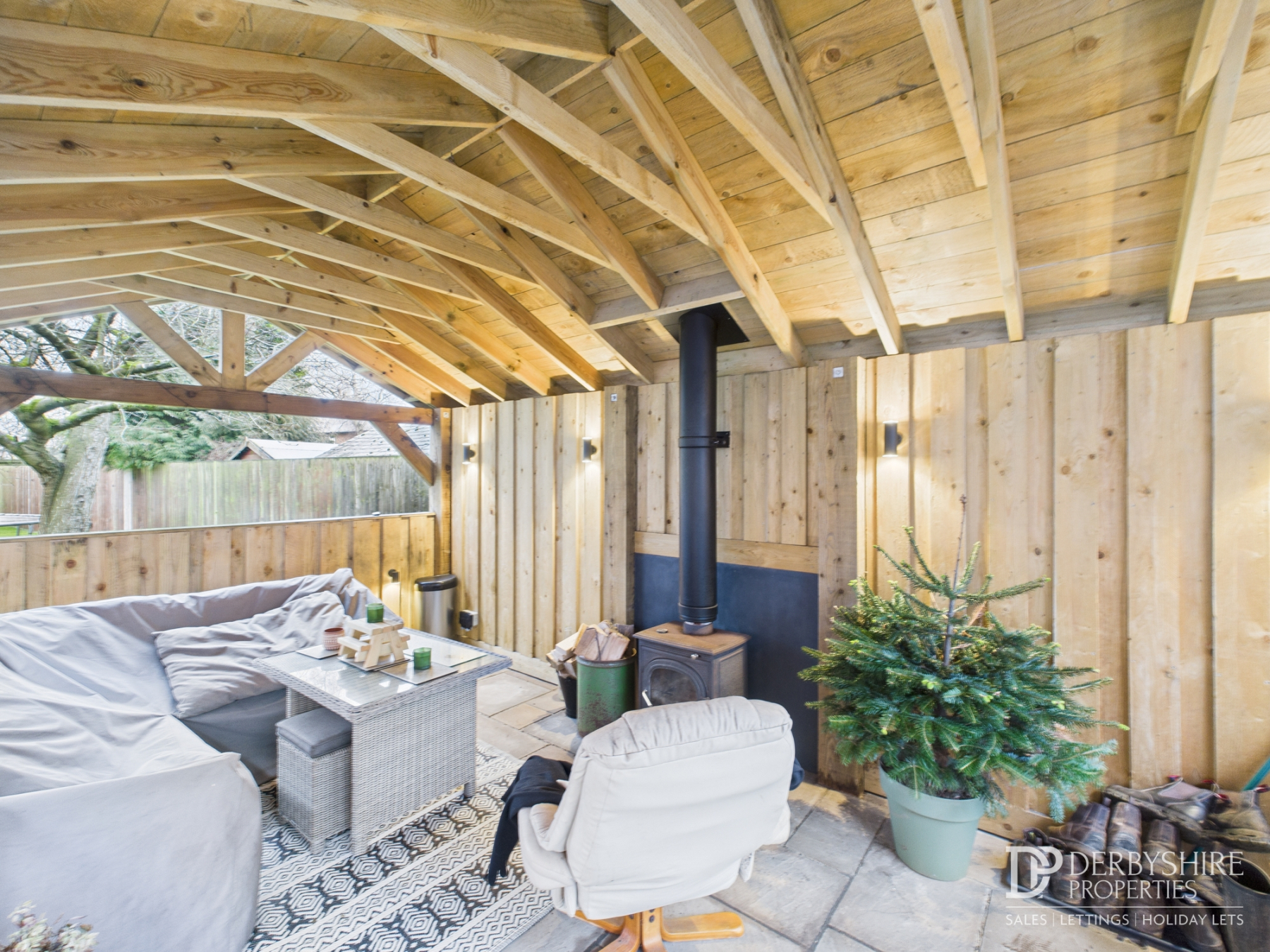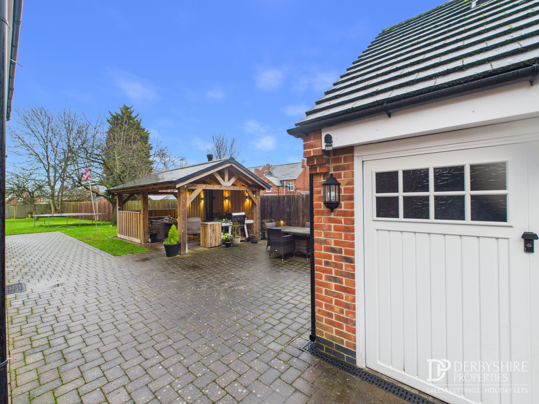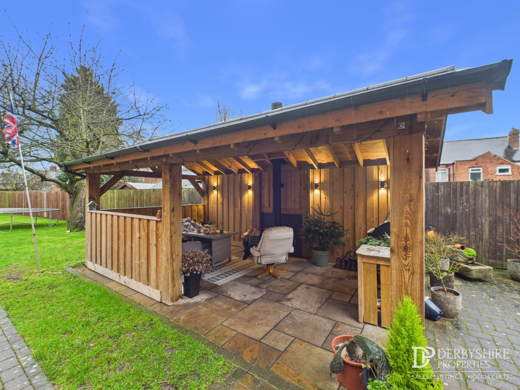 Externally, there is ample off-road parking and a detached double garage with a converted attic space that would work well as a home office, hobby room or teenage retreat. The garden is a standout feature, offering a generous lawn, a paved entertaining area and a timber-built covered seating space complete with a wood-burning stove — ideal for year-round gatherings. Beyond this, additional land to the rear offers exciting potential for an annex, outbuilding (subject to planning permission) or even a vegetable plot.