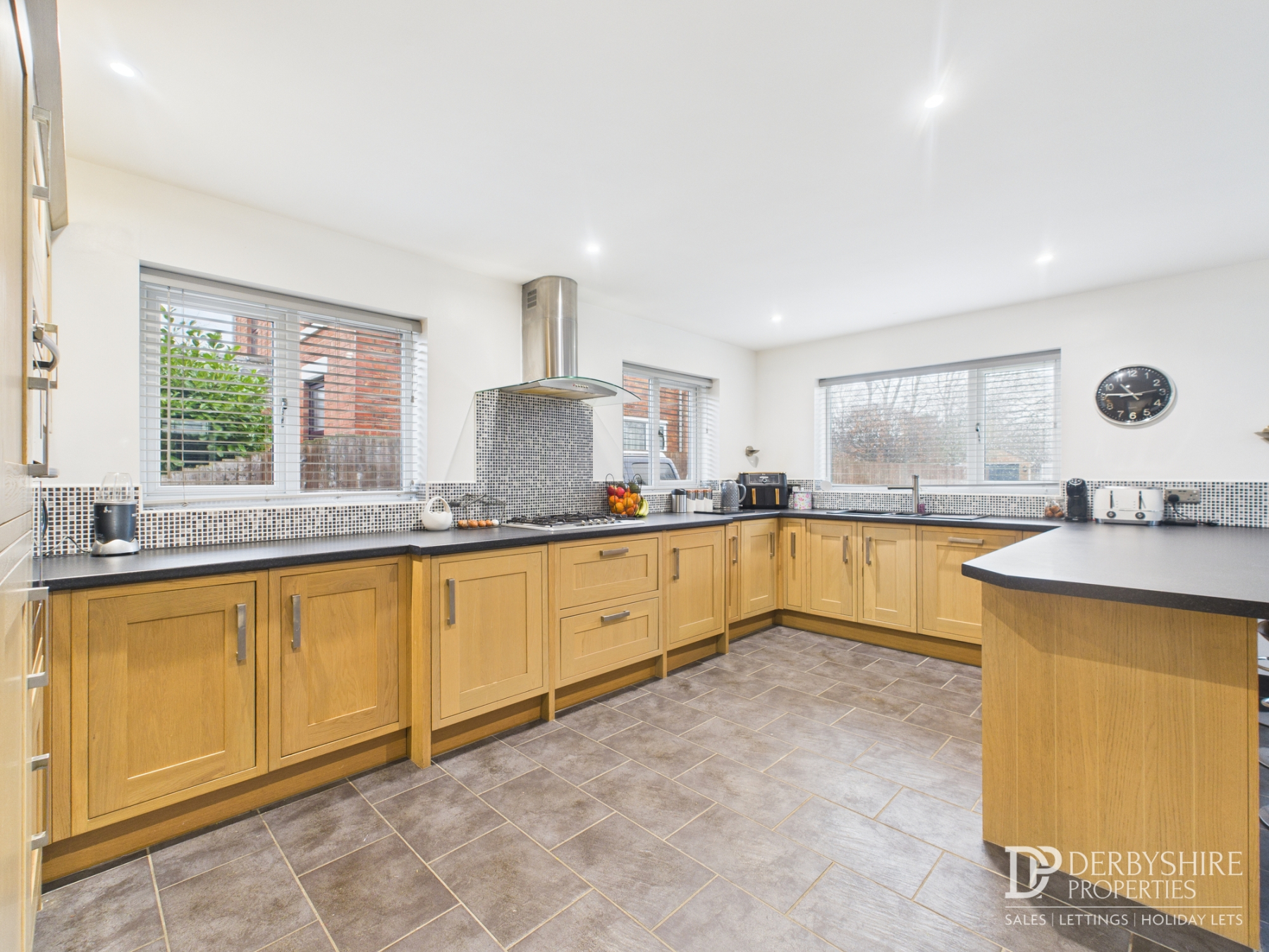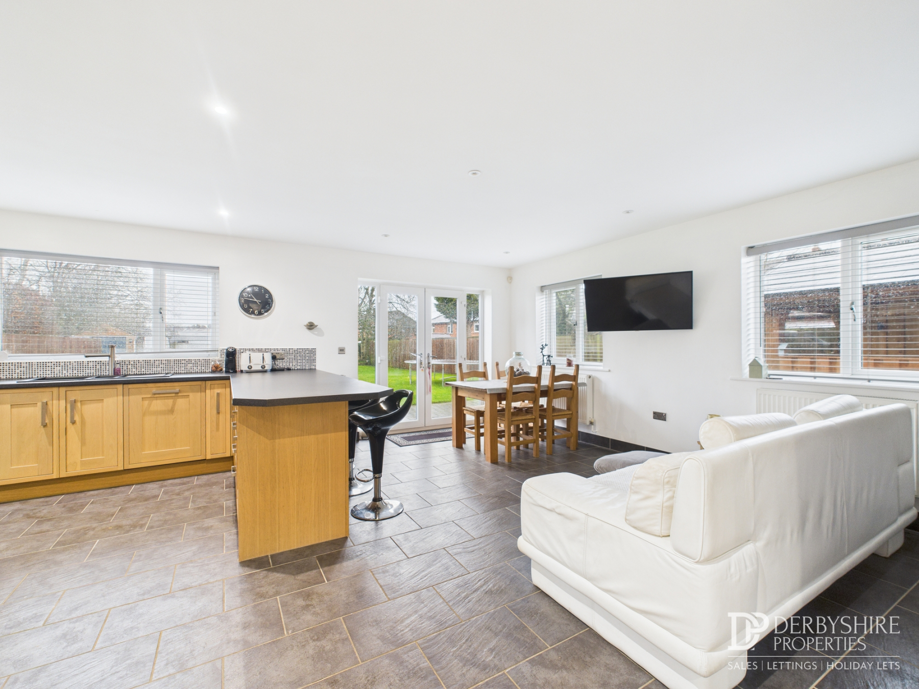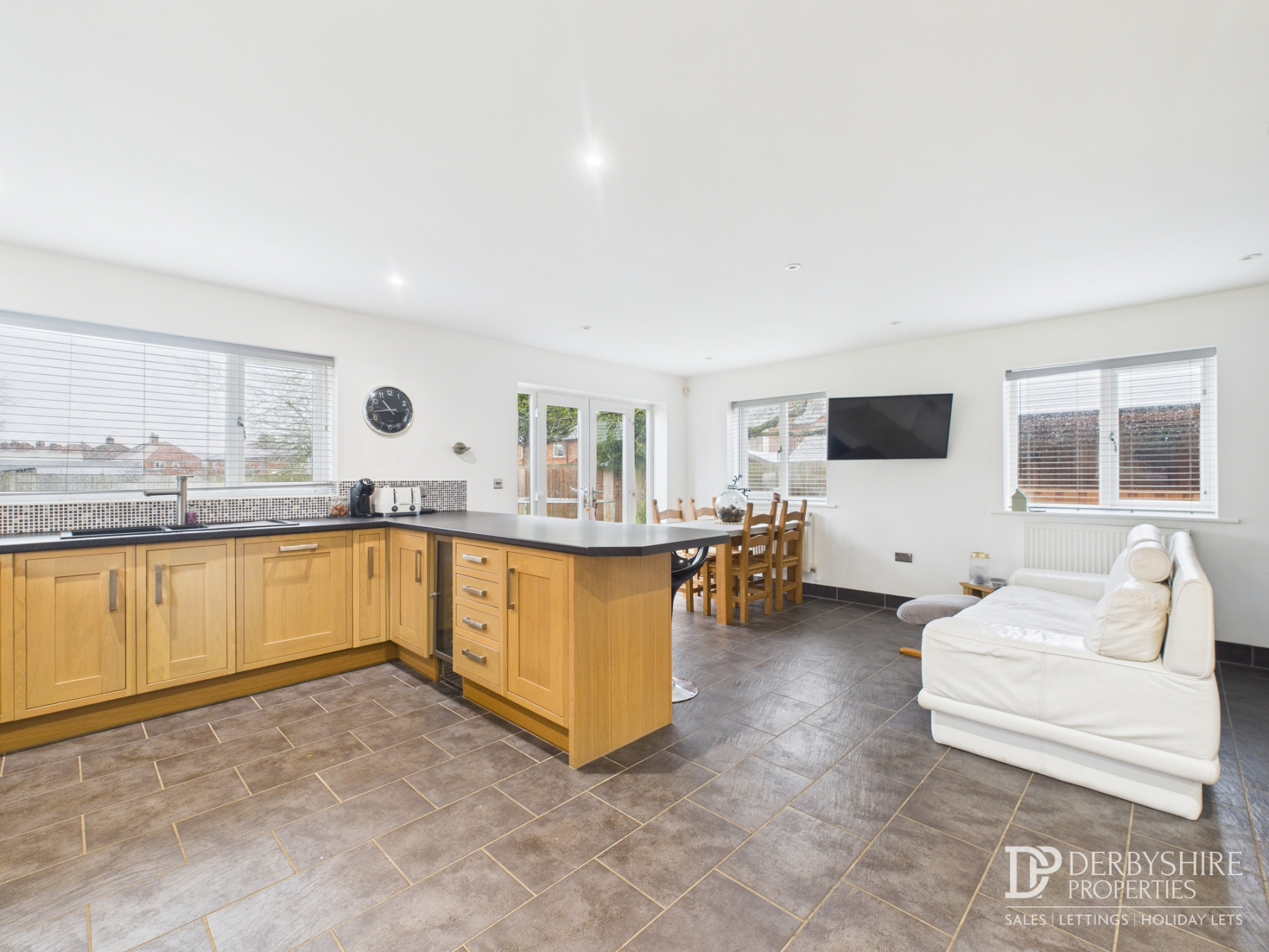 Dining kitchen featuring a range of matching wall and base units with work surfaces incorporating an inset one-and-a-half bowl sink and drainer. The kitchen is fitted with integrated appliances, including a waist-height electric double oven and grill, five-ring gas hob with extractor, fridge, dishwasher, and wine cooler, plus a breakfast bar. The space is finished with tiled flooring, ceiling spotlights, and two radiators. Light floods in through four rear-facing uPVC double-glazed windows, a side window, French doors, and sliding patio doors, all opening onto the rear garden.