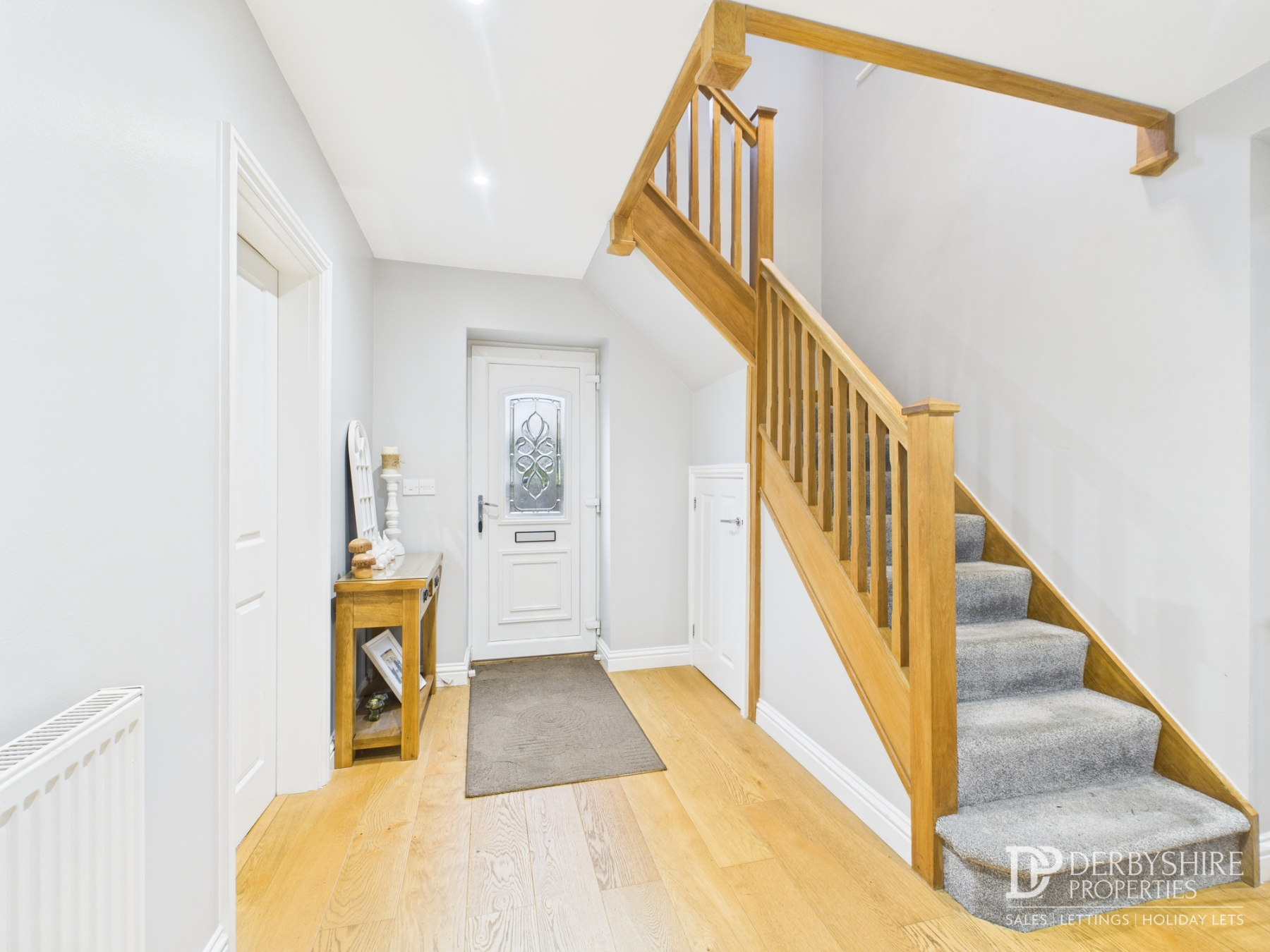 Entrance hallway with a double-glazed front door, radiator, and oak flooring. Features stairs to the first floor, useful understairs storage, and doors leading to the lounge, dining kitchen, WC, and utility room.