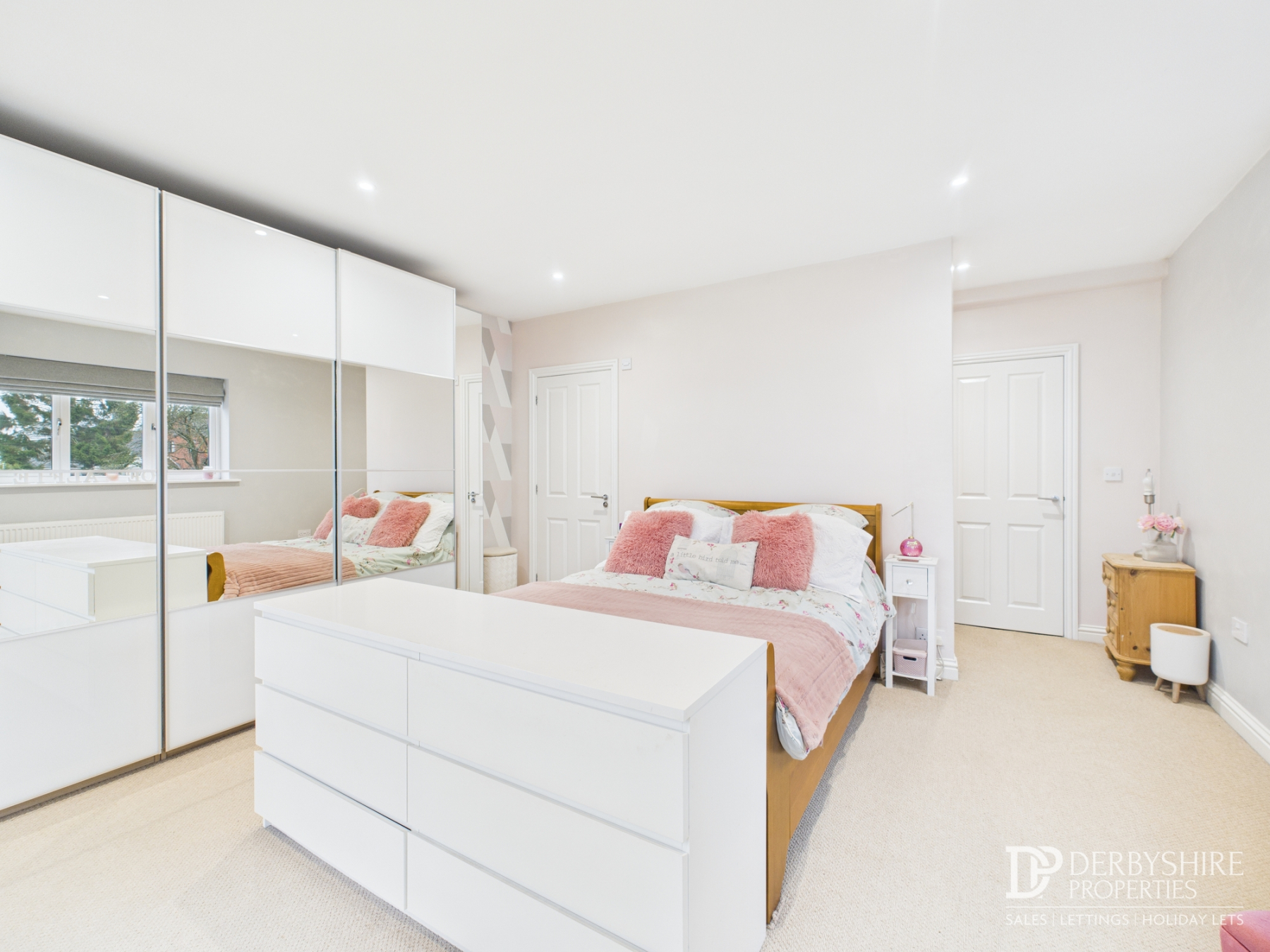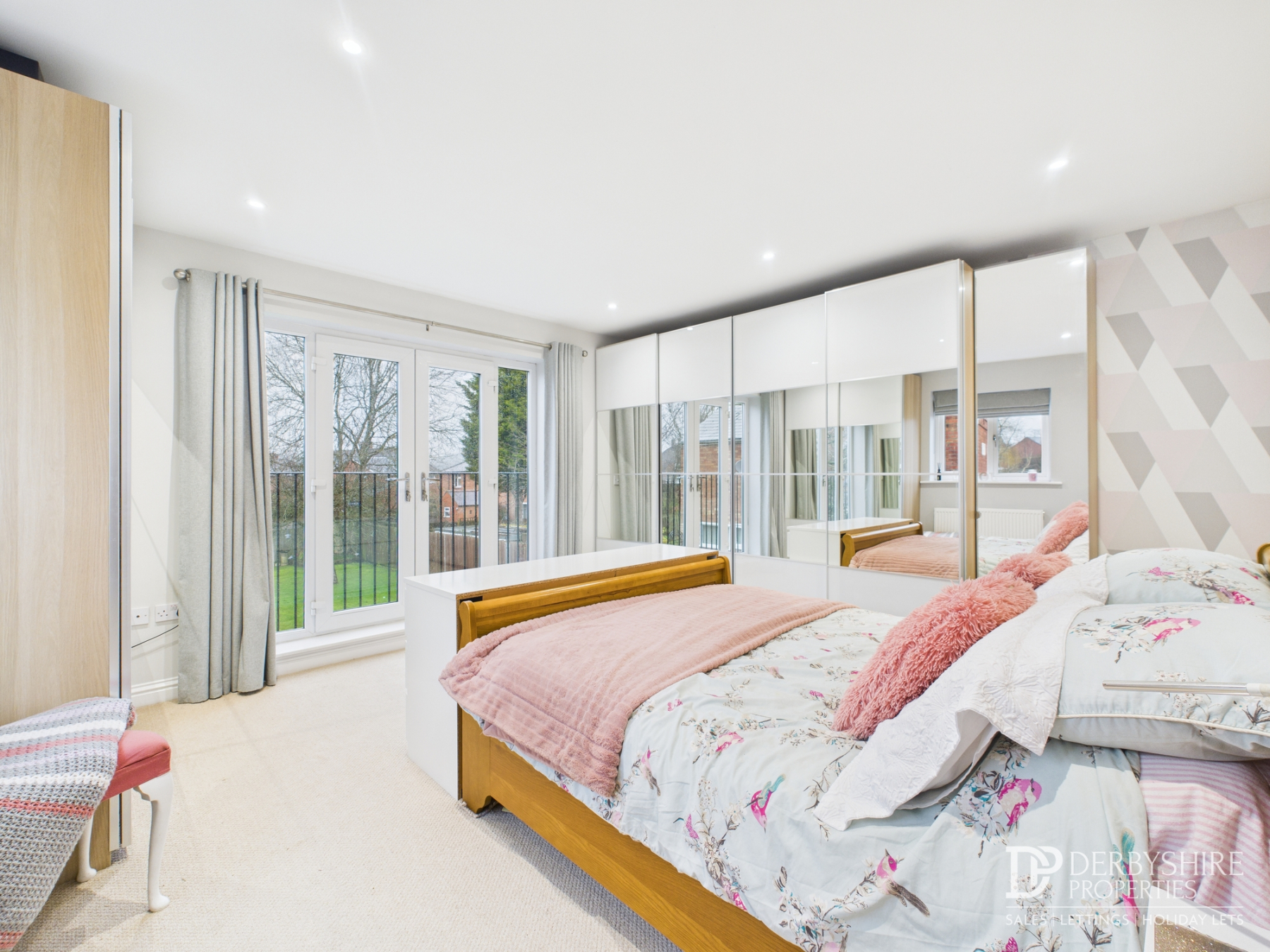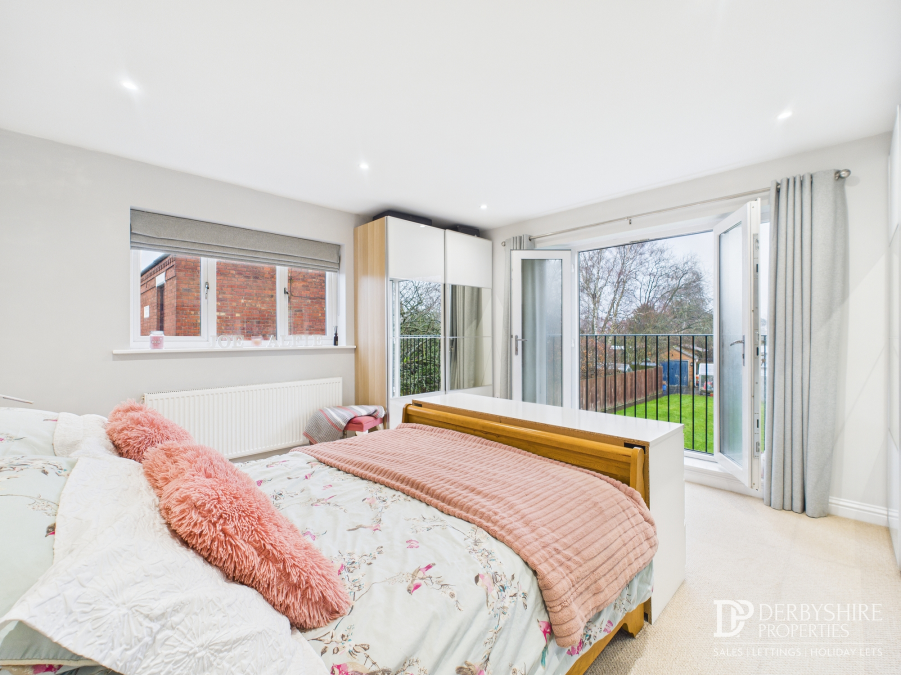 Master bedroom featuring a double-glazed window to the front, ceiling spotlights, radiator, French doors to the side, and a door leading to the en suite.