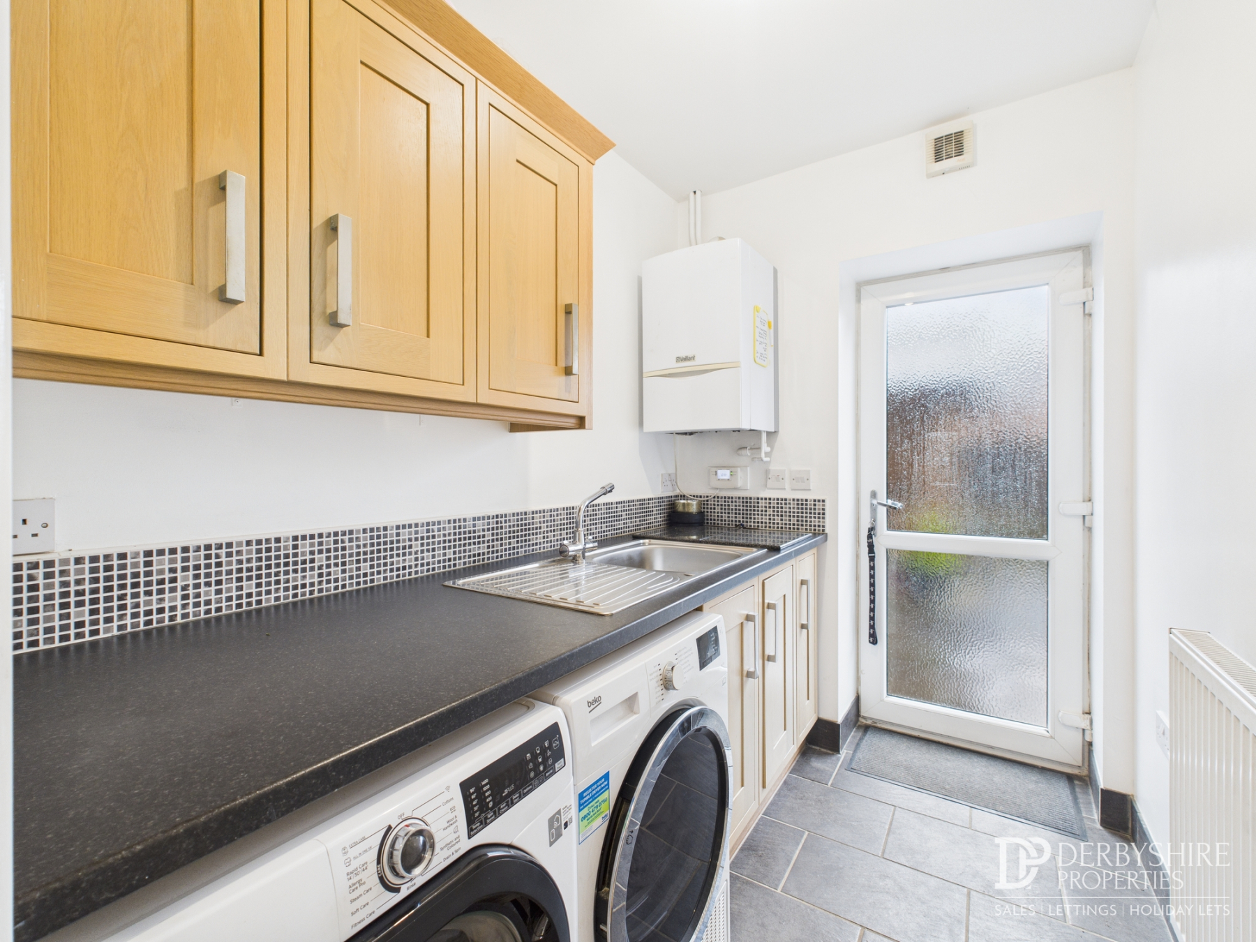 Fitted with a range of matching wall and base units and work surfaces incorporating an inset stainless-steel sink and drainer. Includes plumbing for a washing machine, wall-mounted boiler, tiled flooring, radiator, extractor fan, and an obscured double-glazed window to the side.