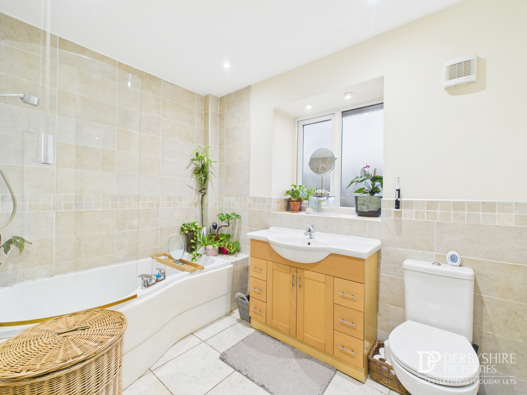 Three-piece bathroom suite in white, comprising WC, vanity sink unit, and bath. Finished with ceiling spotlights, an extractor fan, radiator, and an obscured uPVC double-glazed window to the front, creating a bright and functional space.