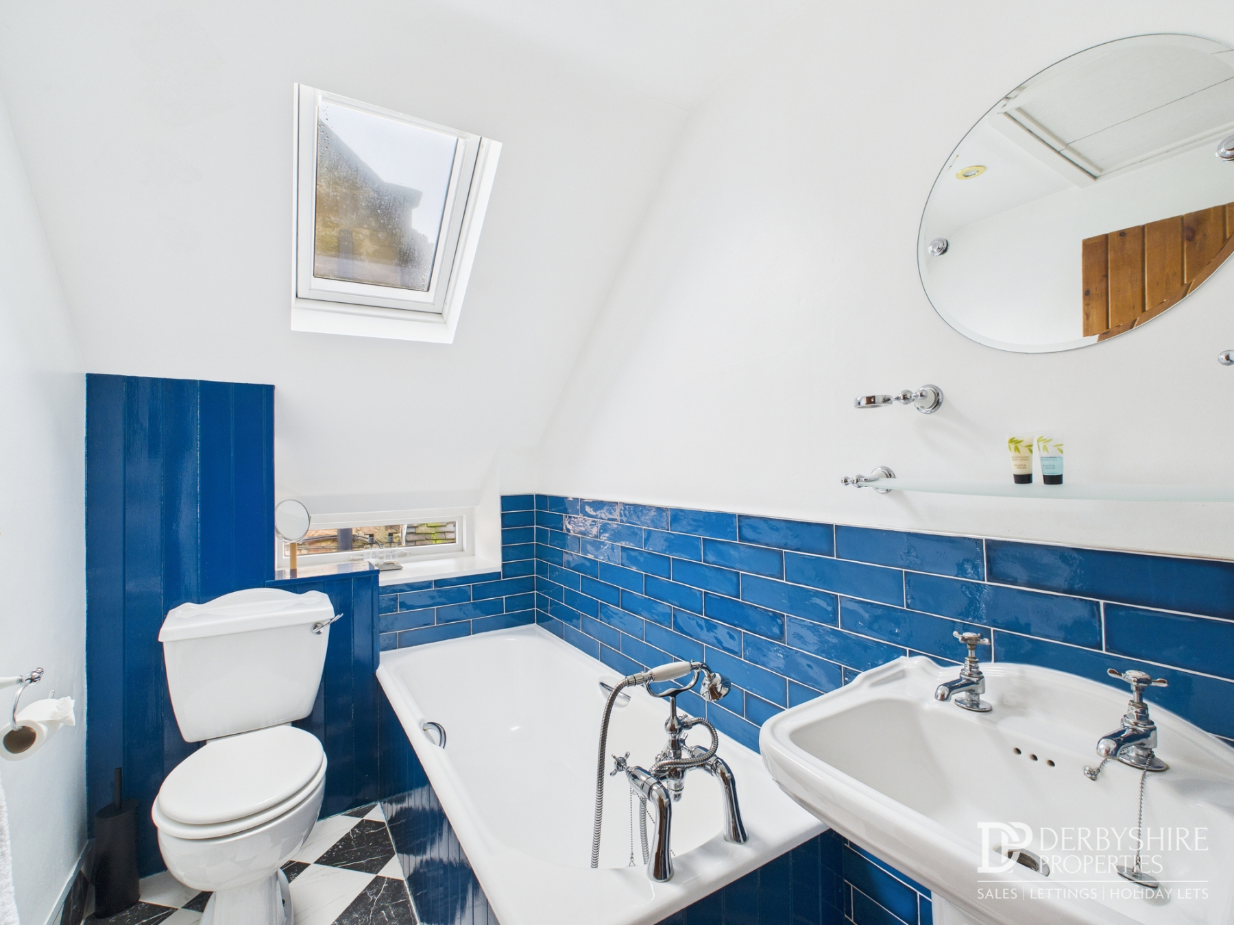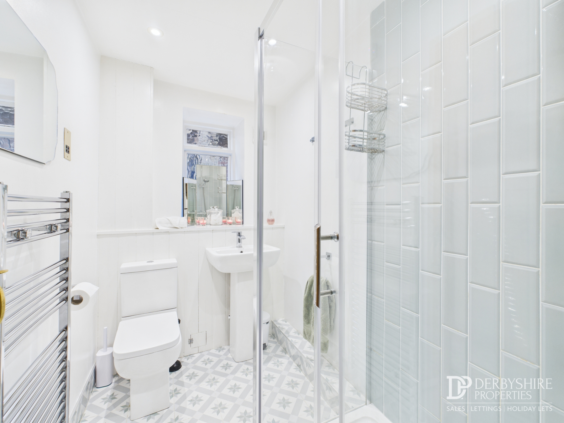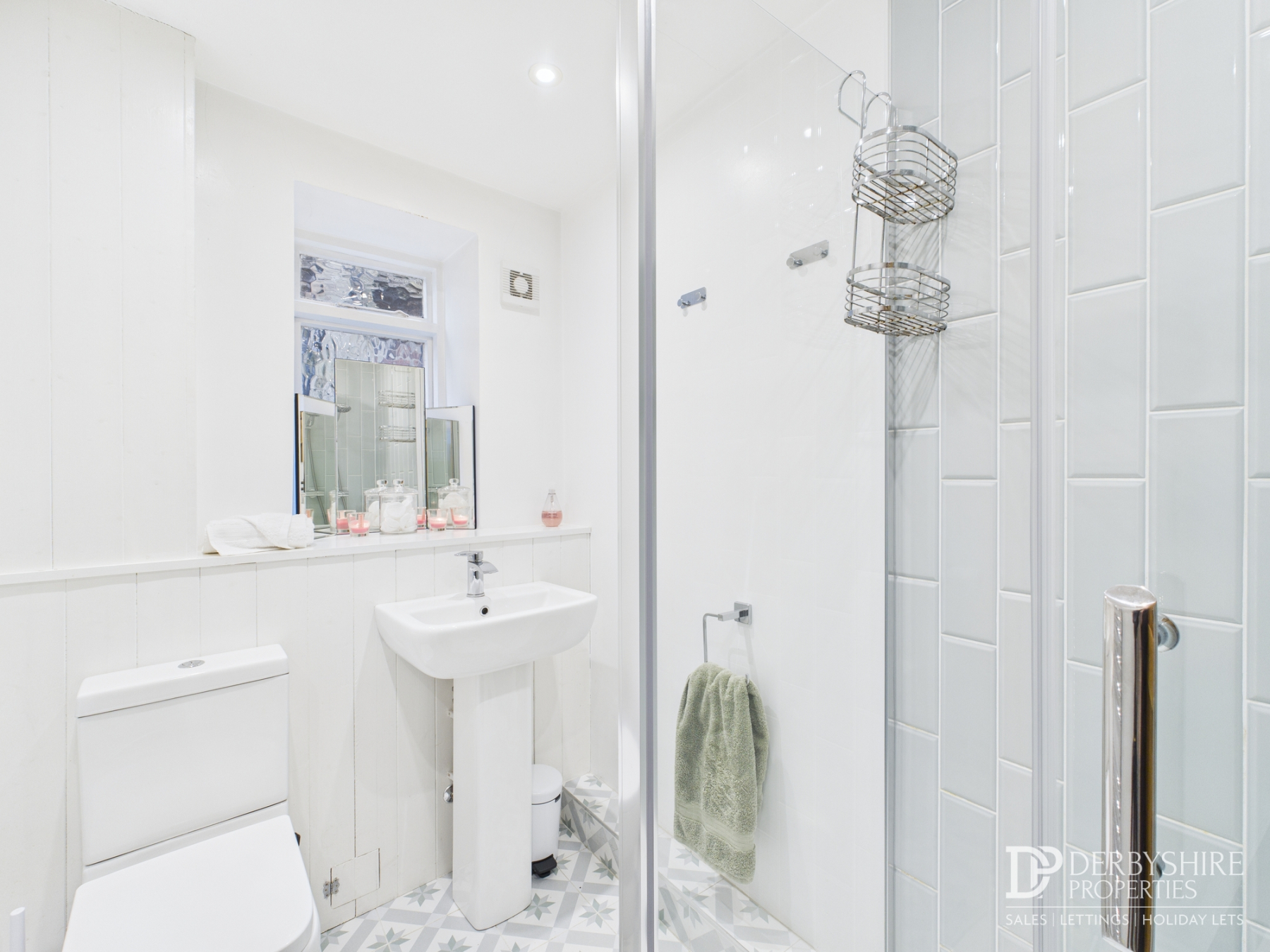Situated between both bedrooms and fitted with a low-level WC, pedestal wash hand basin, and panelled bath with shower attachment. Benefits from a double-glazed side window, Velux skylight, heated towel rail, vinyl flooring, spotlighting, extractor fan, and a large ceiling-mounted loft access point.