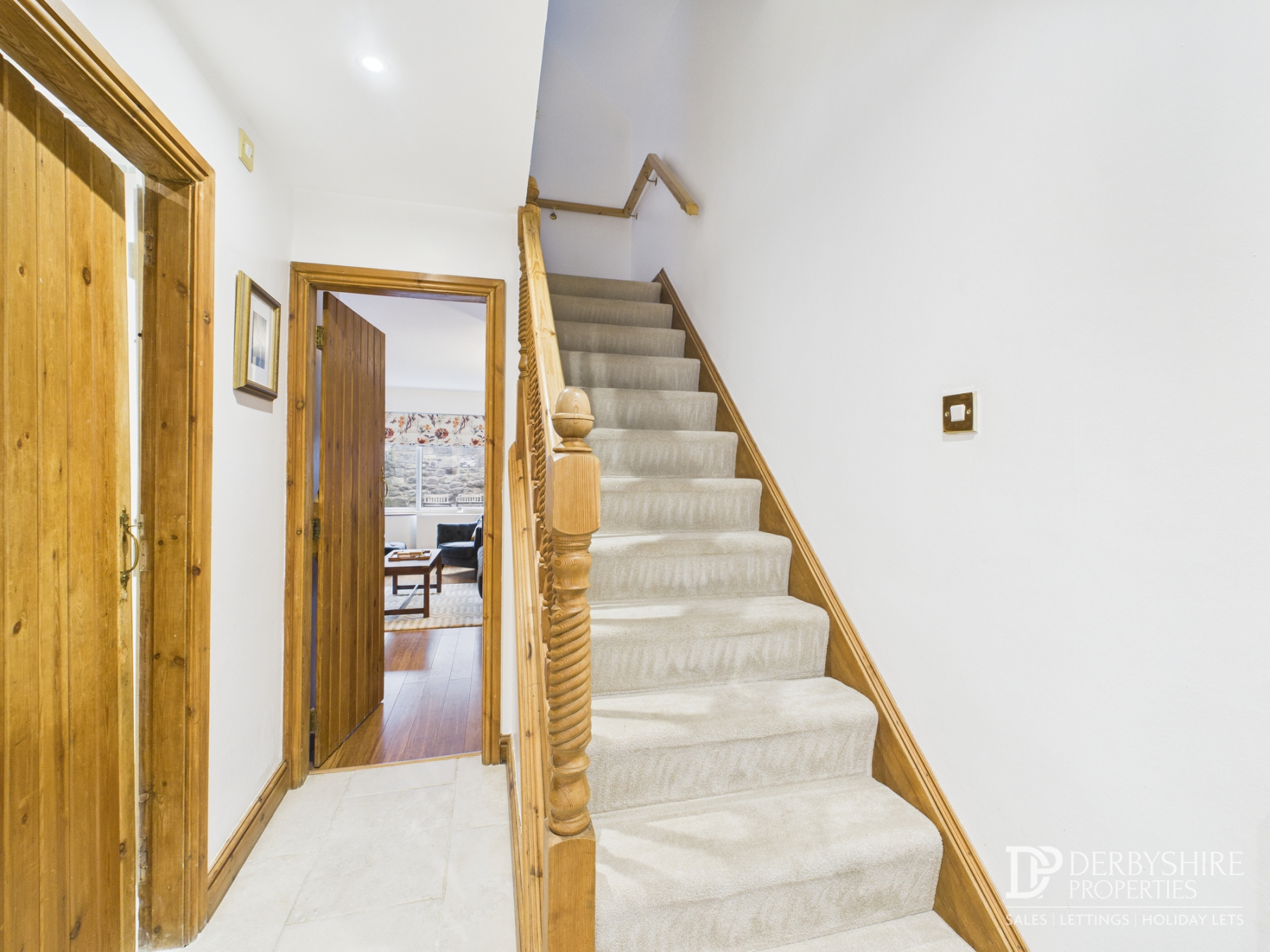 Accessed from the kitchen, with internal doors leading to both bedrooms and the bathroom. Includes a useful over-stairs storage cupboard and ceiling spotlights.