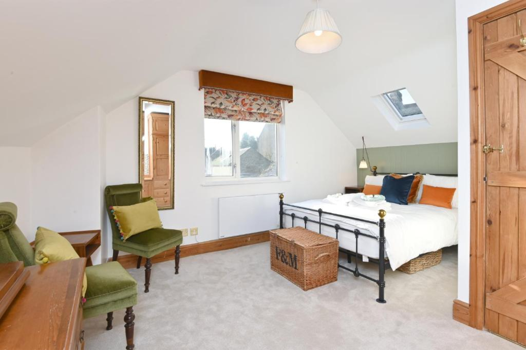 Located to the rear of the property, enjoying double-glazed views over the village and surrounding countryside. Features include a wall-mounted electric heater, additional Velux skylight, fitted bedroom furniture, and a vanity unit with tiled splashback.