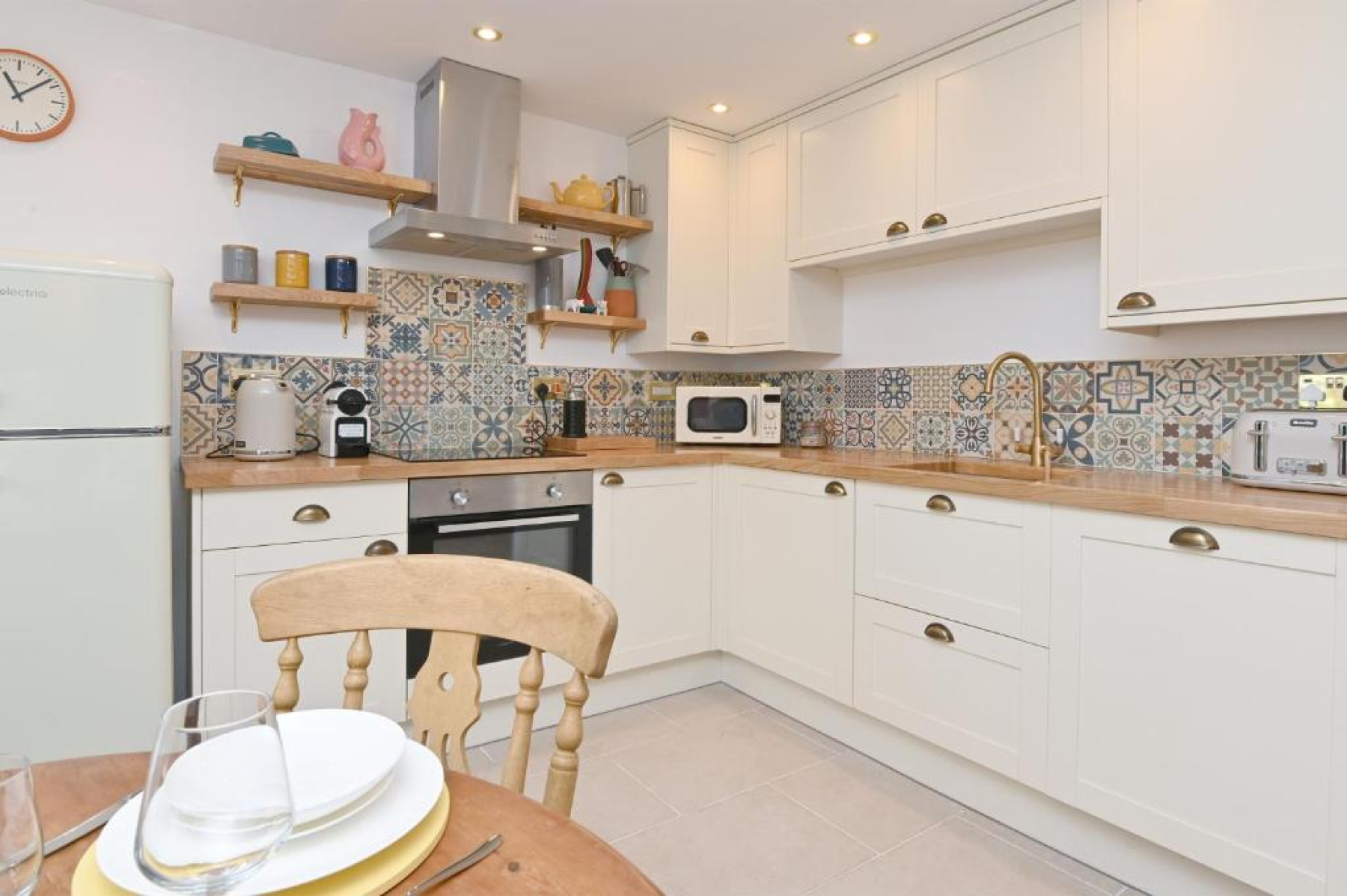 Beautifully appointed with a range of wall and base-mounted shaker units, hardwood work surfaces, inset sink with mixer tap, and attractive tiled splashbacks. Integrated appliances include an electric oven, hob, and extractor hood, with space for a fridge freezer.