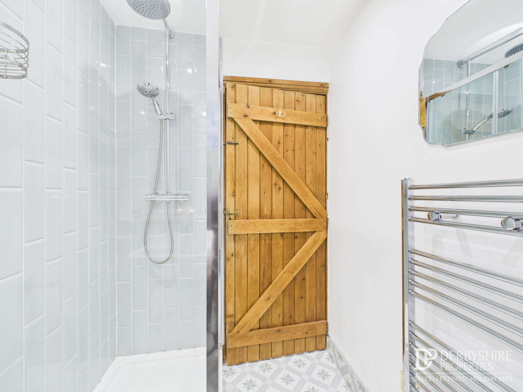 Fitted with a modern three-piece suite comprising a low-level WC, pedestal wash hand basin, and large shower enclosure with mains-fed shower and glass screen. Finished with part tiling, tiled flooring, heated towel rail, spotlighting, extractor fan, and electric point.