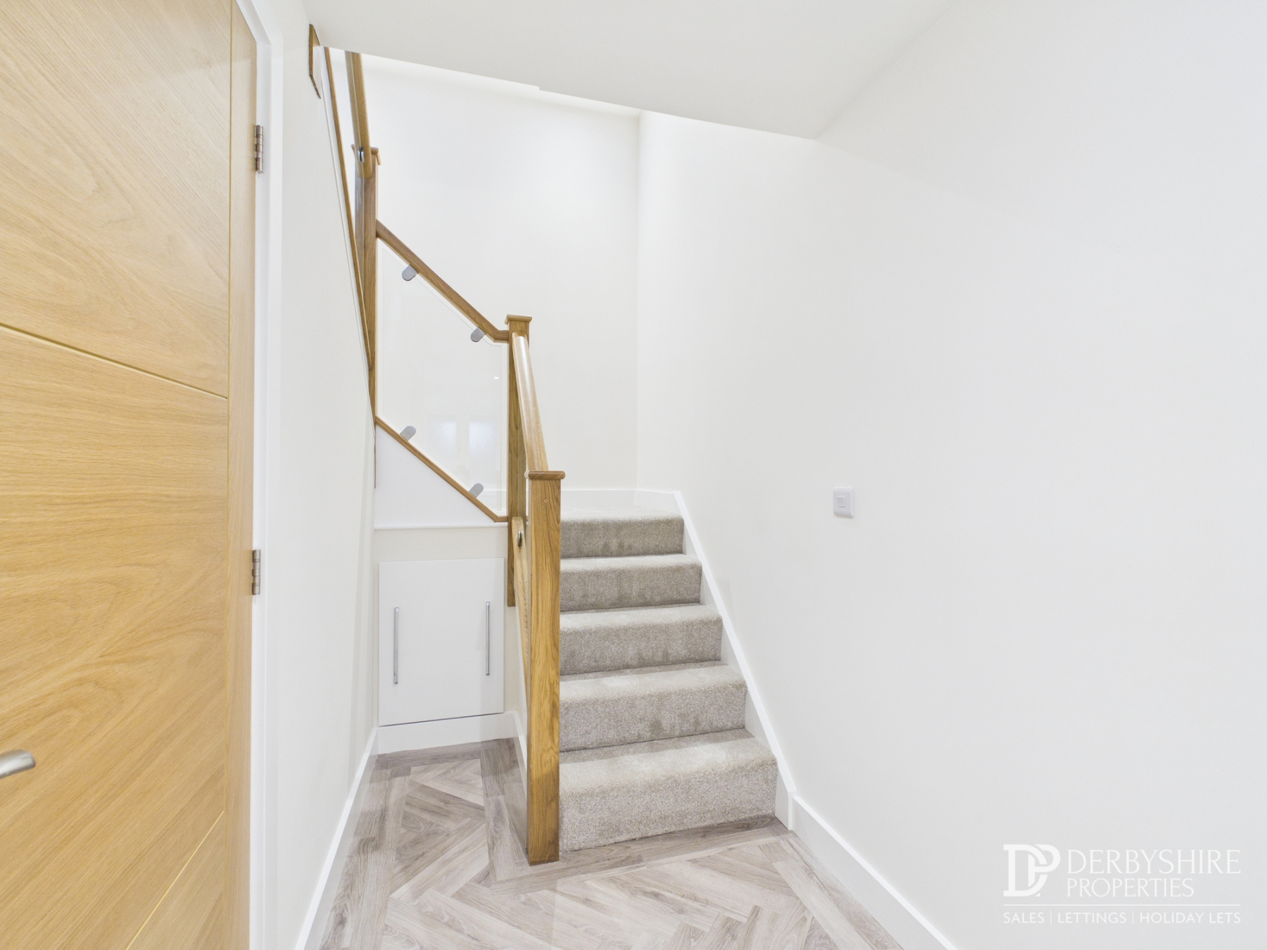 Entered via a composite door to the front elevation, featuring spotlighting to the ceiling, wall-mounted thermostat control, Amtico flooring and two double glazed windows. A centrally positioned bespoke oak staircase with glass panel inserts creates an impressive focal point, with useful under-stairs storage cupboard beneath.