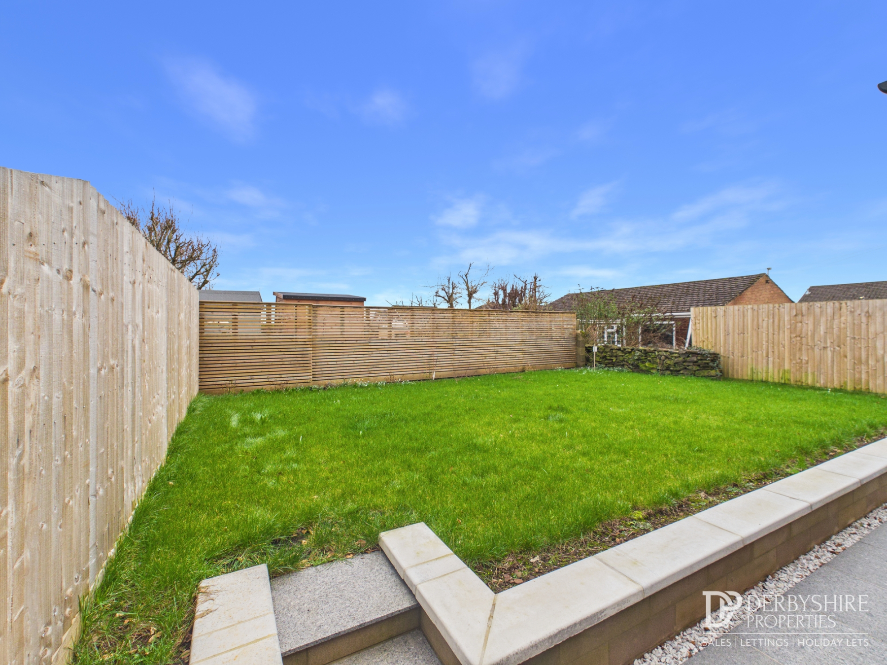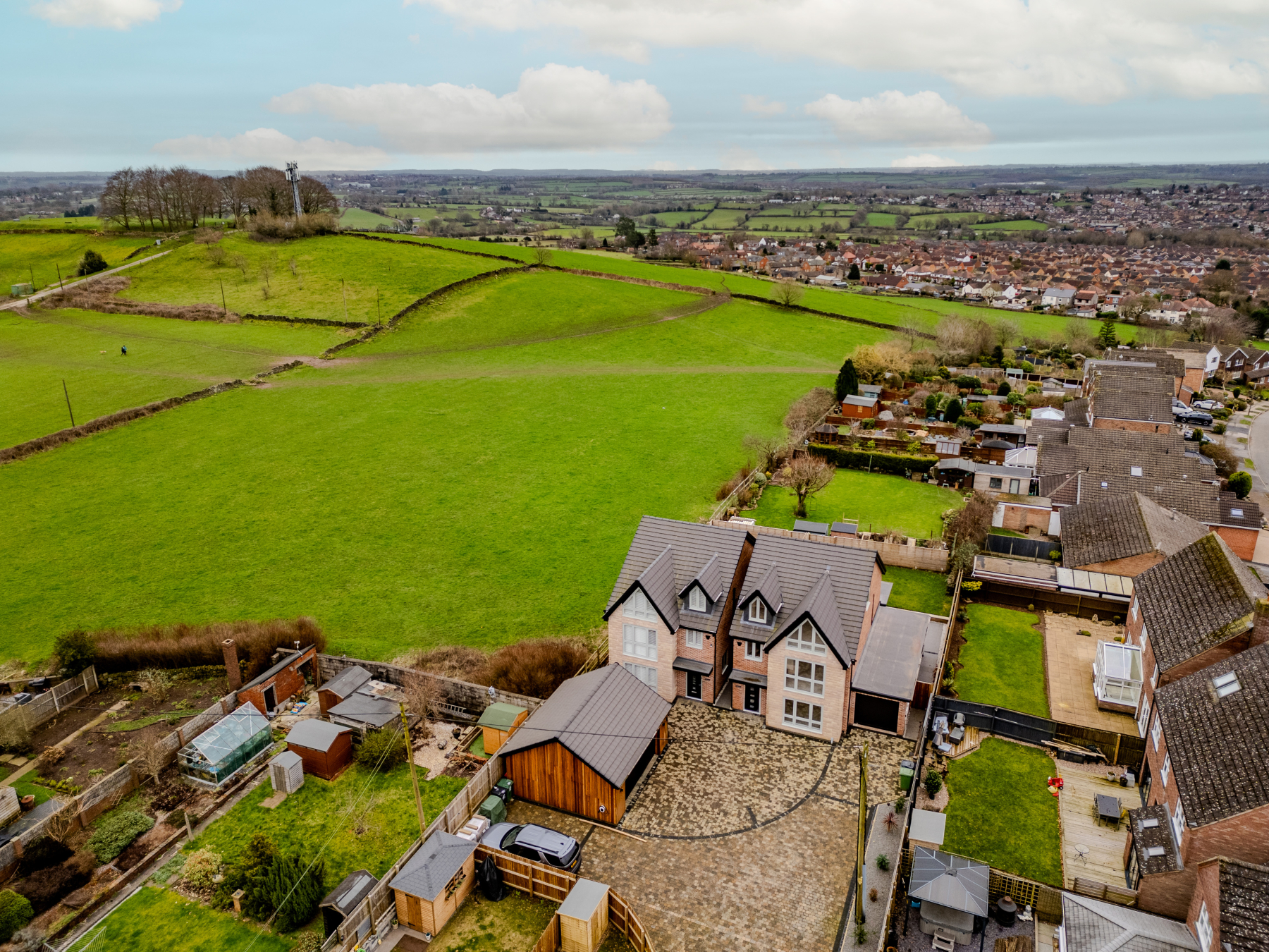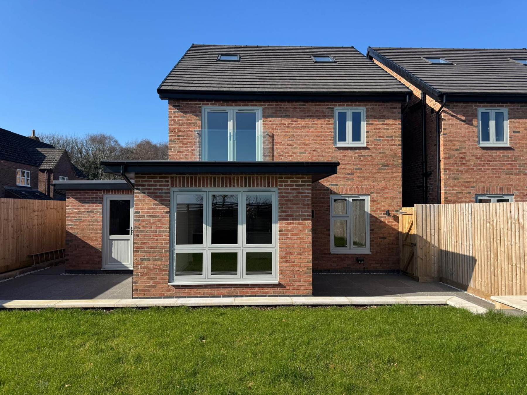 The rear garden features a full-width porcelain entertaining terrace with raised lawn beyond, all enclosed by timber fence boundaries and enjoying open countryside views.