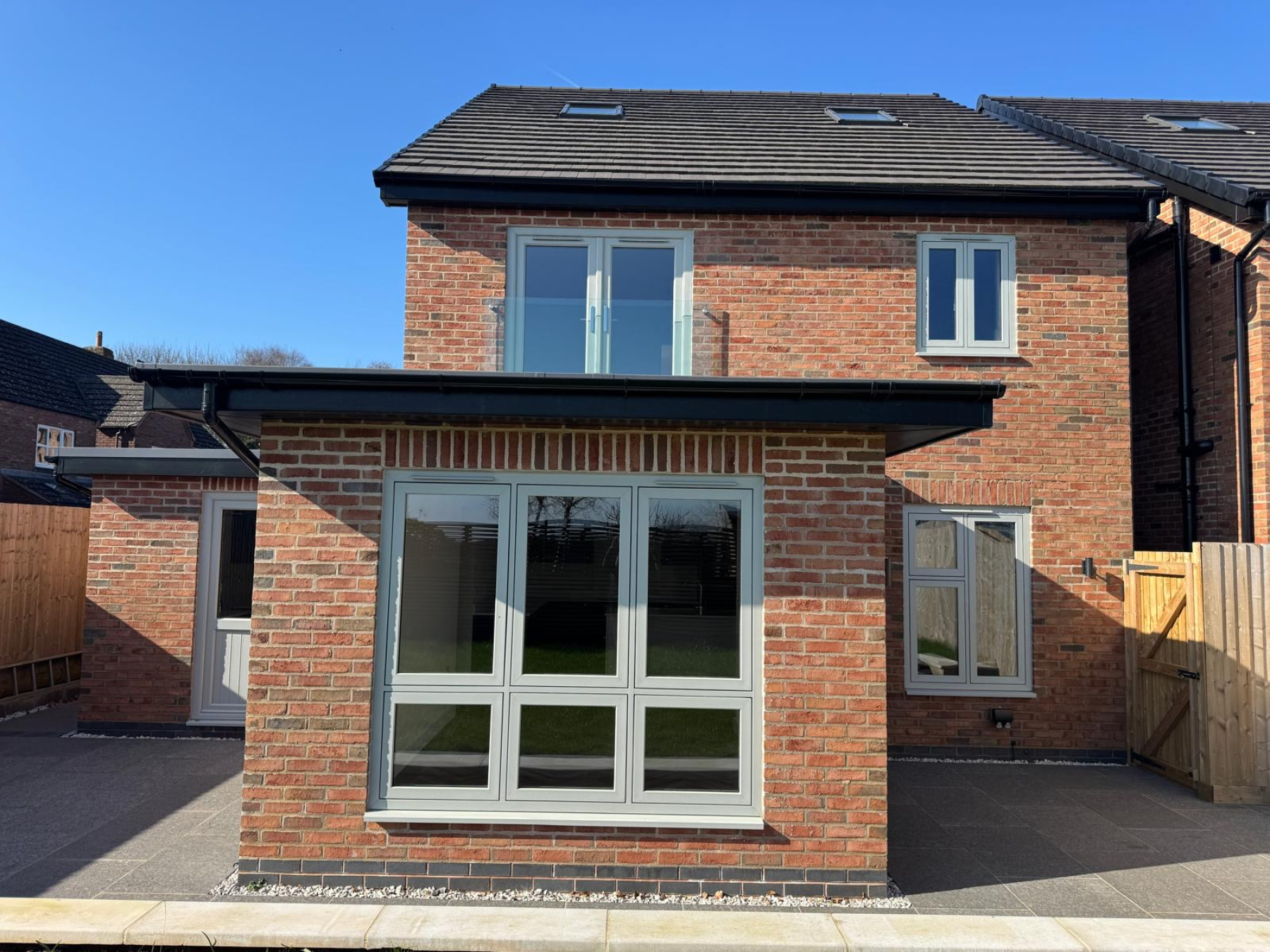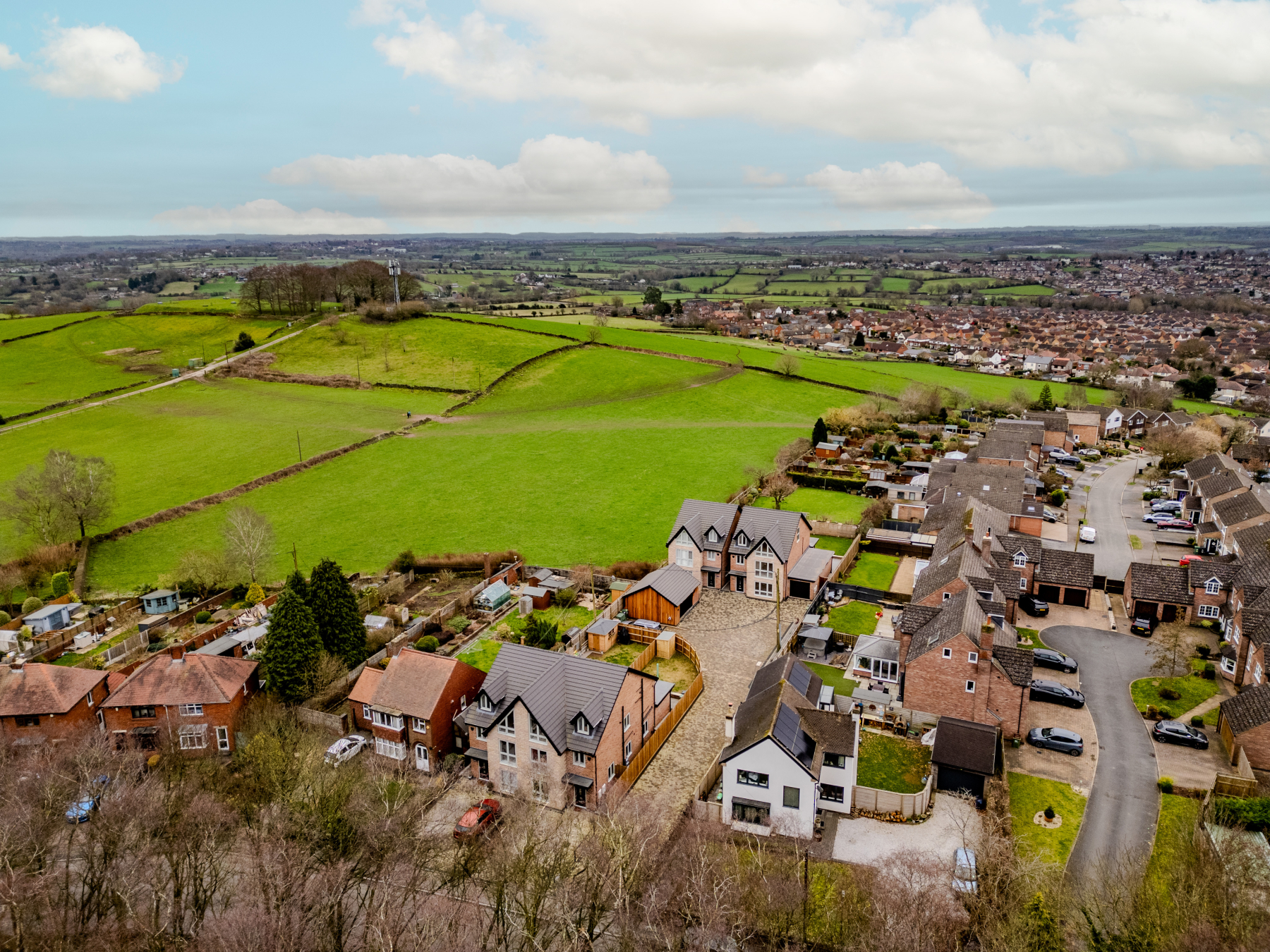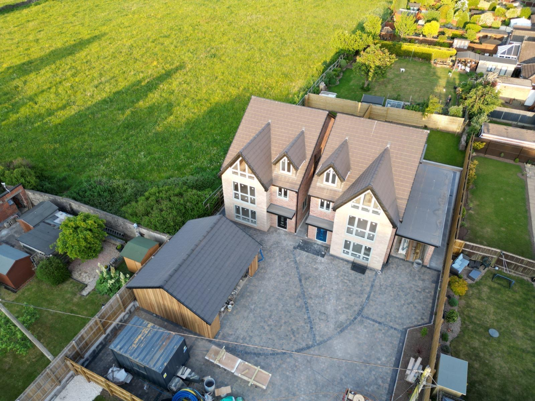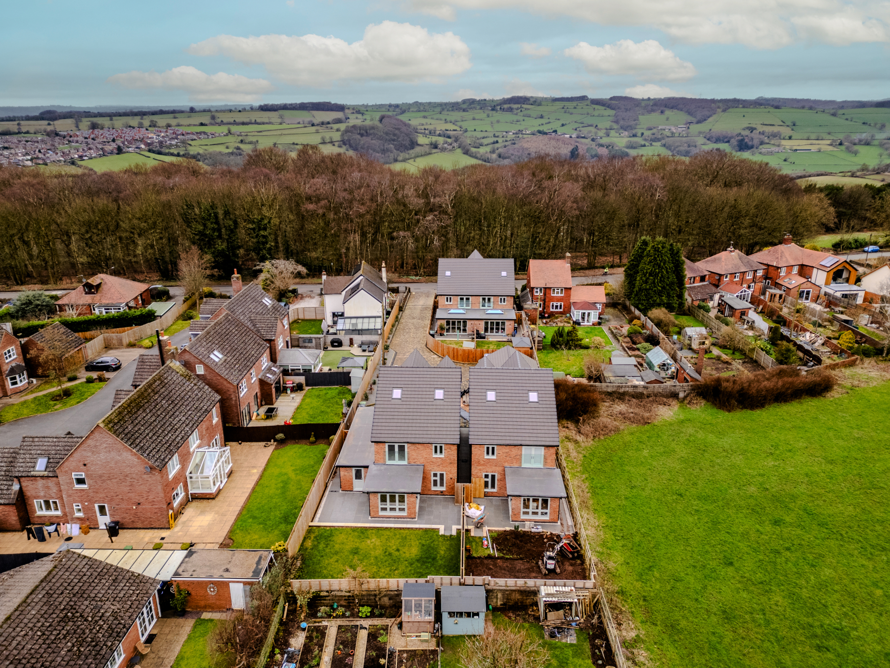 The rear garden features a full-width porcelain entertaining terrace with raised lawn beyond, all enclosed by timber fence boundaries and enjoying open countryside views.