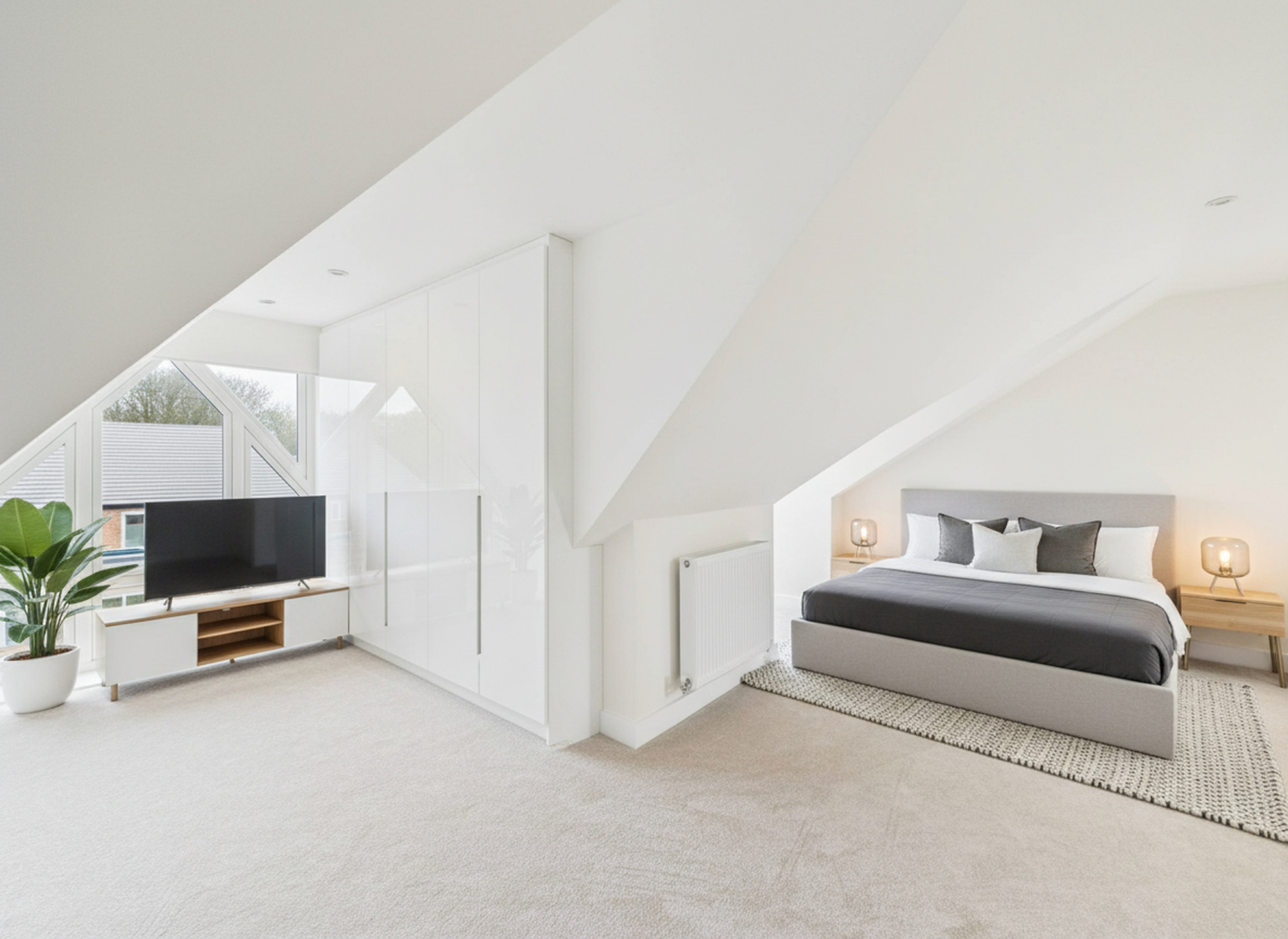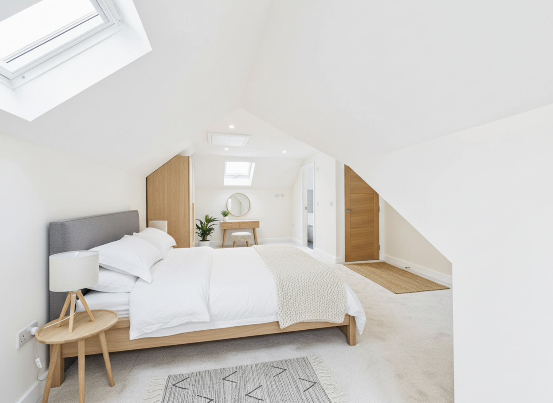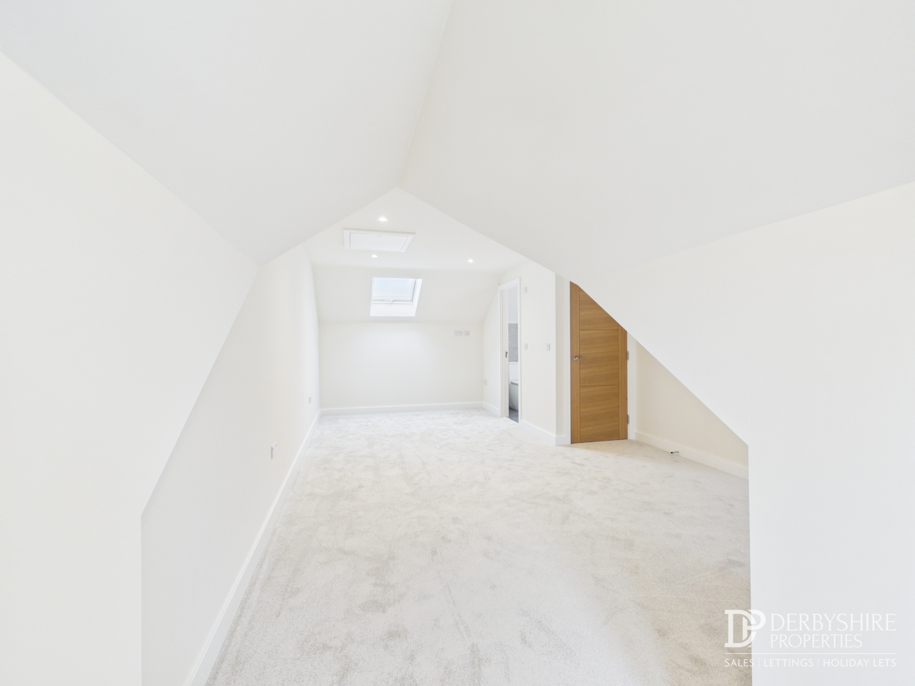 A superb characterful room spanning the full footprint of the property, featuring two front-facing windows, Velux skylight, spotlights, loft access and wall-mounted radiator.