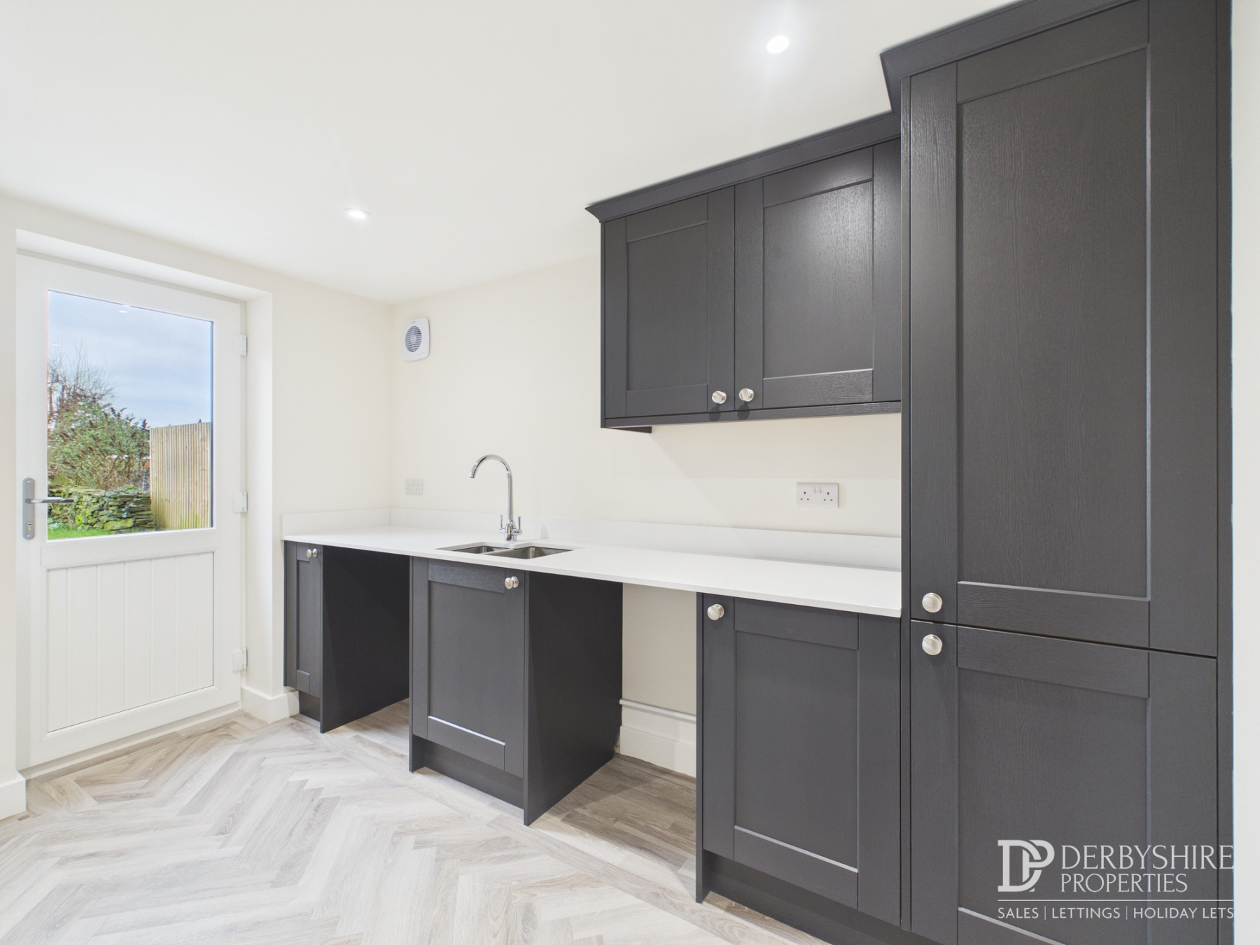 Conveniently positioned to the rear of the garage with direct access from the kitchen/dining area and internal access into the integral garage. Fitted with wall and base units, work surface incorporating stainless steel sink, space for washing machine and tumble dryer, full-height ladder cupboard, spotlighting and composite rear door. Underfloor heating continues.