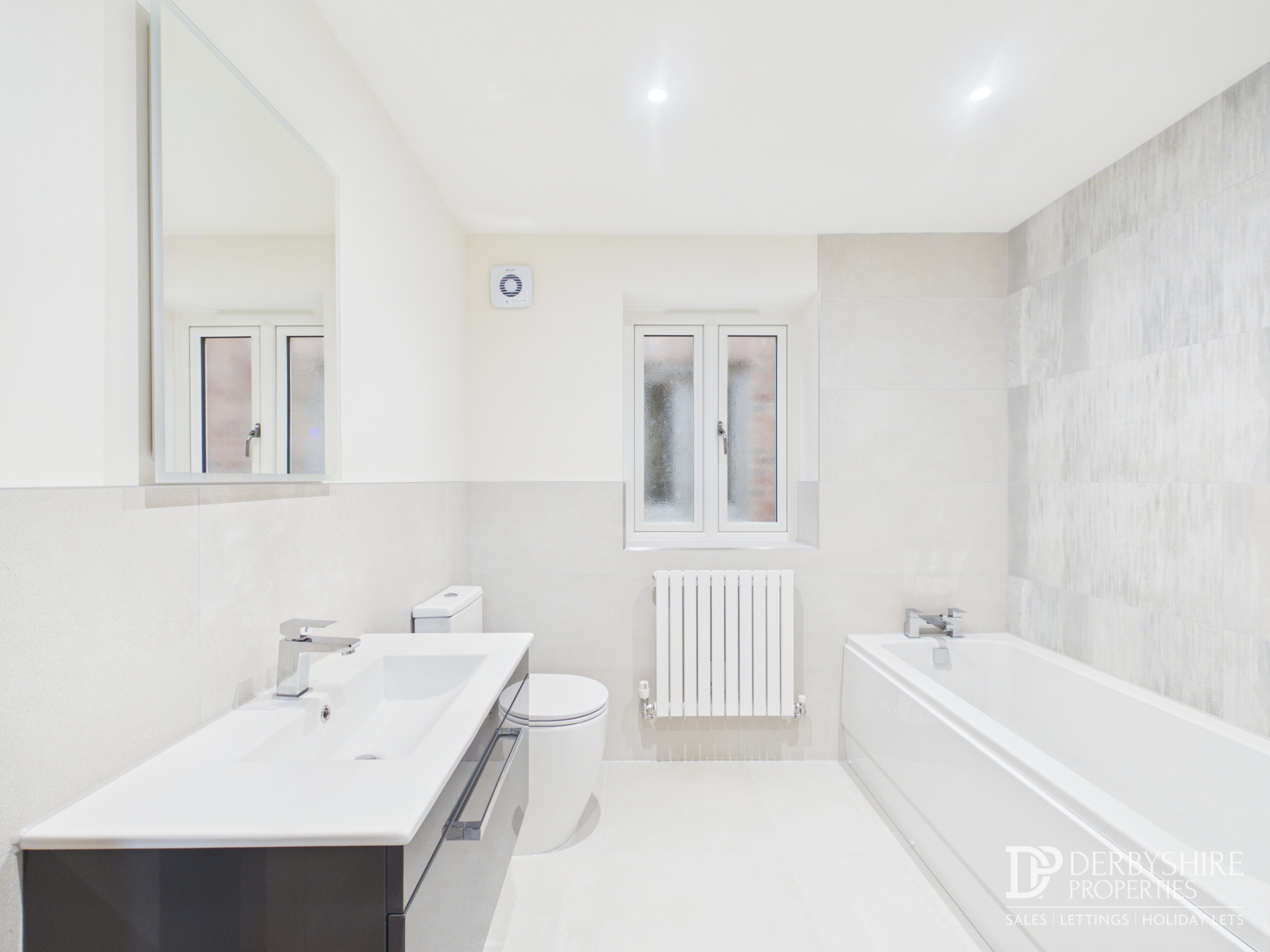 Beautifully appointed modern suite comprising large wall-mounted vanity unit with inset sink, WC and bath. Fully tiled walls, tiled floor with underfloor heating, radiator, ceiling spotlights, extractor fan and obscure double glazed window.