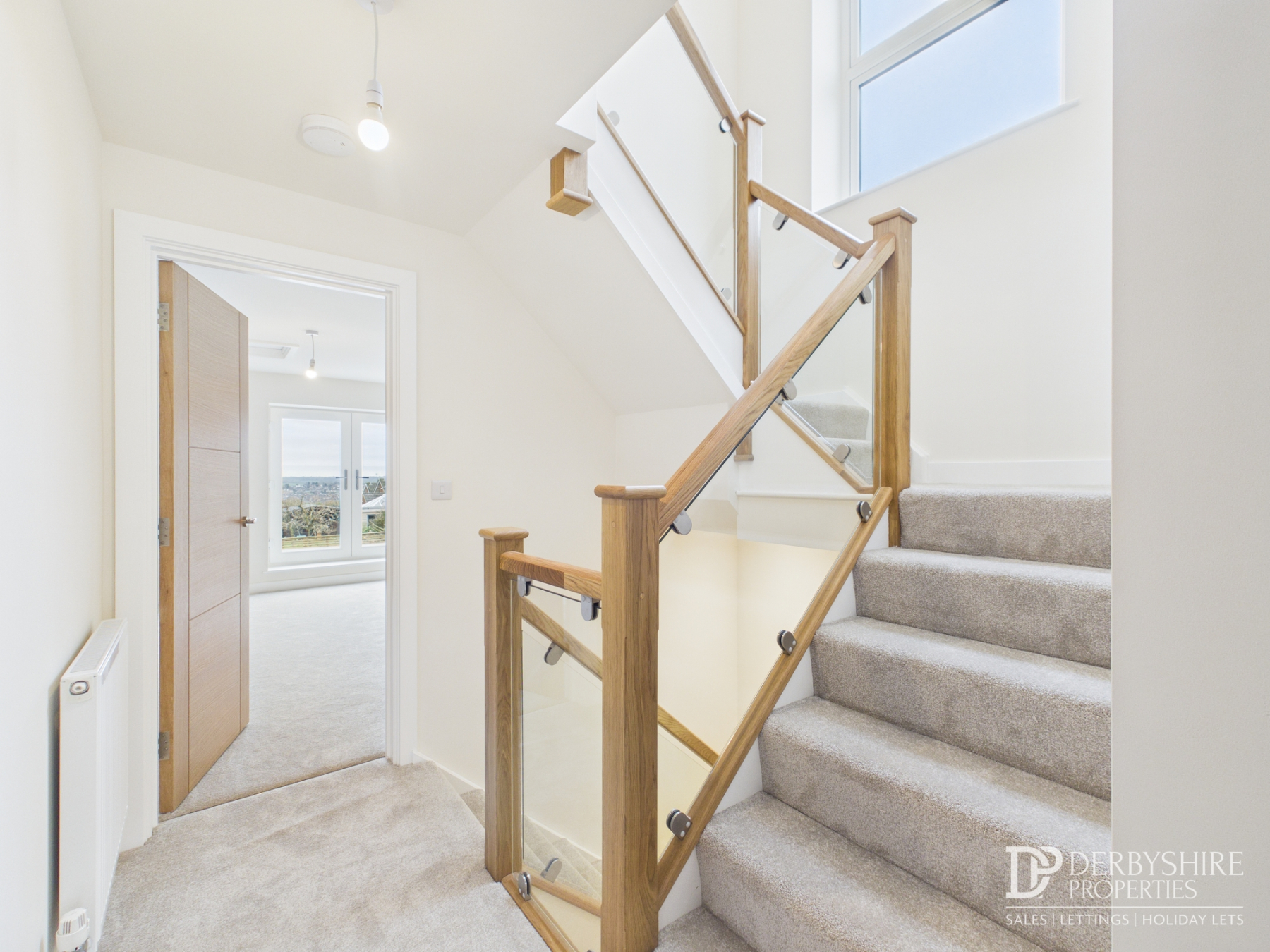 Accessed via the bespoke staircase with glass panel inserts to a light and spacious landing with wall-mounted radiator and staircase rising to the second floor.
