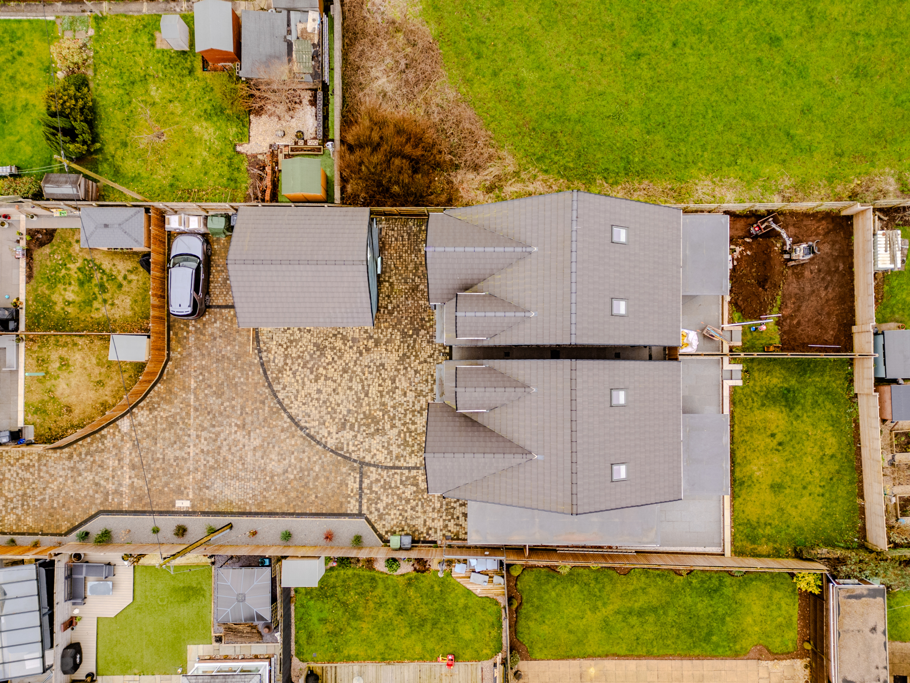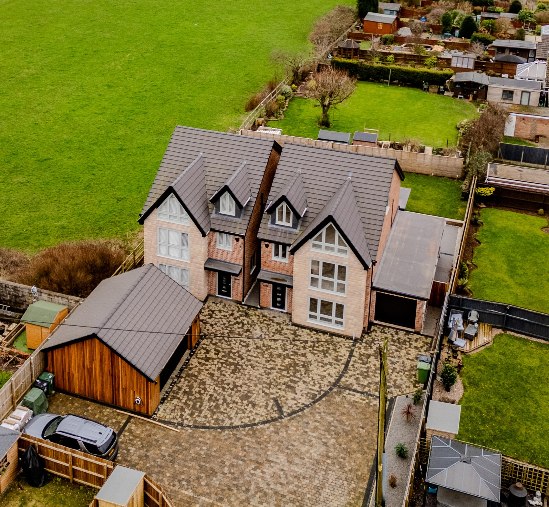 The property is approached via a shared private driveway serving two properties, leading to a low-maintenance block paved frontage providing parking for numerous vehicles. The plot is enclosed by timber fencing.