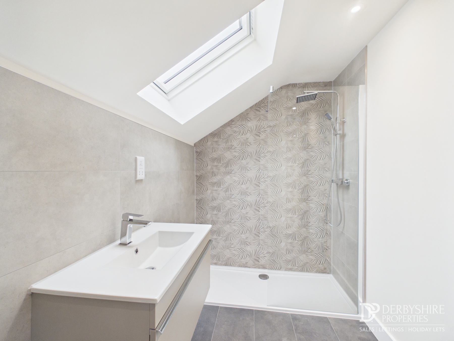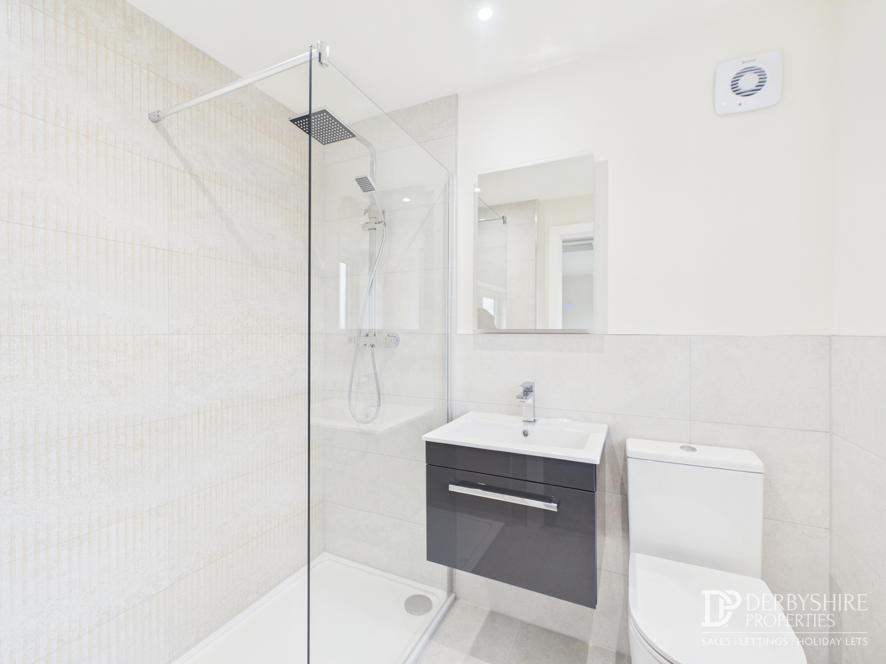 Comprising WC, large wall-mounted vanity unit with inset sink and spacious shower enclosure with mains shower and glass screen. Part tiled walls, tiled floor, radiator, spotlighting and extractor fan.
