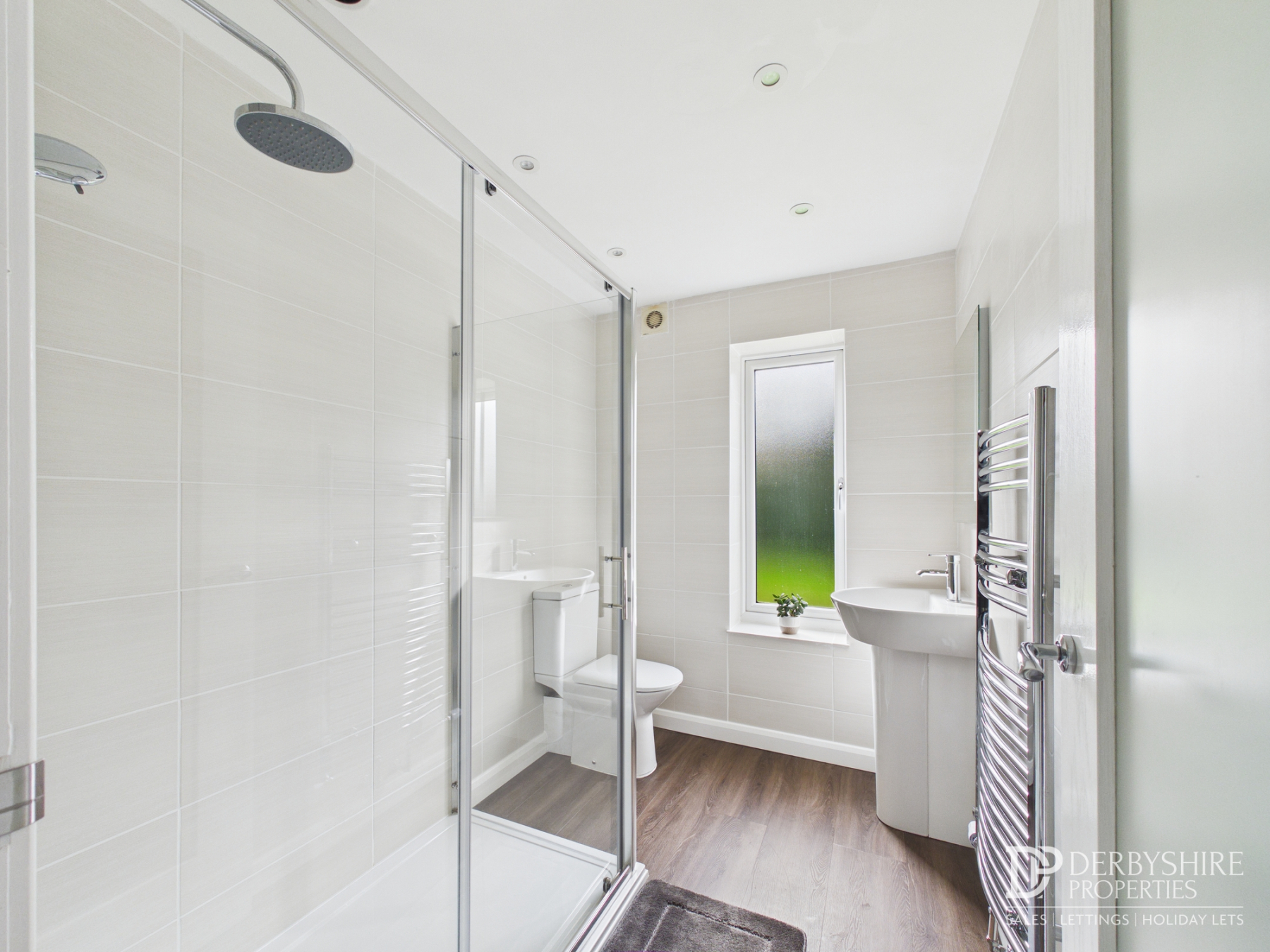 2.41m x 1.76m (7' 11" x 5' 9") A tiled three piece suite including; Walk-in shower, pedestal handwash basin and low level WC. Wall mounted heated towel rail, wood effect flooring, obscured double glazed window to rear elevation and extractor unit completes the space.