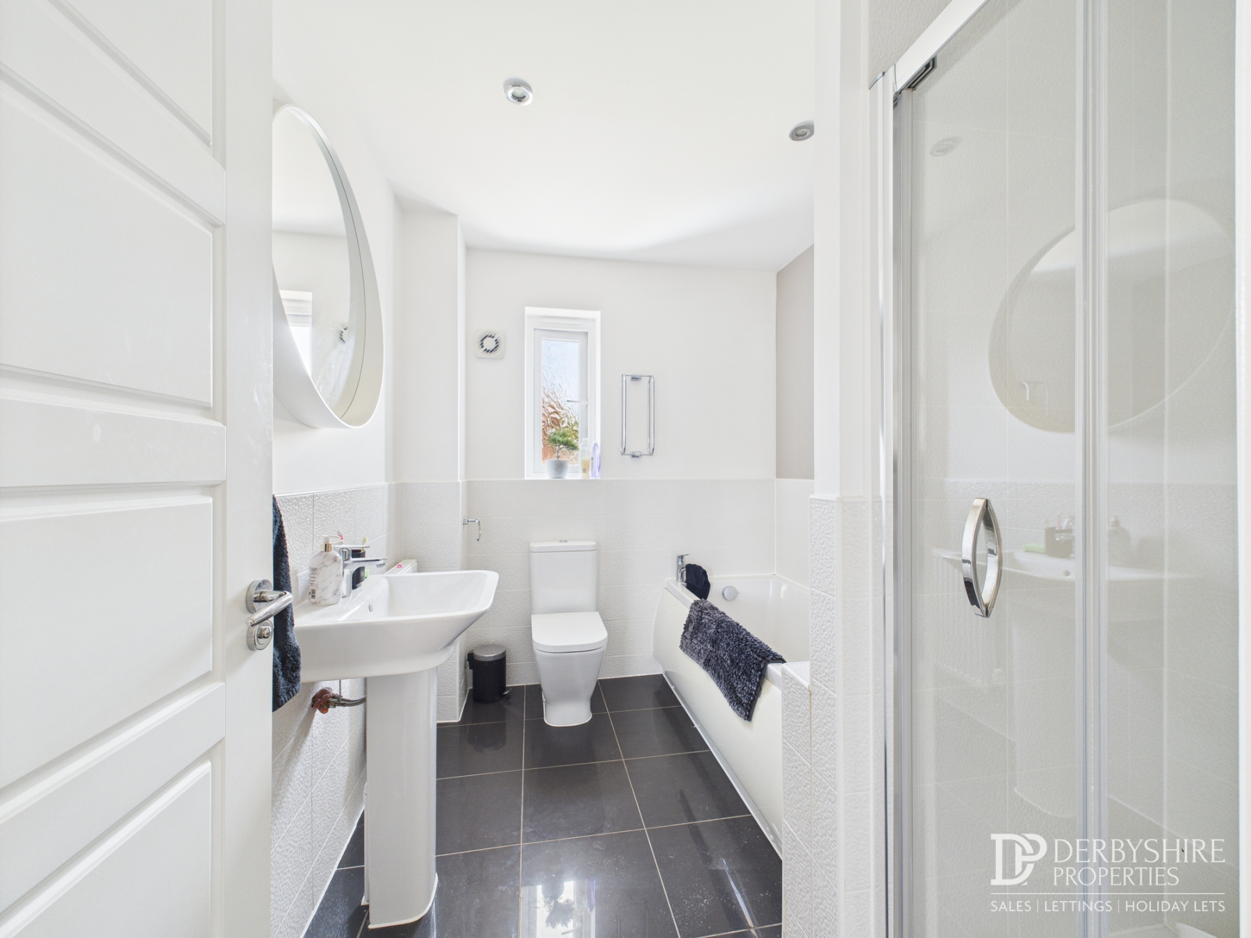 2.65m x 2.02m (8' 8" x 6' 8") A four piece suite including pedestal hand wash basin, shower cubicle, separate bath and a toilet. The bathroom benefits from tiled flooring and partially tiled walls, wall mounted radiator, wall mounted extractor unit and double glazed obscured window to the rear elevation.