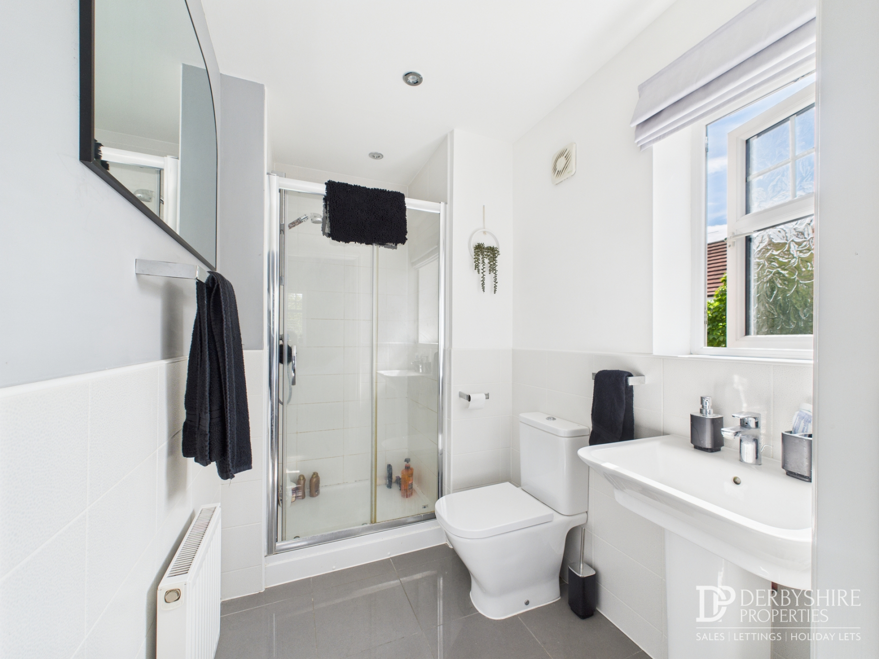2.43m x 1.53m (8' 0" x 5' 0") A three piece suite including walk in shower cubicle, pedestal wash basin and toilet all of which incorporated by tiled flooring and partially tiled walls. Extractor unit is fitted to the ceiling and there is a double glazed obscured window to the side elevation.
