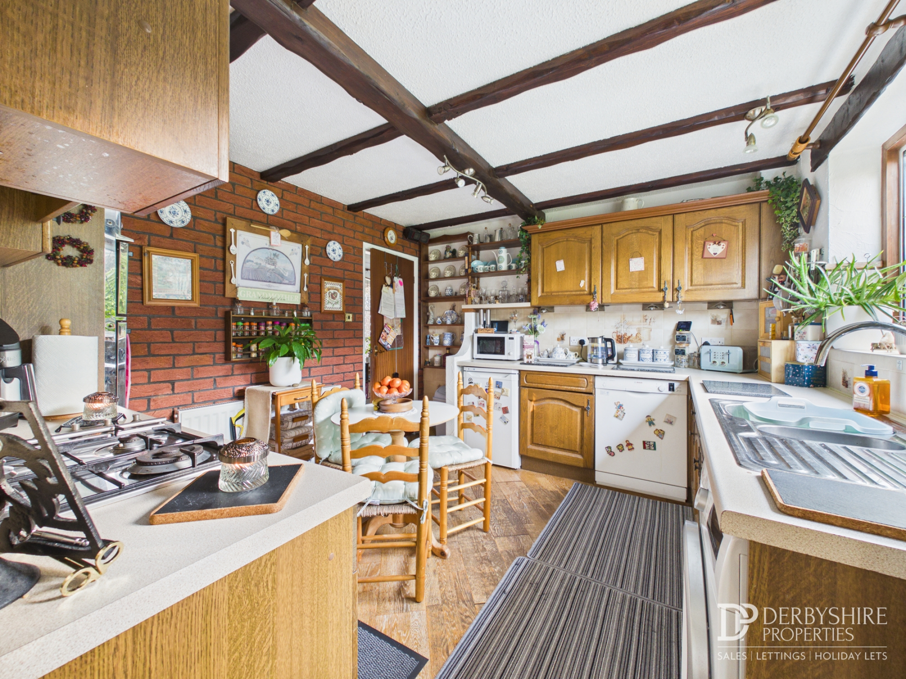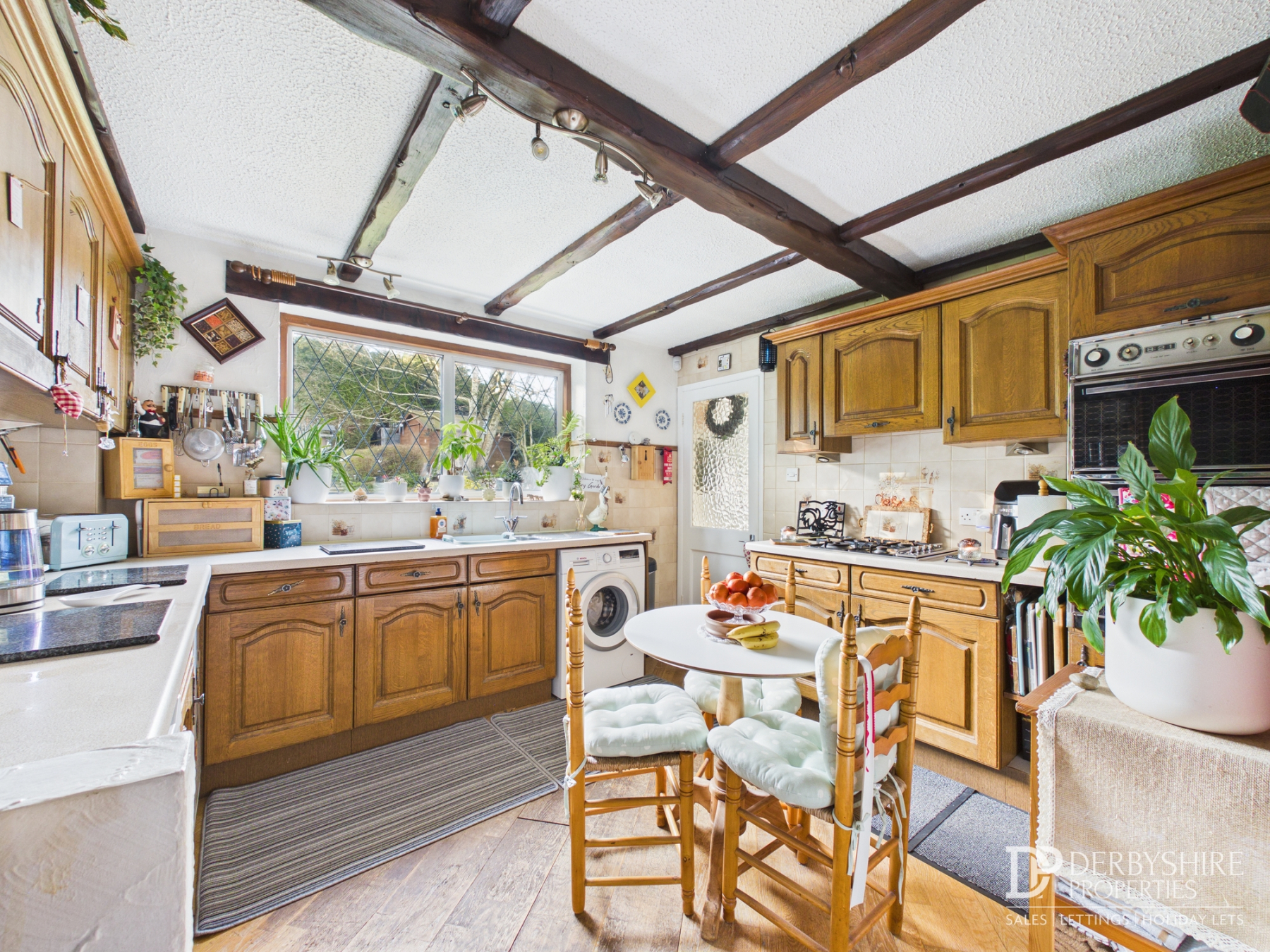 3.49m x 2.22m (11' 5" x 7' 3") Featuring an oak range of base cupboards and eye level units with complimentary worktops over and integrated appliances including; Hob with accompanying extractor hood, double oven/grill and inset one and a half bowl sink. Tiled splashbacks cover the worktops whilst wooden flooring runs throughout. Under counter plumbing for appliances, exposed beams to ceiling and double glazed window overlooking rear garden completes the space.