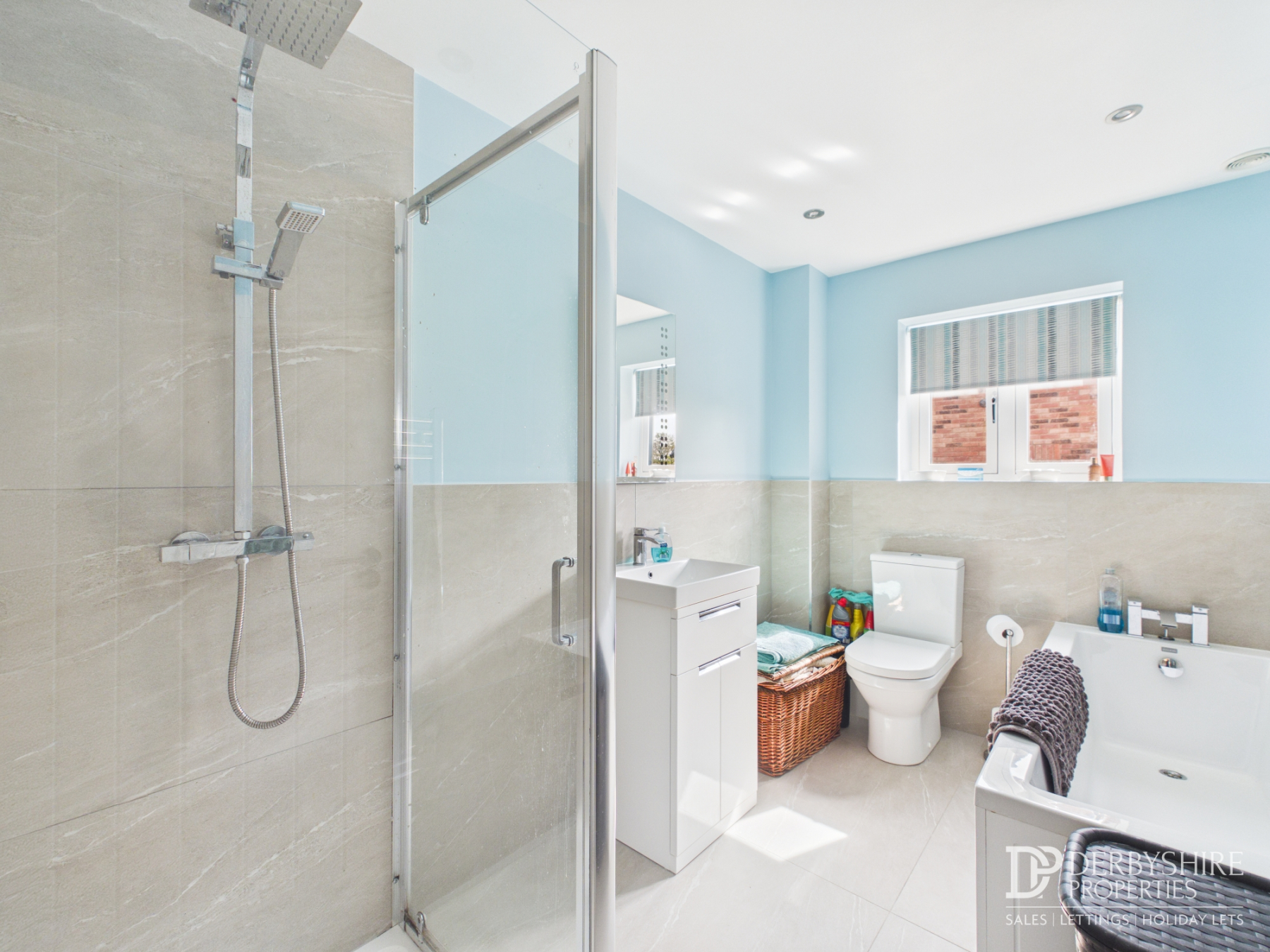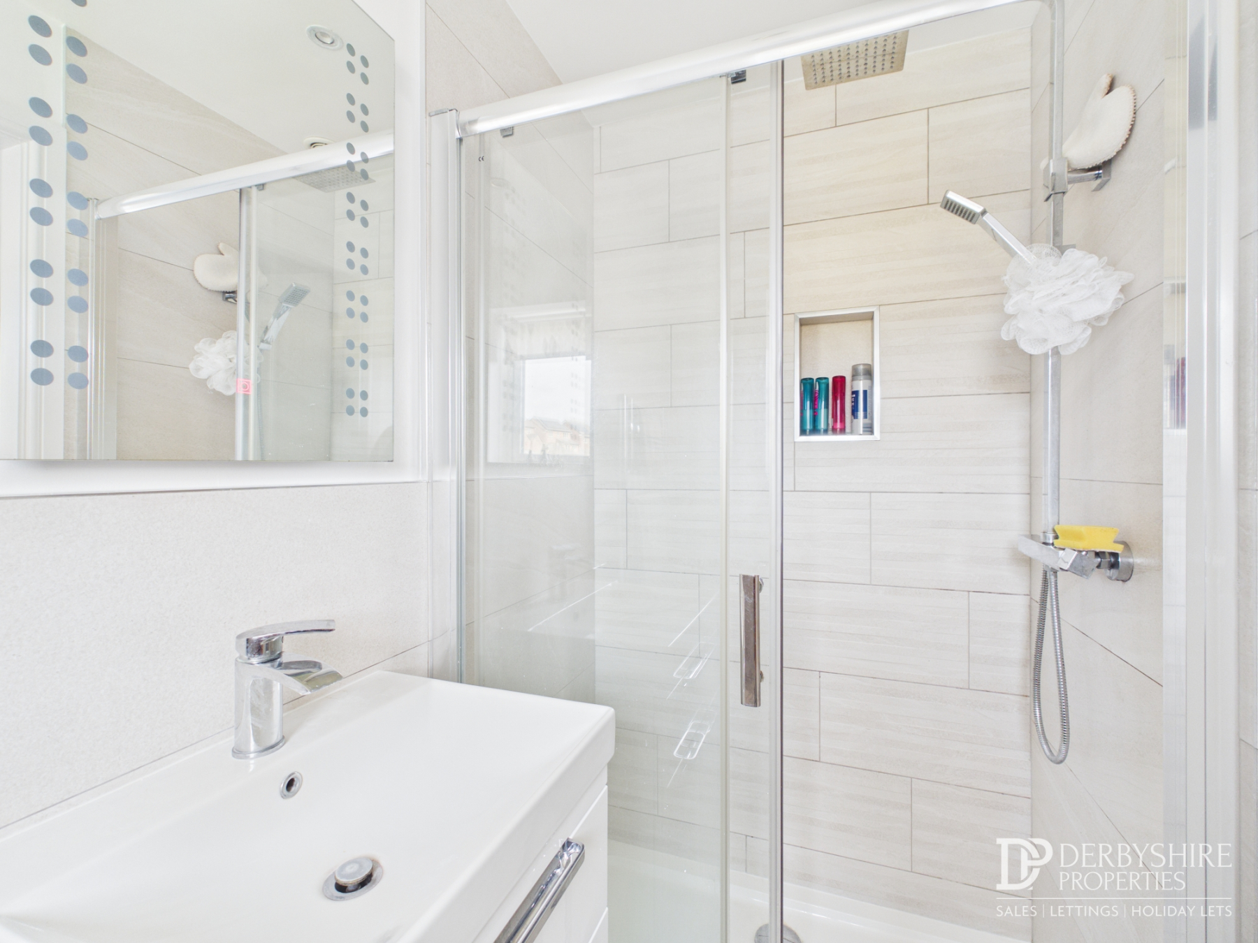 A tiled three piece suite including; Double walk-in shower, vanity handwash basin and low level WC. Wall mounted heated towel rail and triple glazed window to rear completes the space.