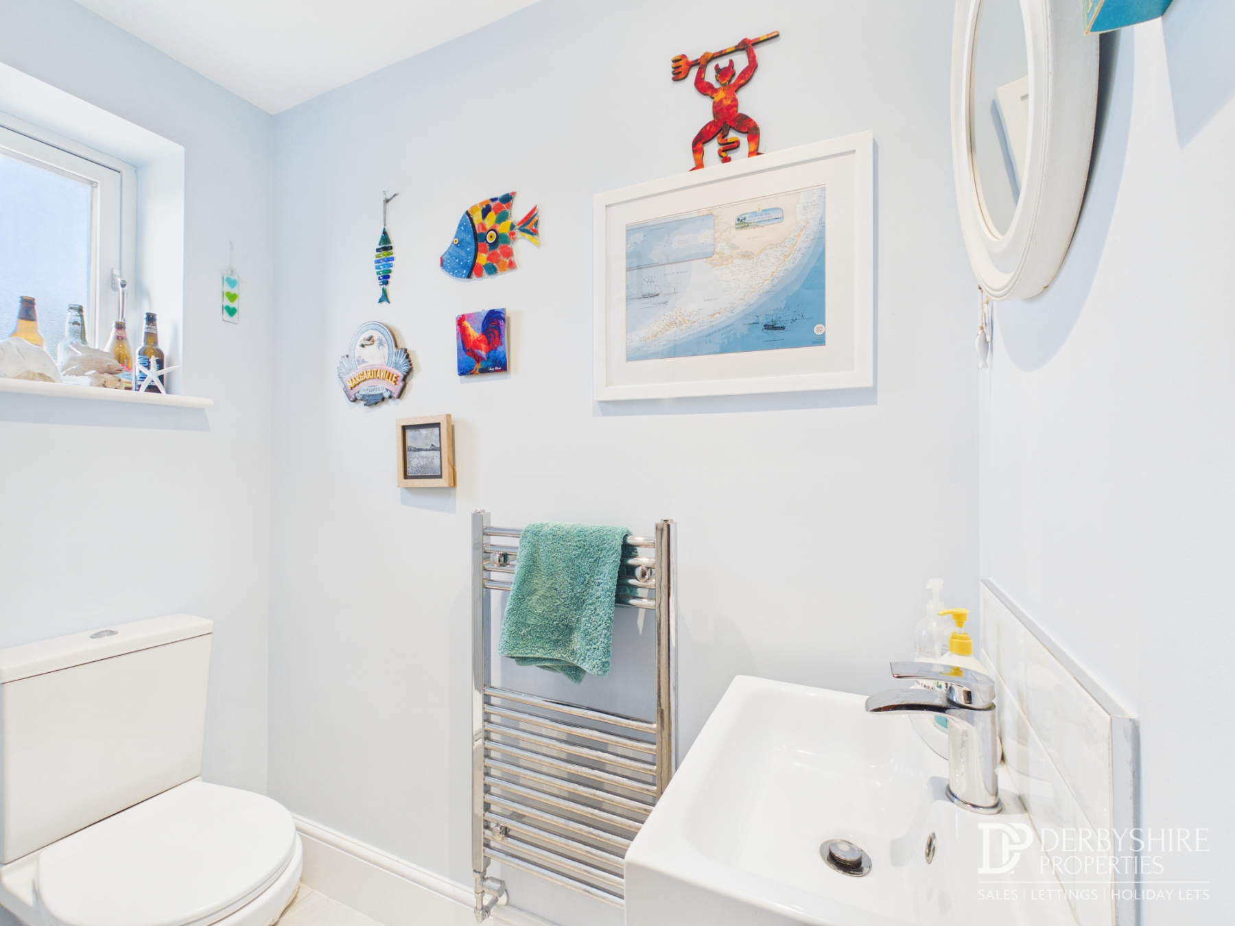 With low level WC and handwash basin with tiled splashback. Triple glazed obscured window to front elevation, wall mounted heated towel rail and tiled flooring complete the space.
