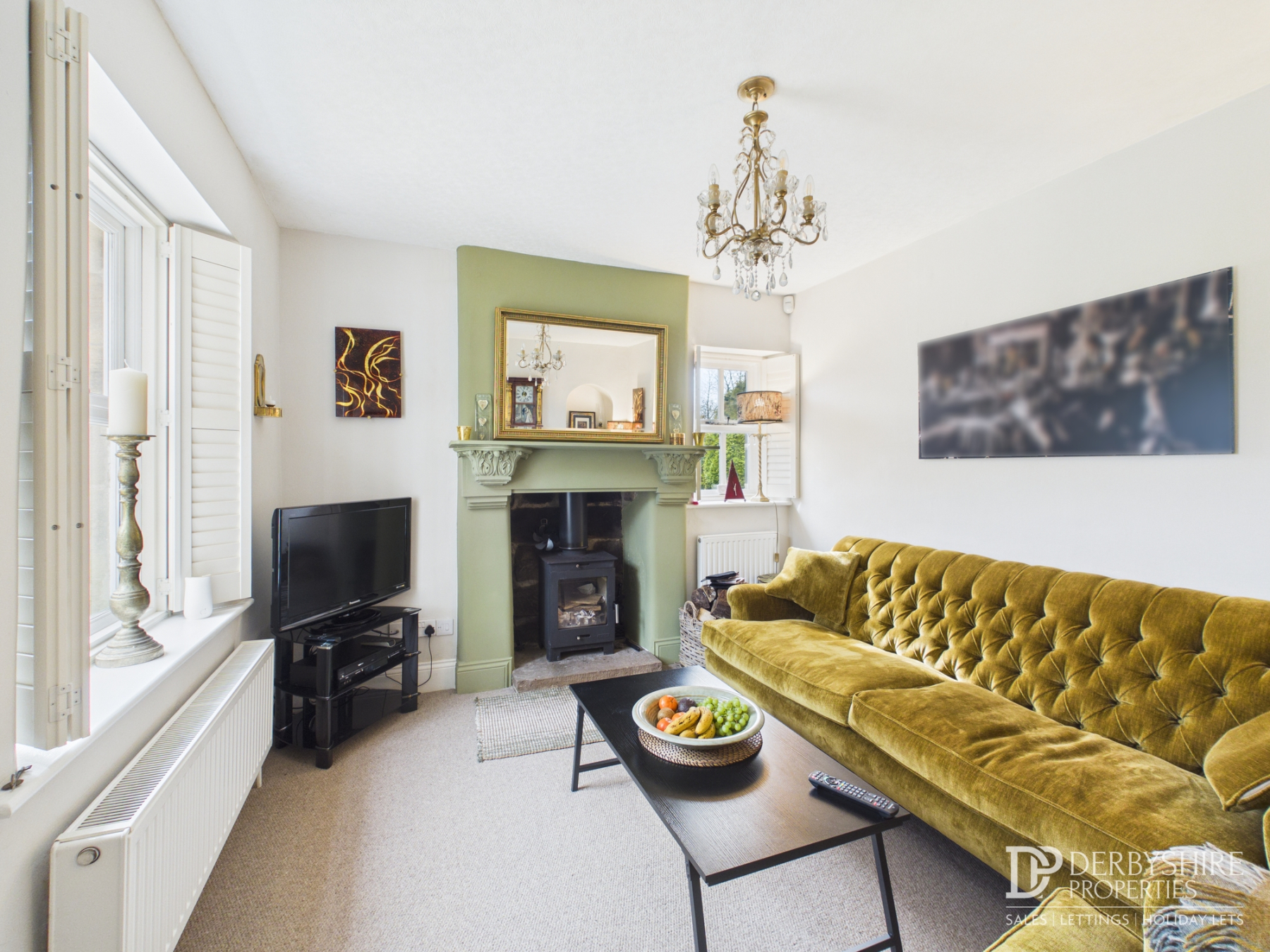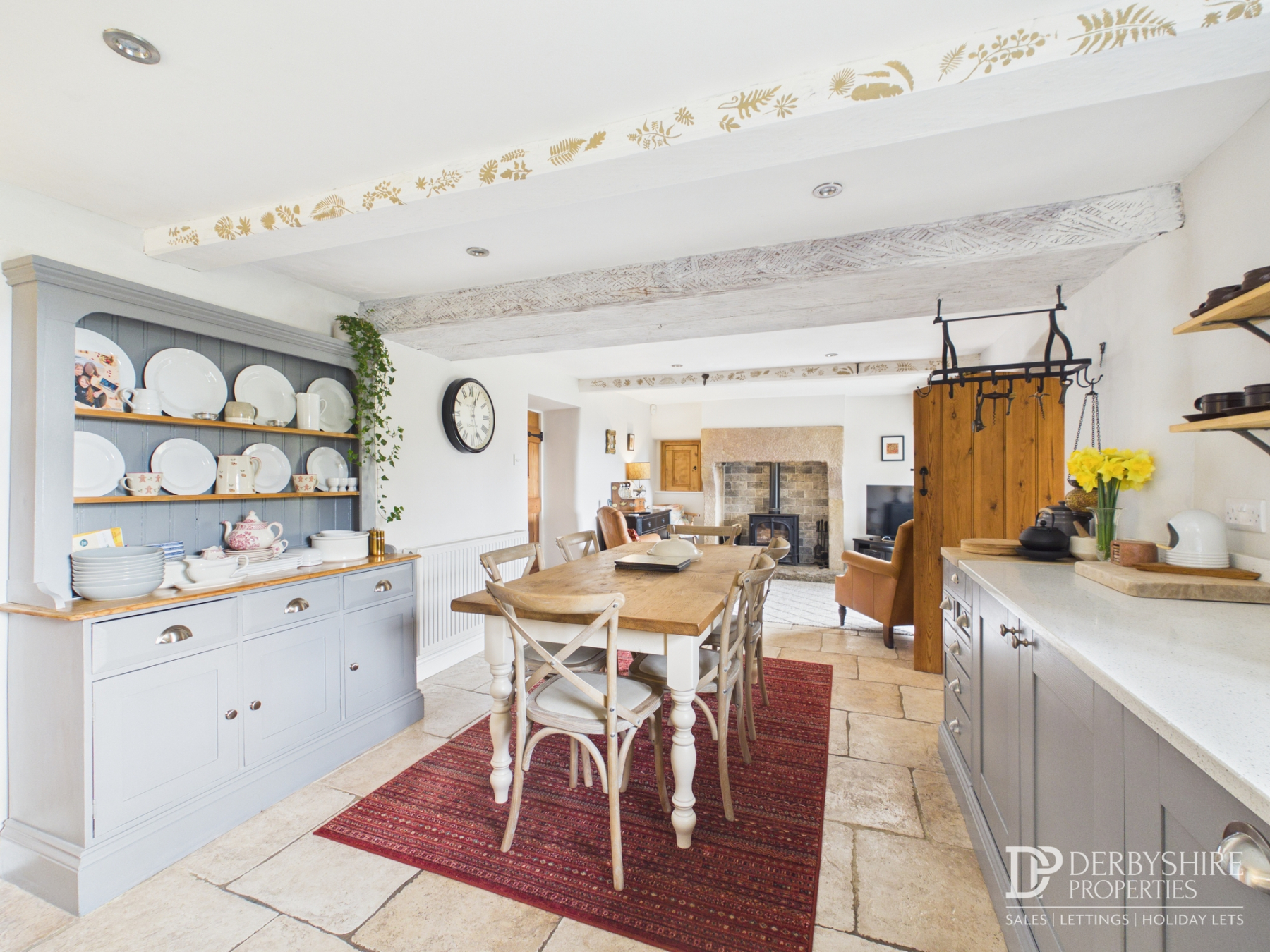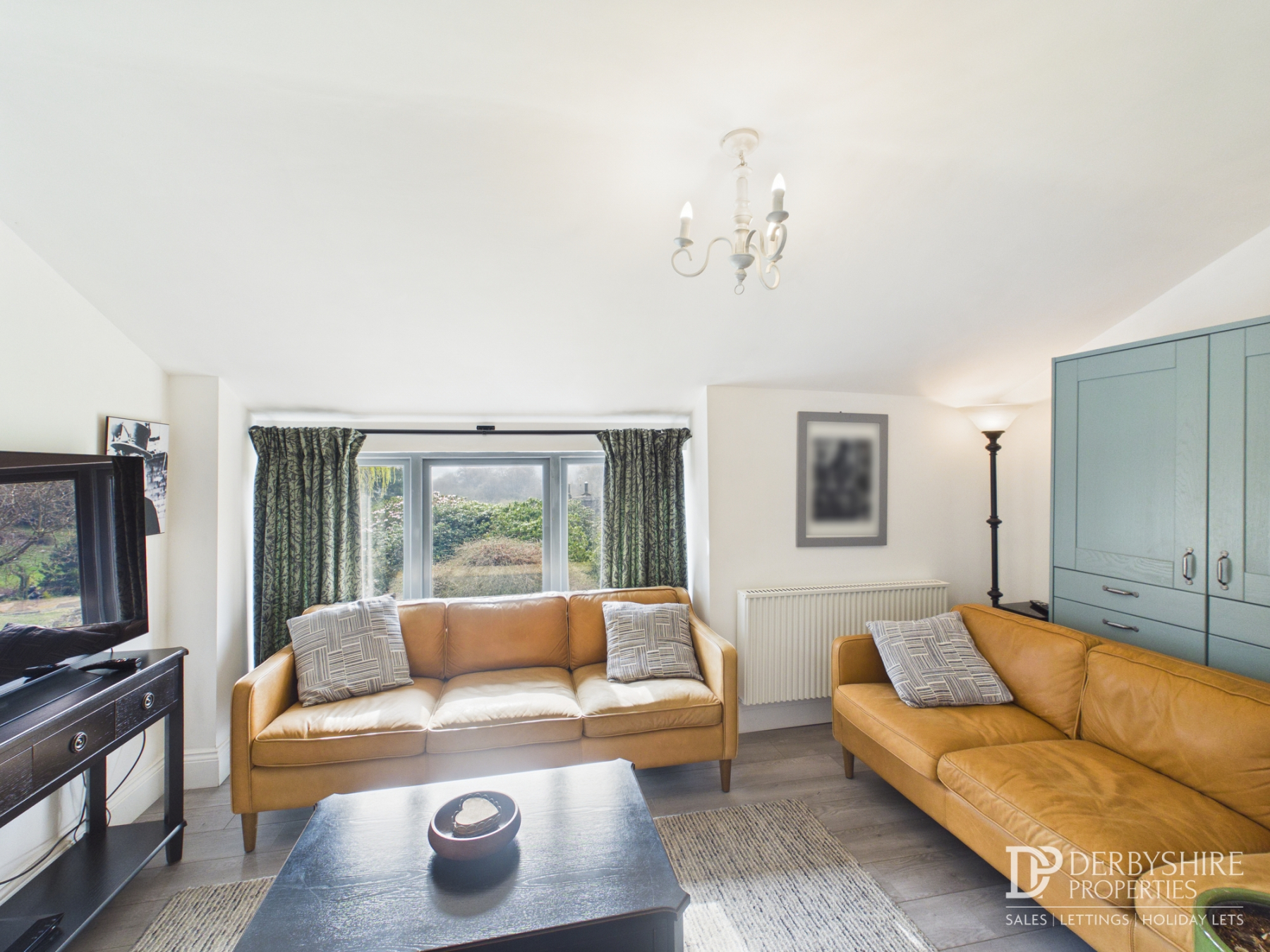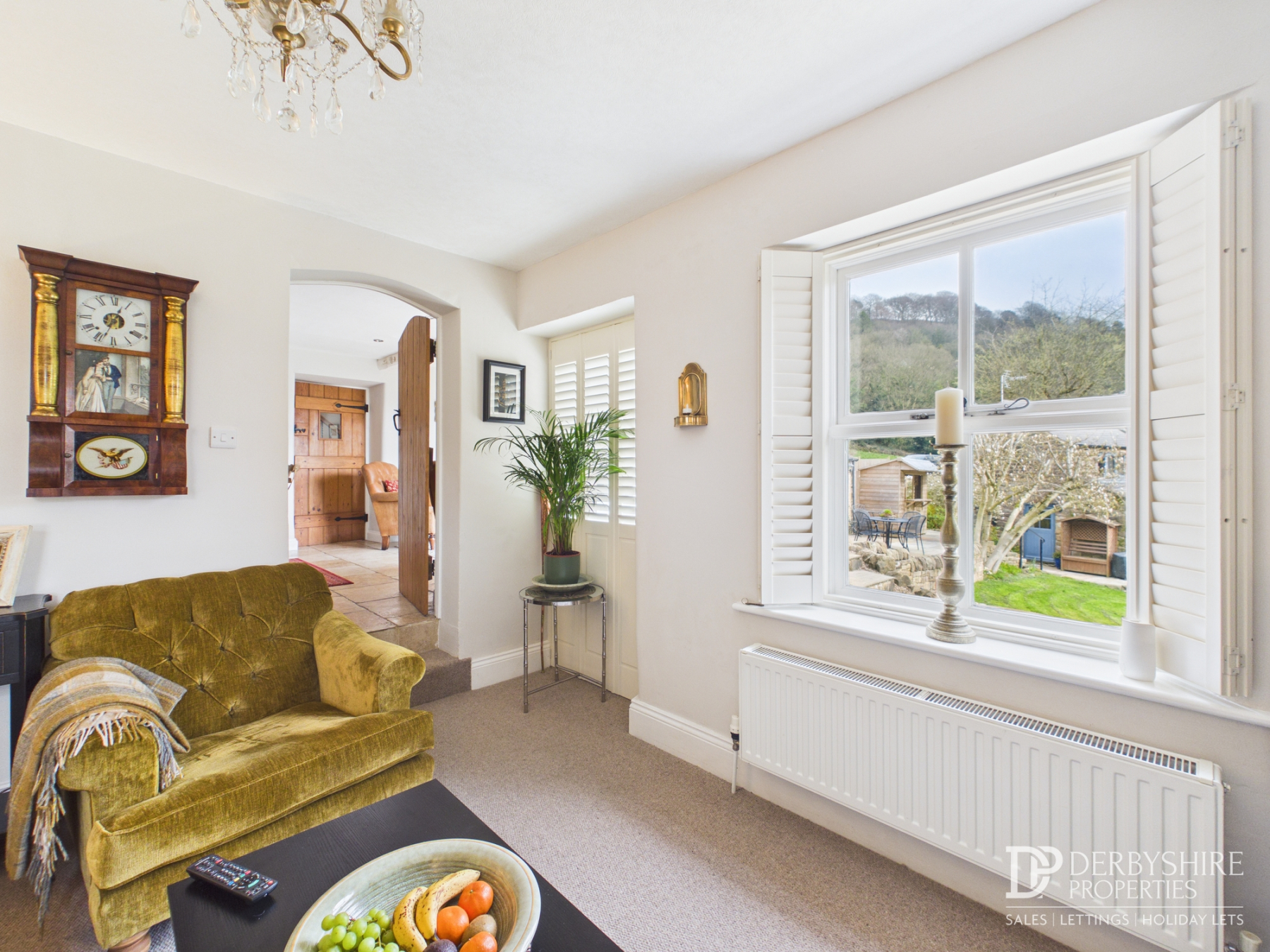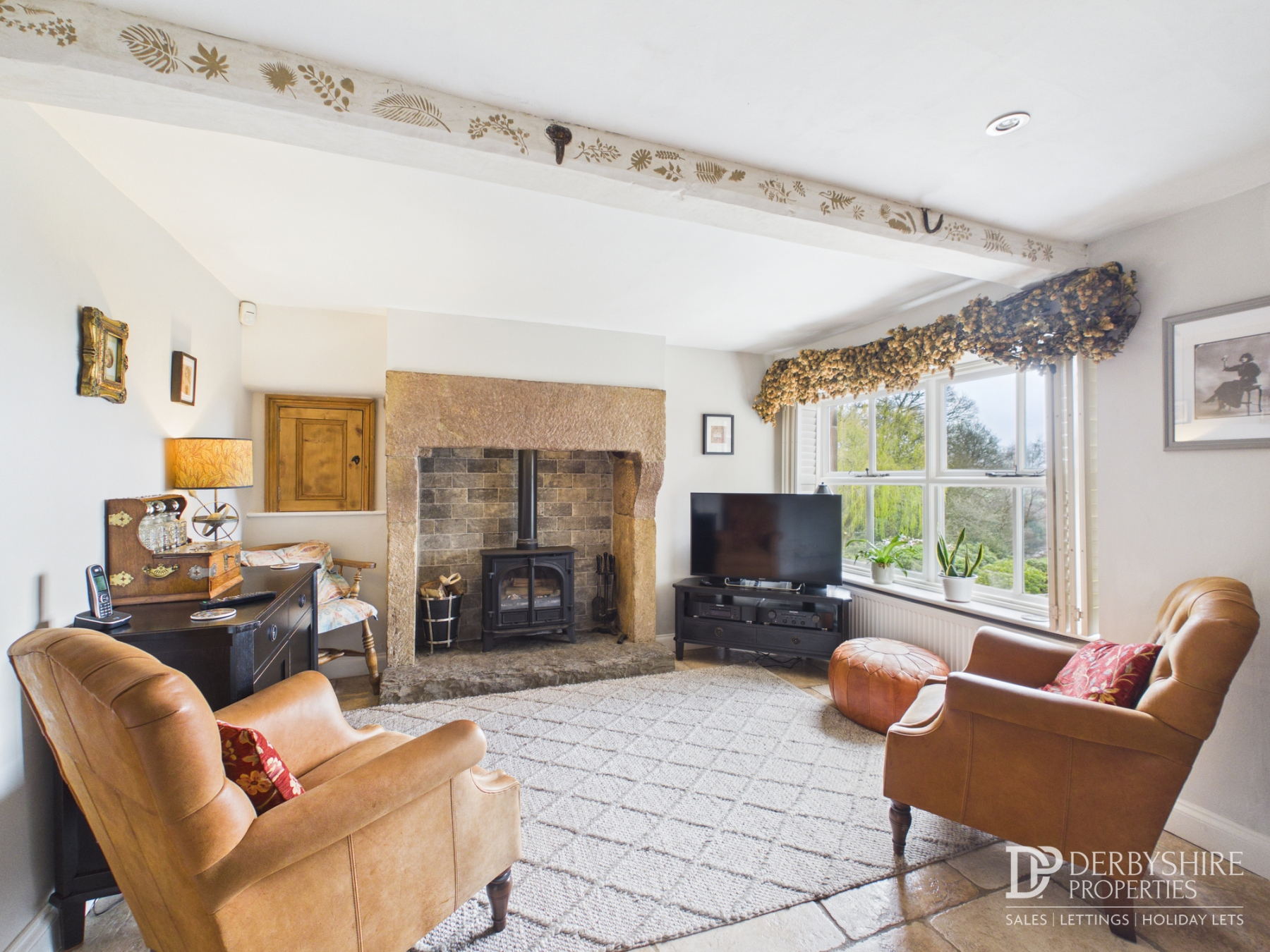 Flowing seamlessly from the kitchen, this space continues the ceramic flooring and enjoys a large window framing superb countryside views. Features include a cast-iron multifuel fire, set within the original Georgian stone surround and raised hearth. There is a radiator, TV points, and recessed ceiling lights.