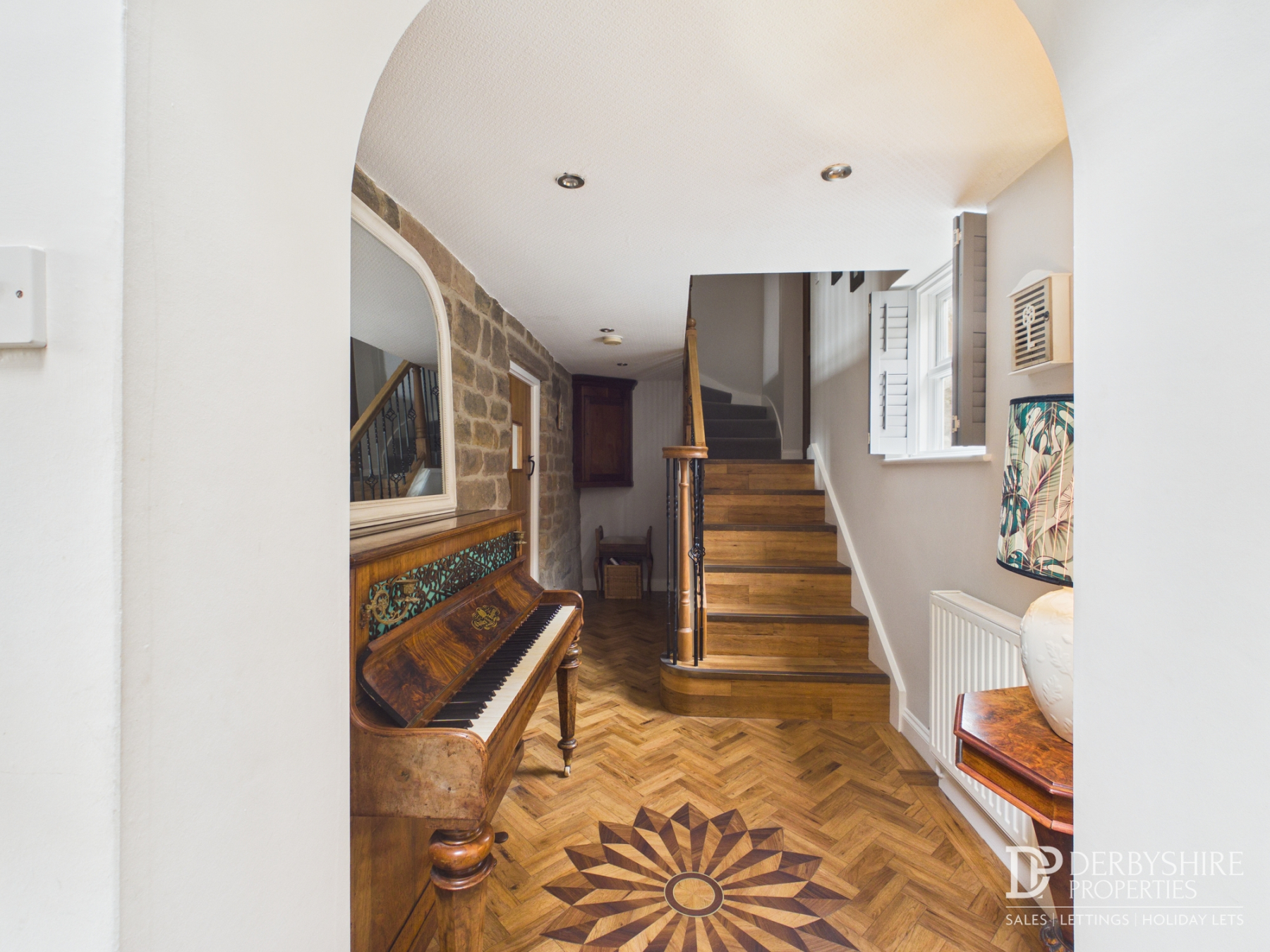 Entered via a hardwood door, this beautifully presented and welcoming space immediately showcases the character of the home. A standout feature is the handcrafted Amtico floor with intricate central detailing. Additional features include a bespoke staircase, exposed stone walling, radiator, recessed ceiling lights, and a window with bespoke shutters.