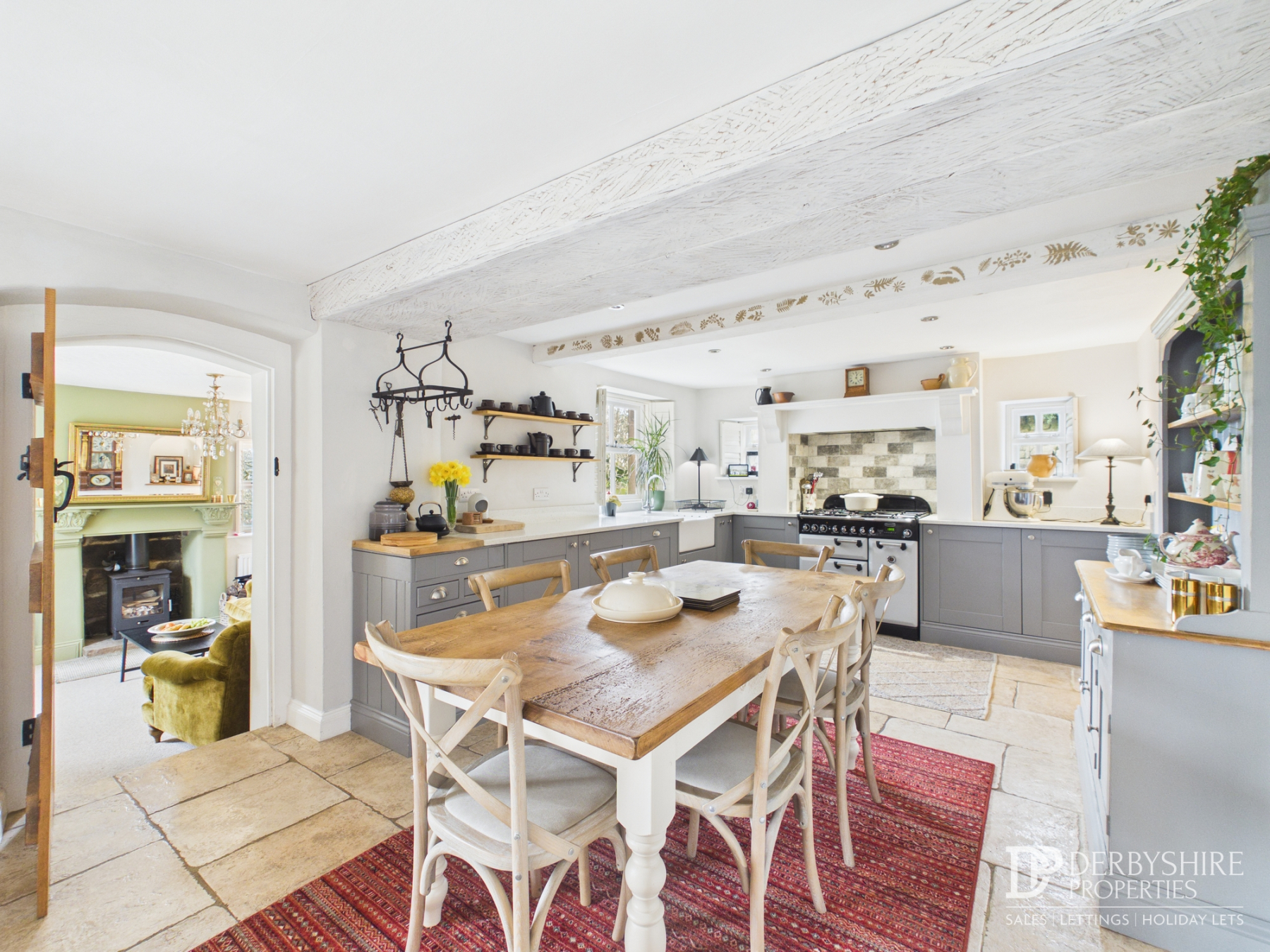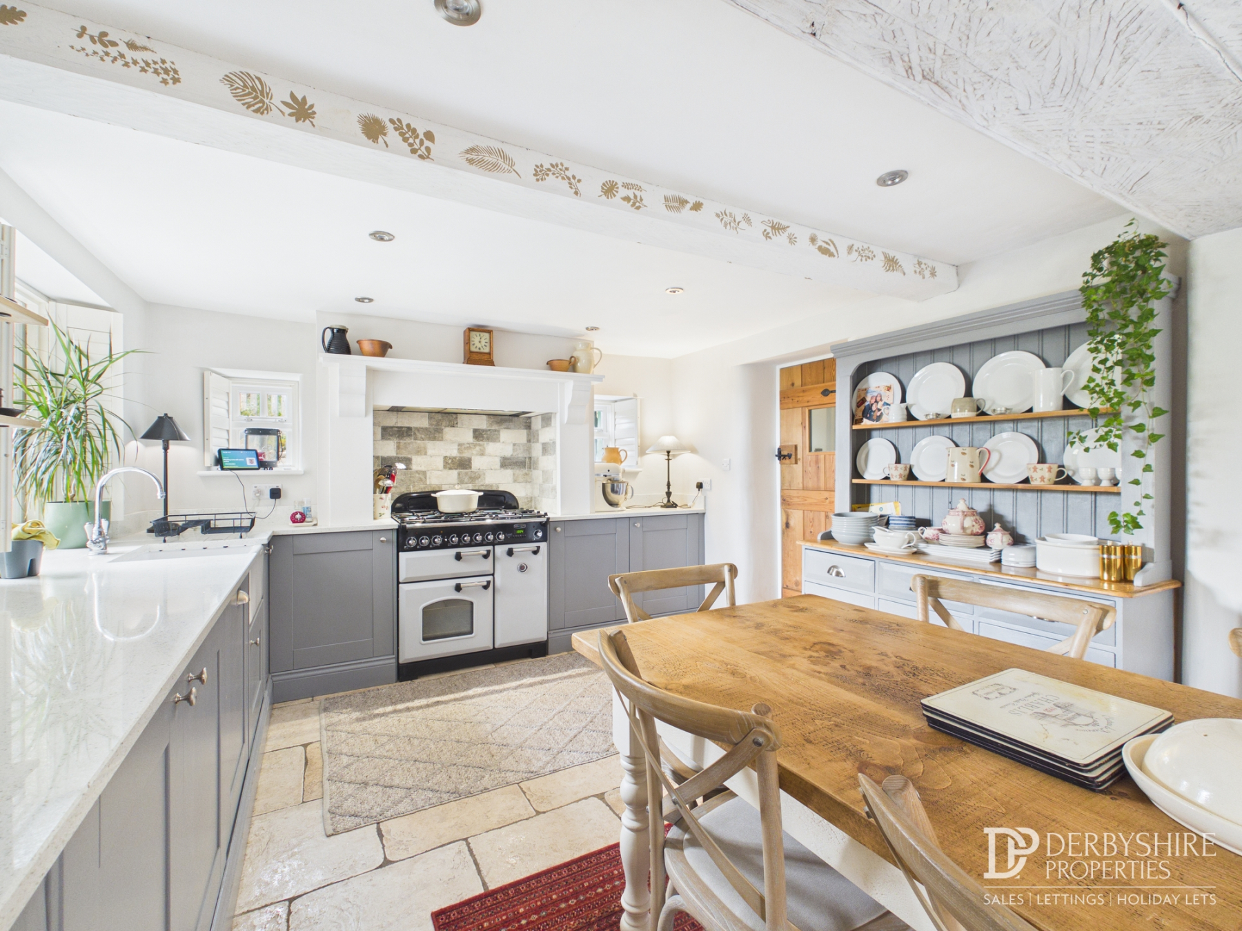 A stunning bespoke shaker-style kitchen with quartz work surfaces incorporating a Belfast sink with mixer tap. There is a freestanding gas range with extractor hood over, an integrated dishwasher and a matching dresser unit. The space benefits from ceramic flooring, recessed ceiling lights, wall-mounted shelving, radiator, and windows with bespoke shutters to the rear and side elevations.