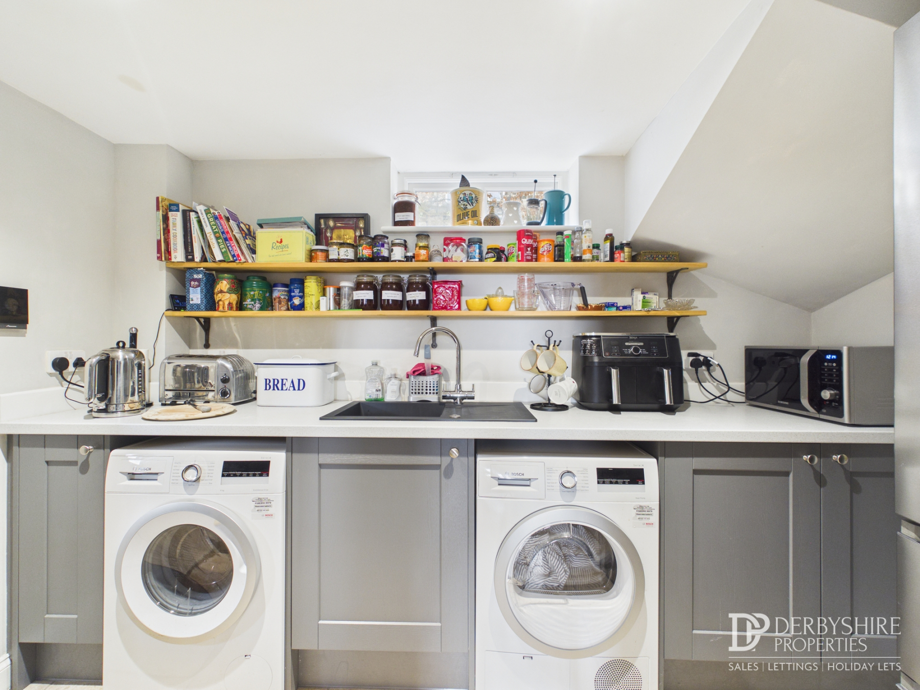 Located off the kitchen and fitted with matching units and work surfaces incorporating a sink with mixer tap. There is space and plumbing for a washing machine and tumble dryer, additional space for a fridge/freezer, wall-mounted shelving, radiators, and ceramic flooring. A stable door provides access to the rear garden, alongside windows to the front and side elevations and a useful storage cupboard containing the gas boiler and services.