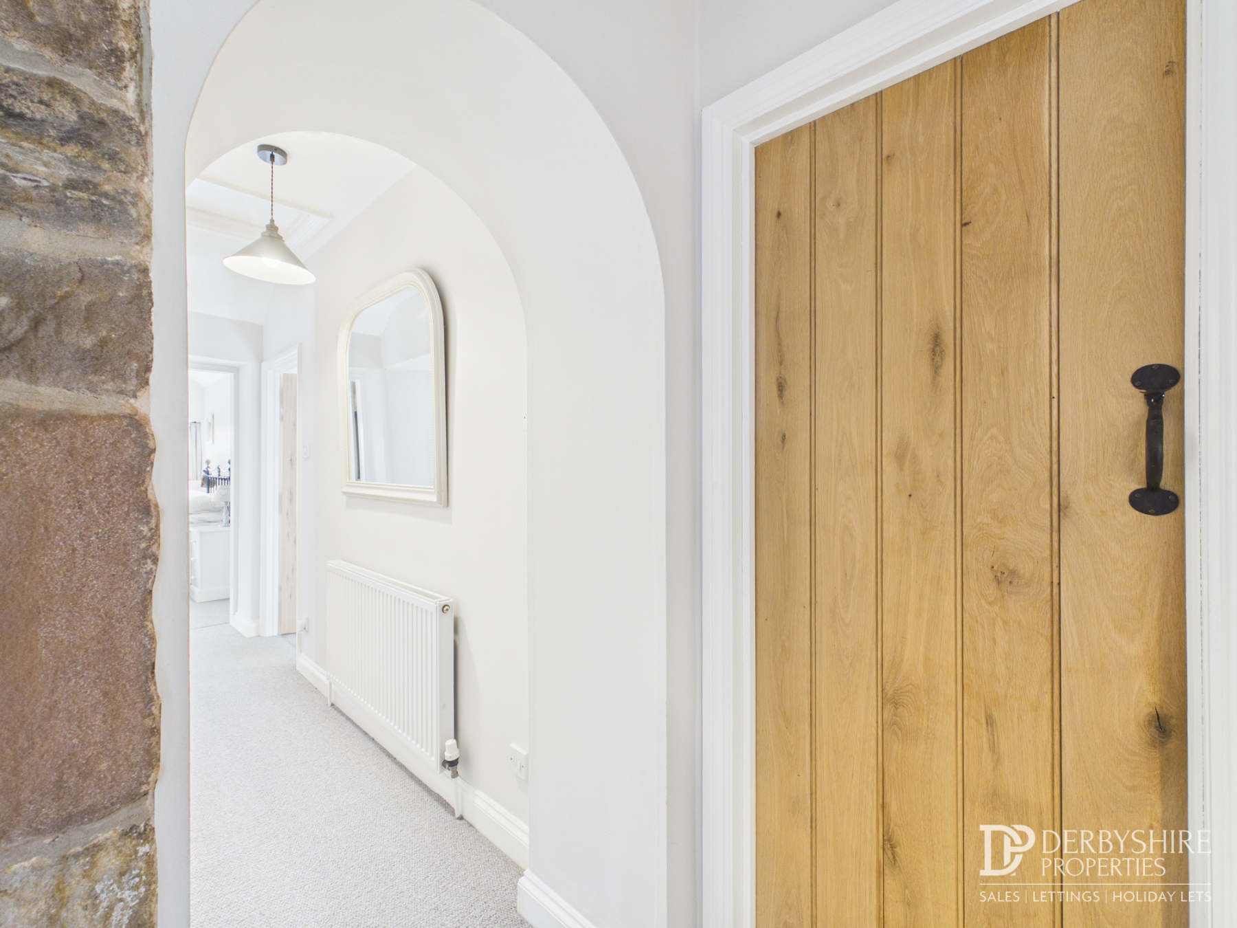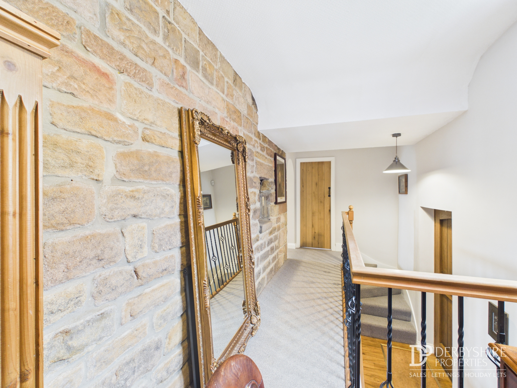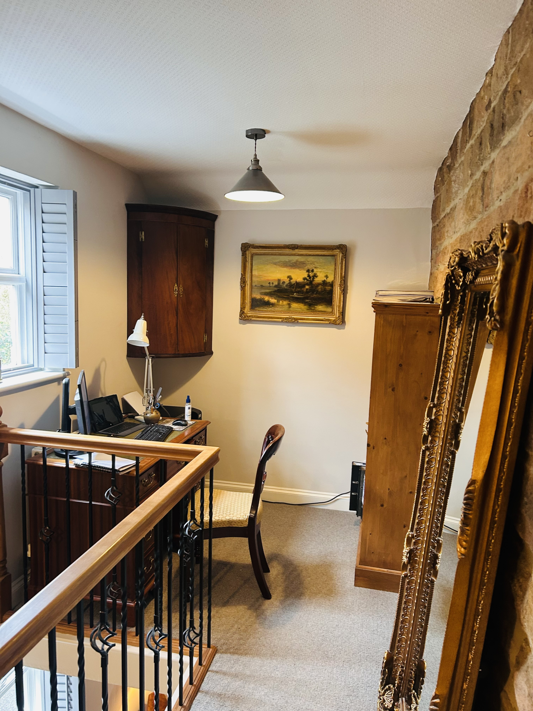 Accessed via a bespoke staircase, the landing offers space for a study area and features a window with bespoke shutters and an exposed stone wall, adding charm and character.