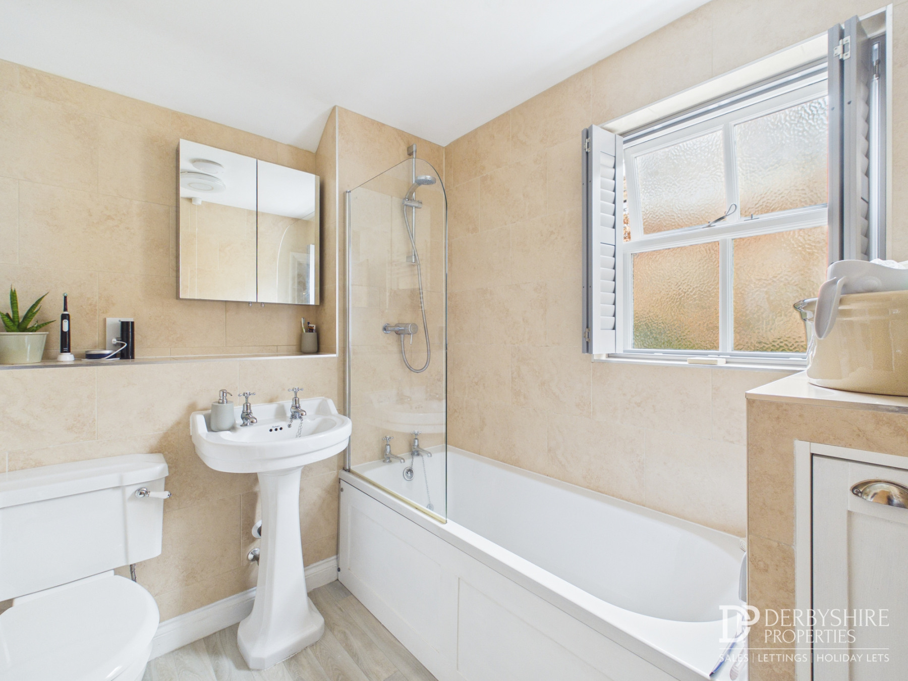Comprising a three-piece suite including - WC, pedestal wash hand basin, and a panelled bath with mains-fed shower over and glass screen, finished with porcelain tiled walls, vinyl flooring, heated towel rail, extractor fan, and a double glazed obscured window with shutters.