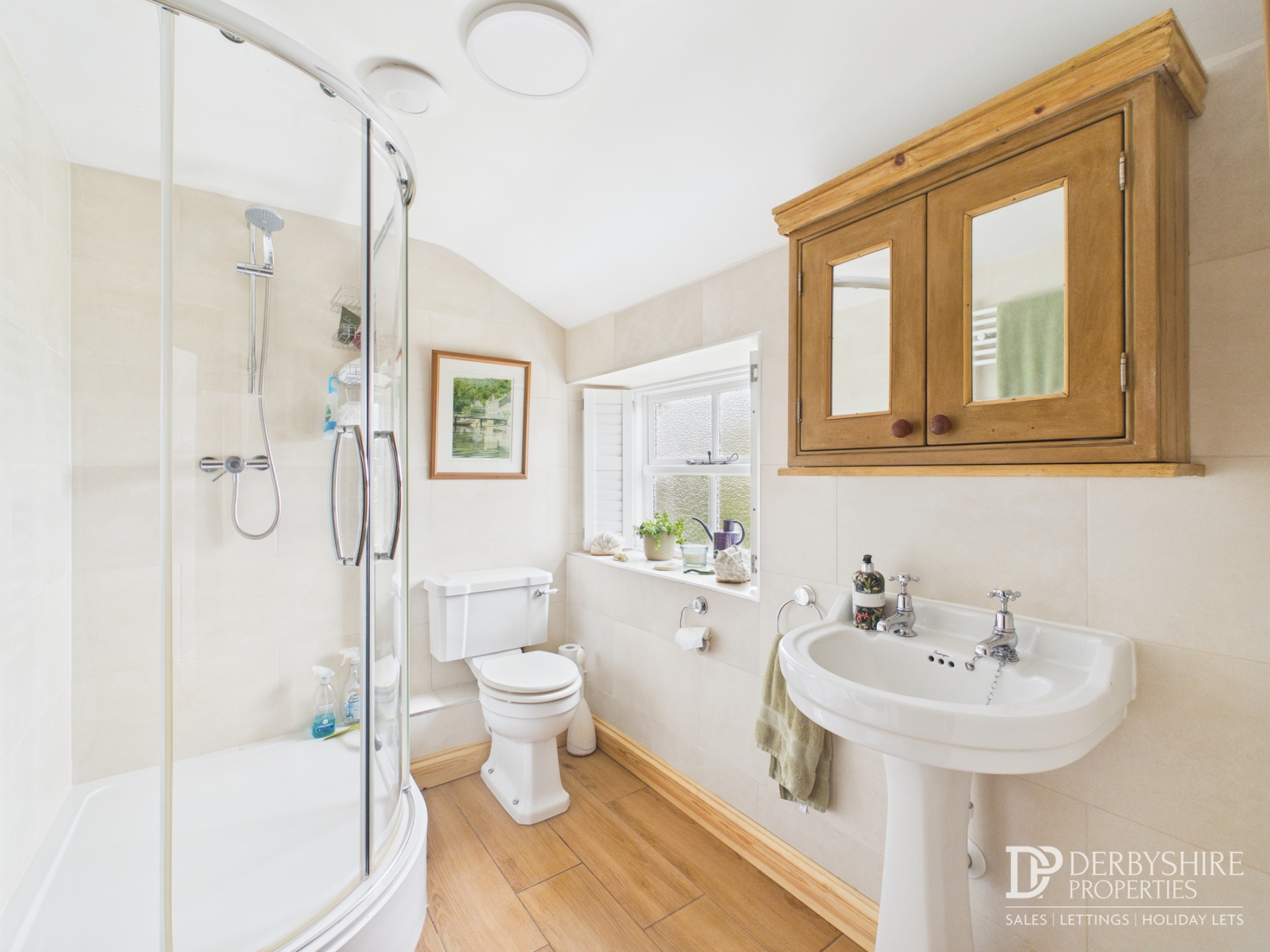 Fitted with a modern three-piece suite comprising WC, pedestal wash hand basin, and a large shower enclosure with mains-fed shower and attachment. The room is finished with ceramic wood effect flooring, a heated towel rail, extractor fan, and a double glazed obscured window with bespoke shutters.