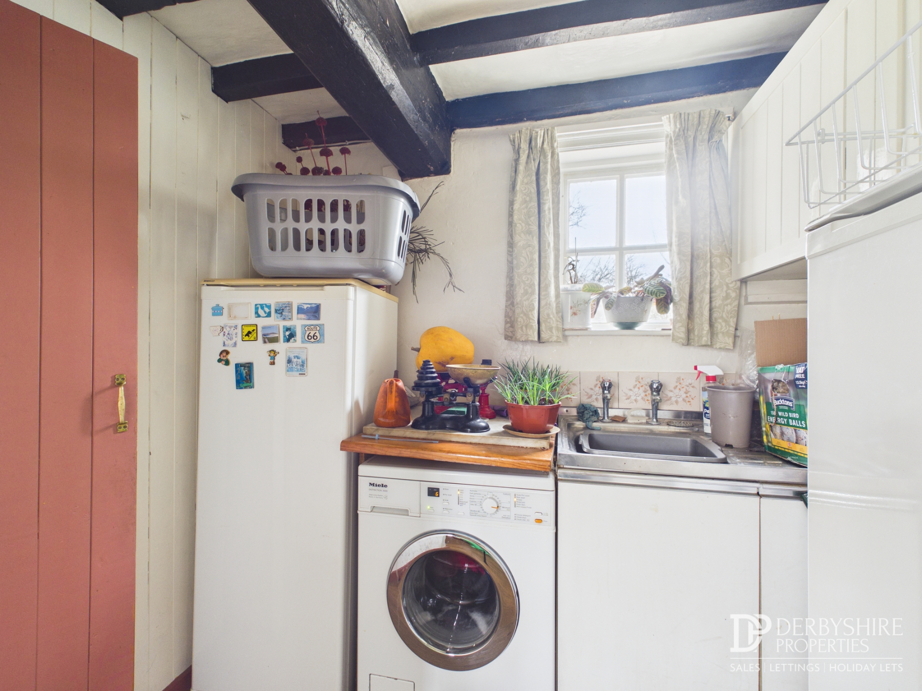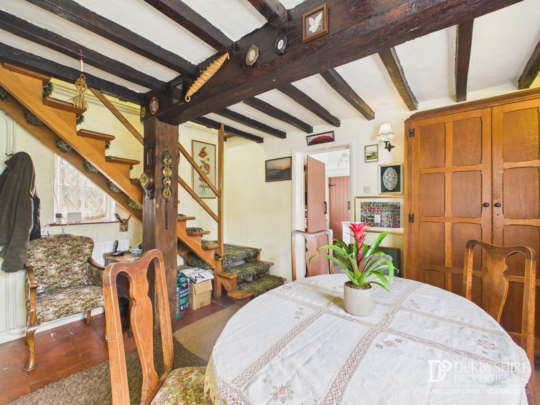 A versatile additional reception room, currently utilised as a dining area. Retaining the cottage feel with exposed beams, it benefits from a rear-facing window, radiator, vinyl flooring, and an open archway into the utility area.