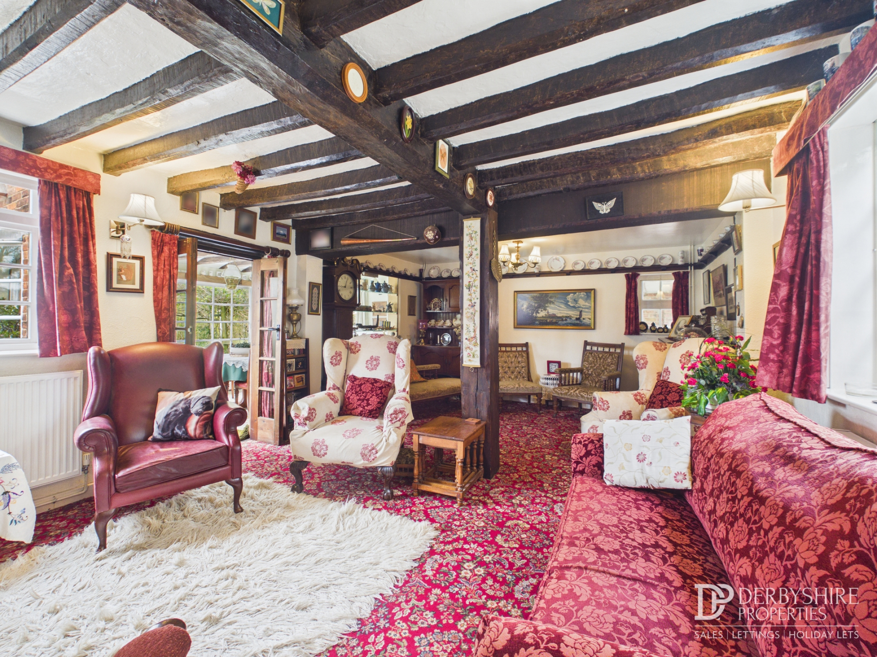 A substantial and beautifully presented main lounge featuring exposed beams and a grand open fireplace with canopy and beam, creating a superb focal point. This dual-aspect room enjoys windows to the front (secondary glazed), rear, and side elevations, flooding the space with natural light. Three radiators and double doors lead through to the sunroom.