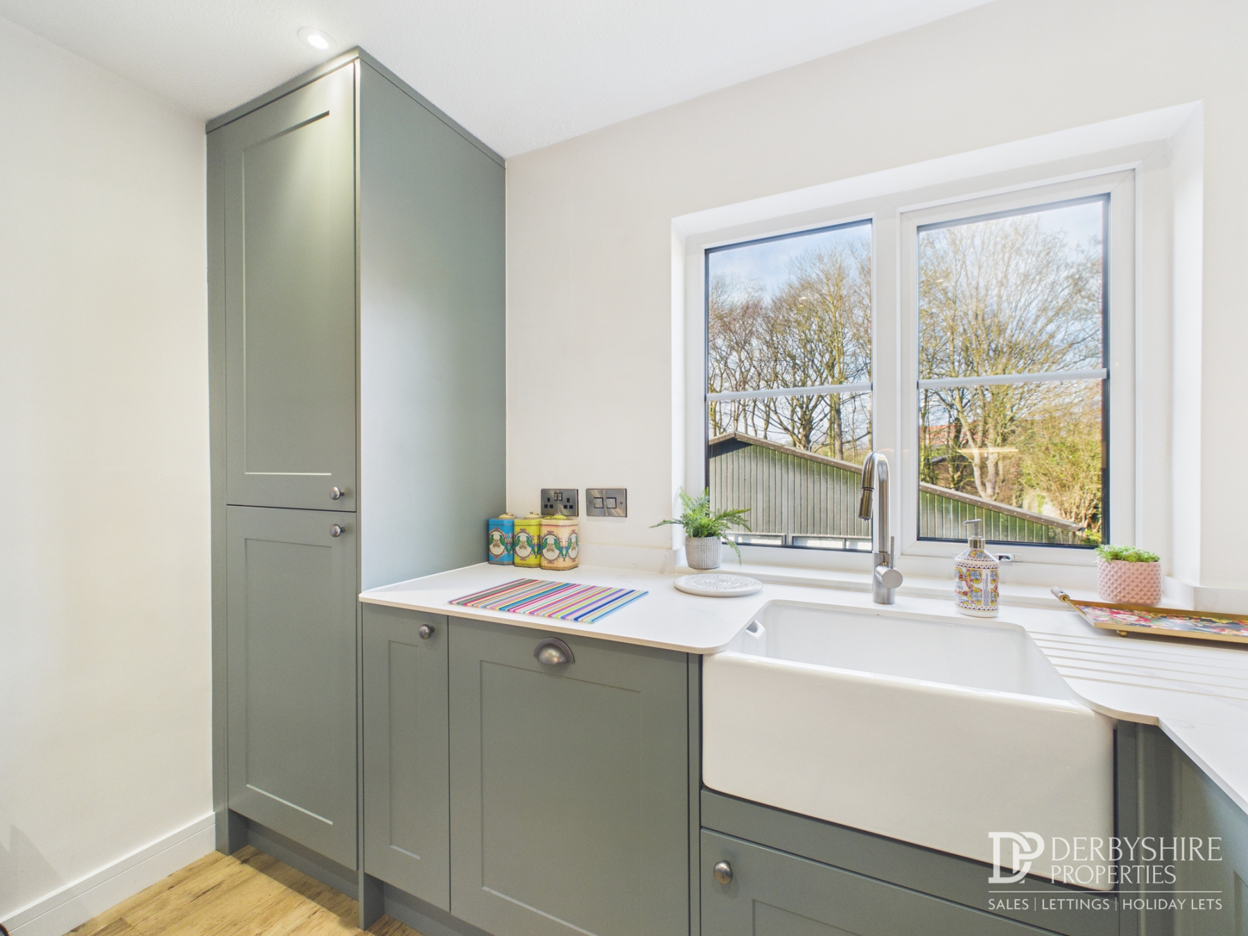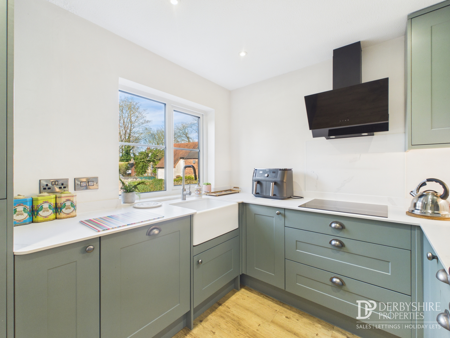 Comprising of a range of one and base mounted 'shaker' units with moulded modern worksurfaces incorporating a Belfast sink. Integrated induction hob with modern extractor over, integrated fridge/freezer, integrated dishwasher. Tiling walls, LTV floor covering, spotlights to ceiling, double glazed window and under cupboard lighting.