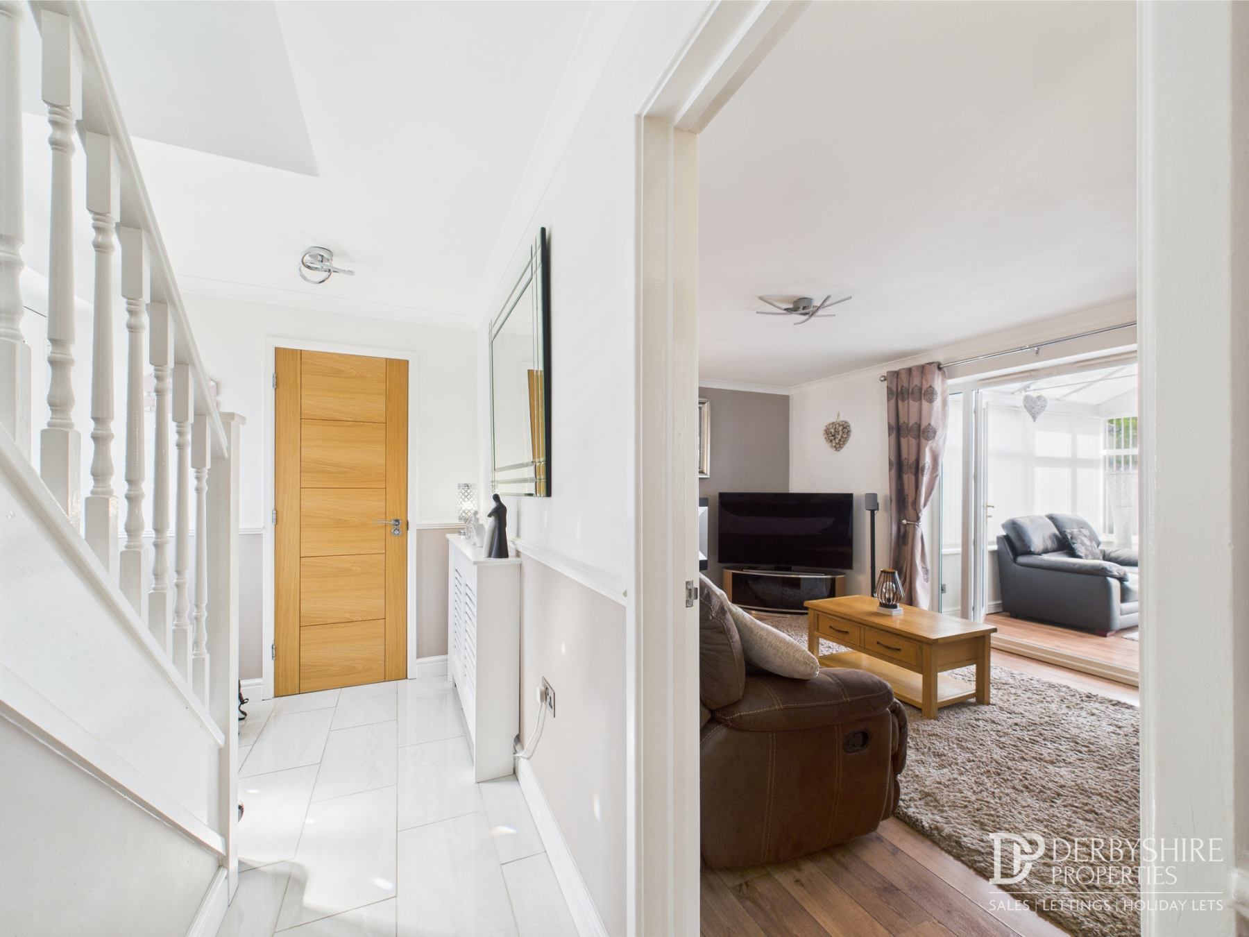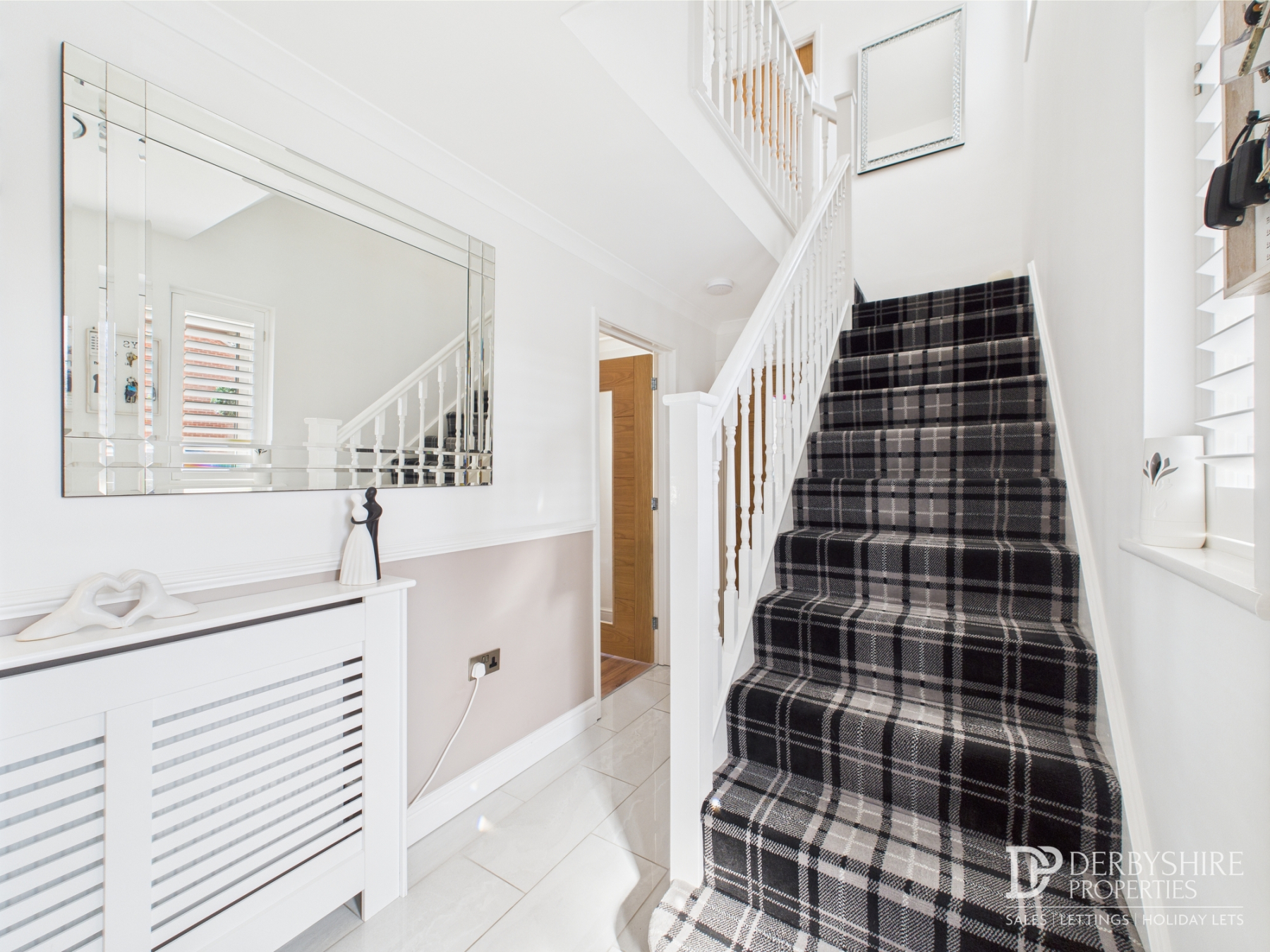Accessed via composite door to front elevation with porcelain tiled flooring, understairs store cupboard, carpeted stairs to first floor, wall mounted radiator beneath decorative cover and doorways to;