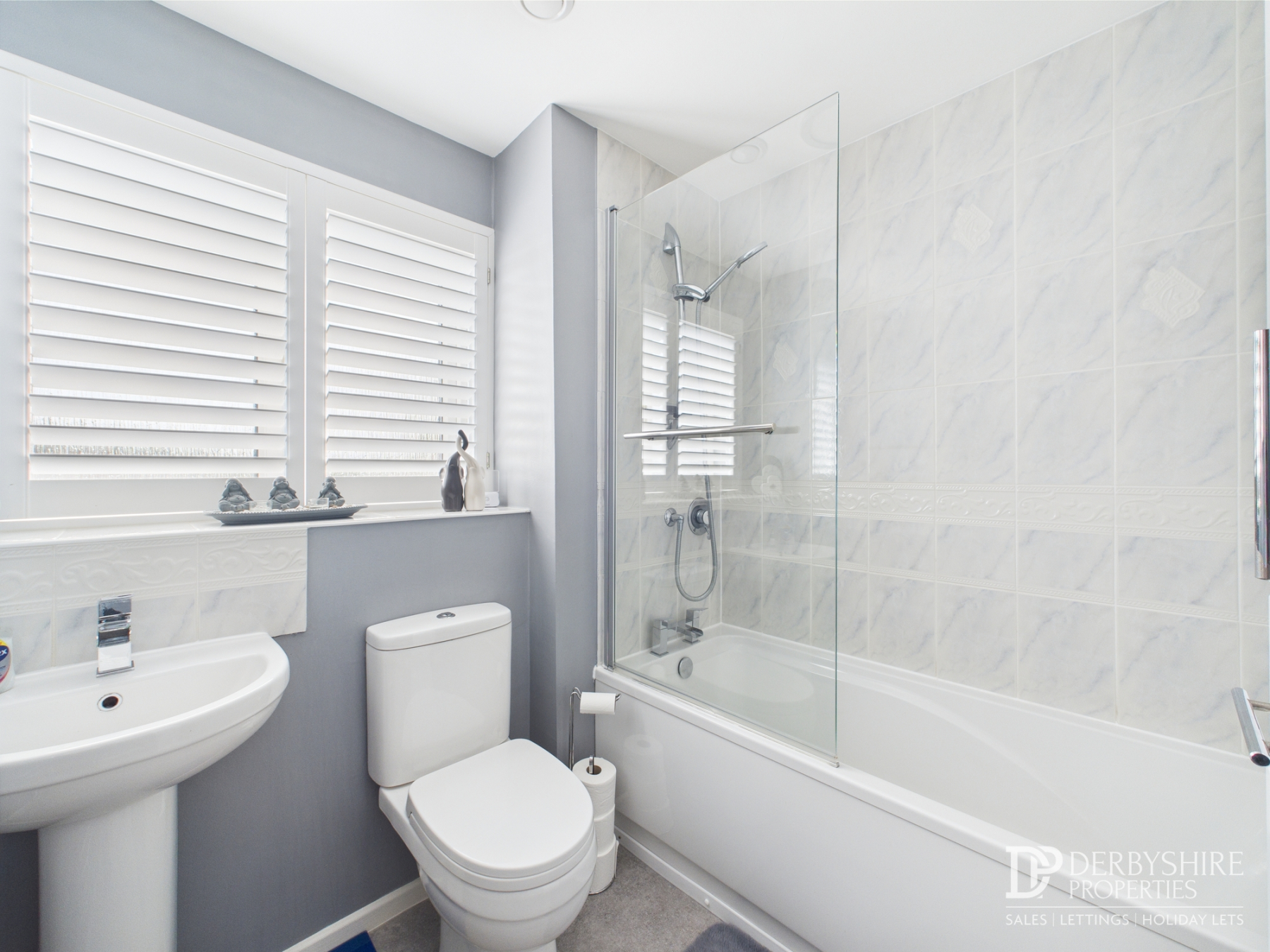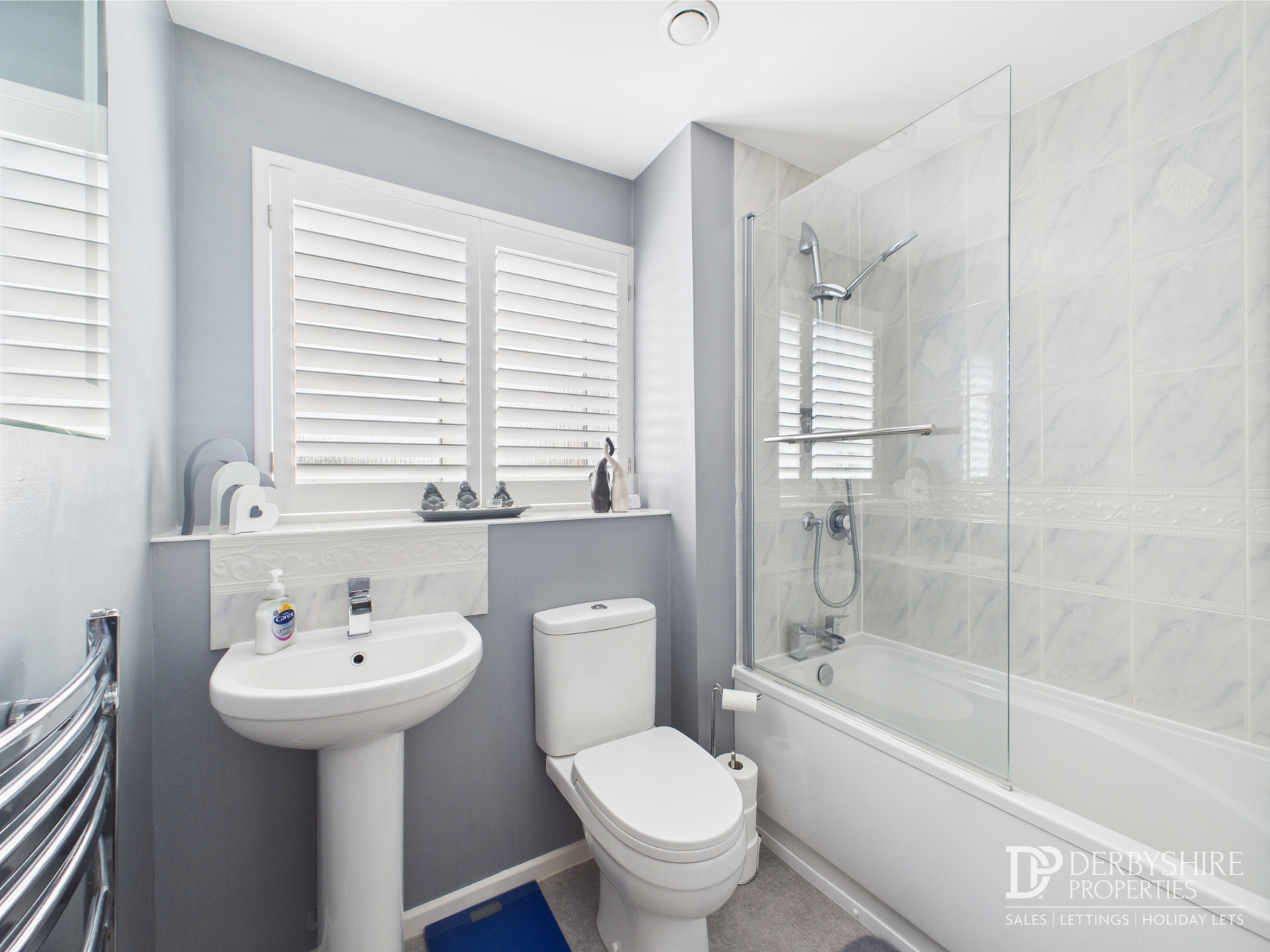 A tiled three piece suite comprising; Bath with shower screen and attachment, pedestal handwash basin and low level WC. Fitted cabinet provides storage whilst wall mounted heated towel rail, ceiling fitted extractor fan and double glazed obscured window to front elevation completes the space.