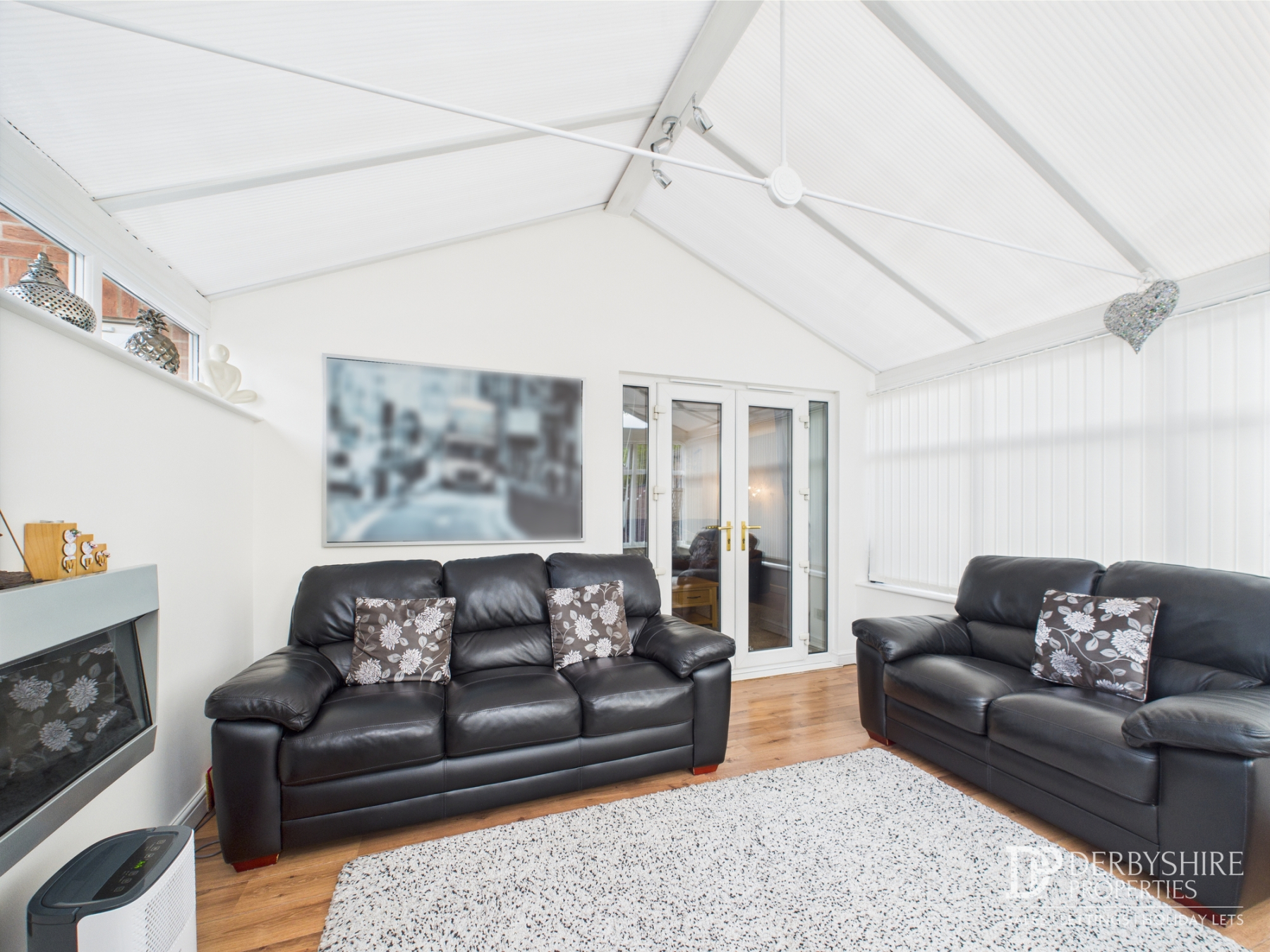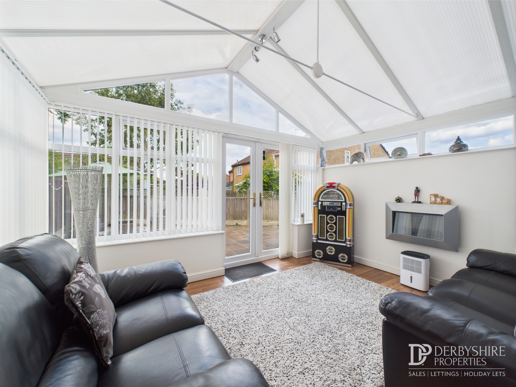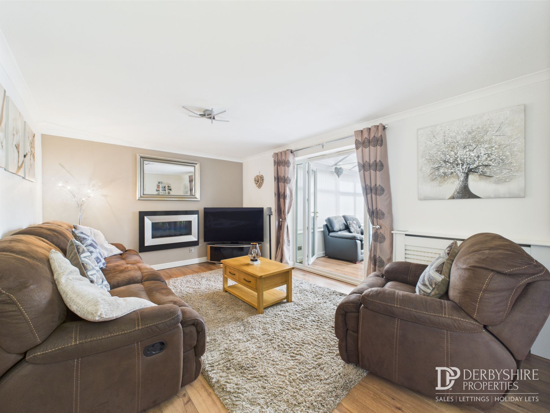 UPVC double glazed Conservatory with double glazed French doors accessing rear enclosed garden, wall mounted electric fireplace and wood effect flooring throughout.