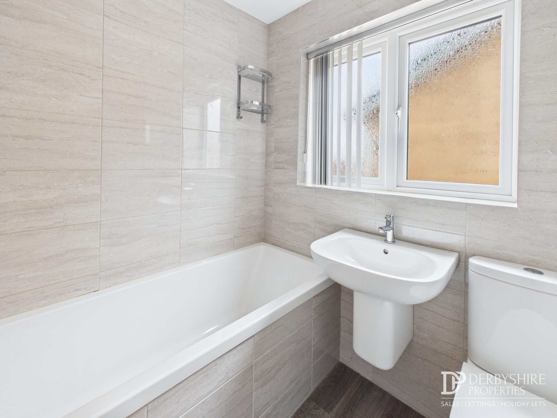 Recently refitted with a modern white suite comprising a low flush WC and vanity wash basin with useful cupboard beneath. There is modern tiling to the walls, a wall mounted Chrome towel rail, a wood grain effect floor and a window to the front.